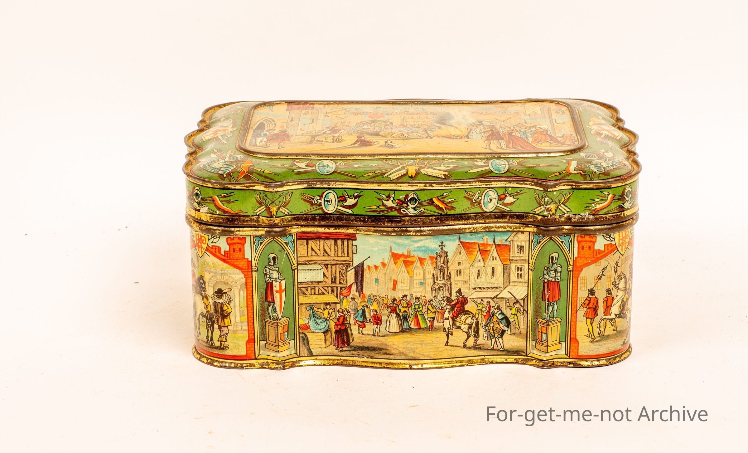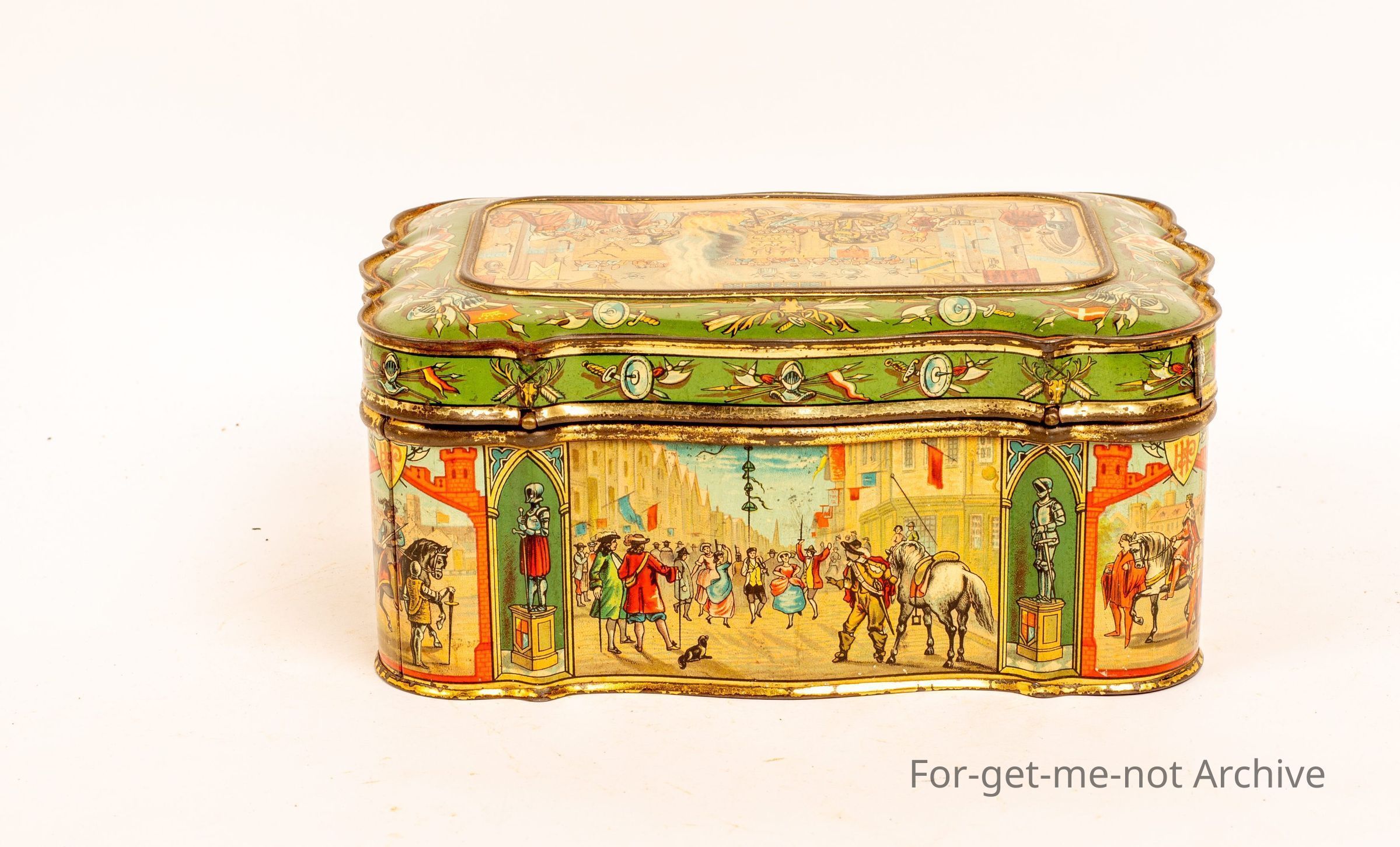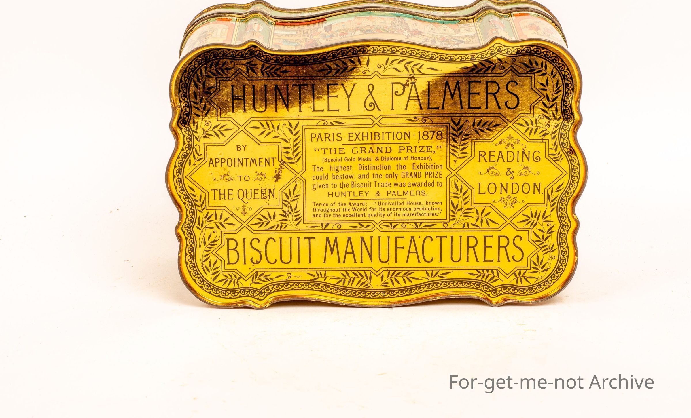Huntley and Palmer tin featuring town high life in the scenes, English, 1880's tin in near mint condition