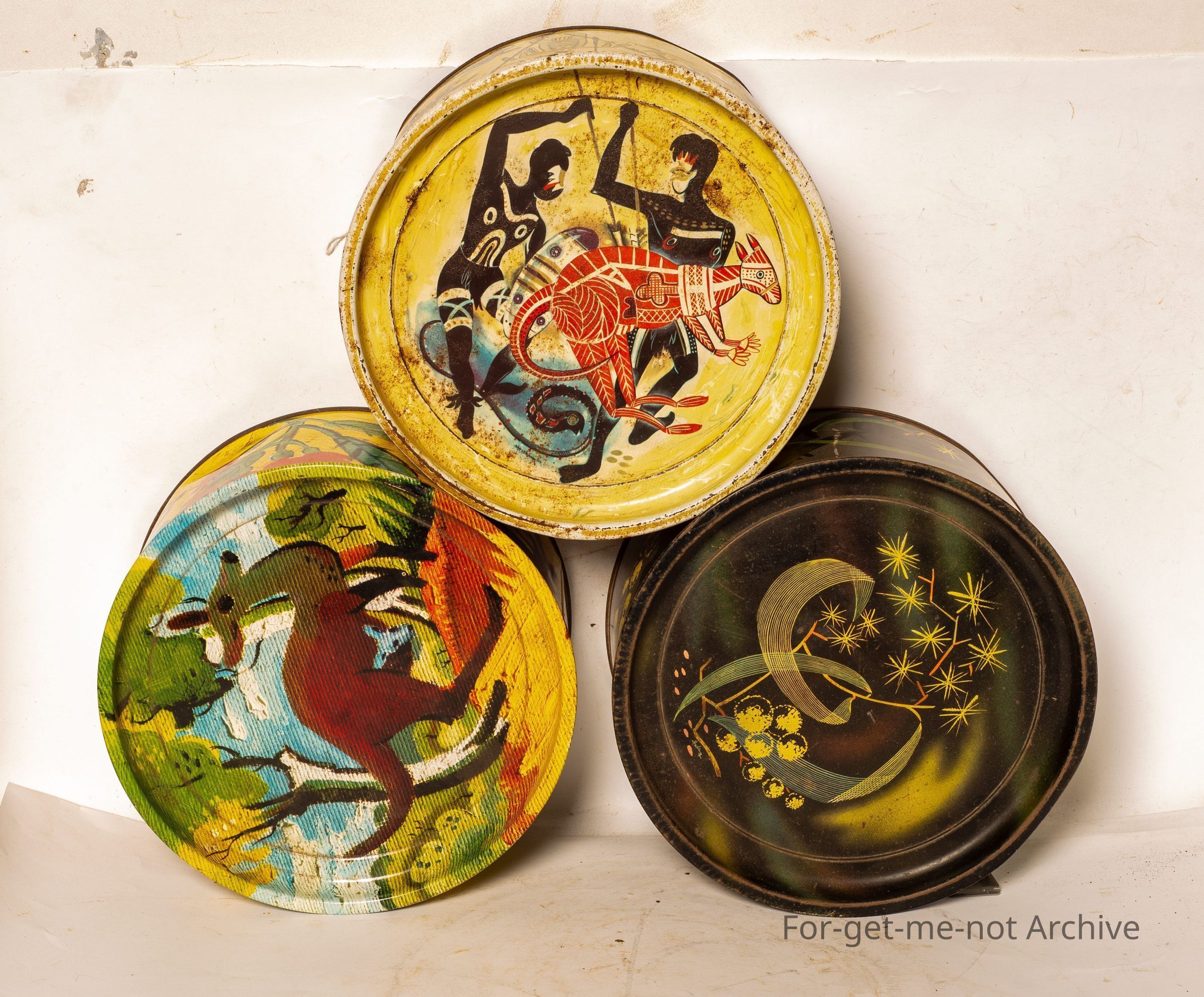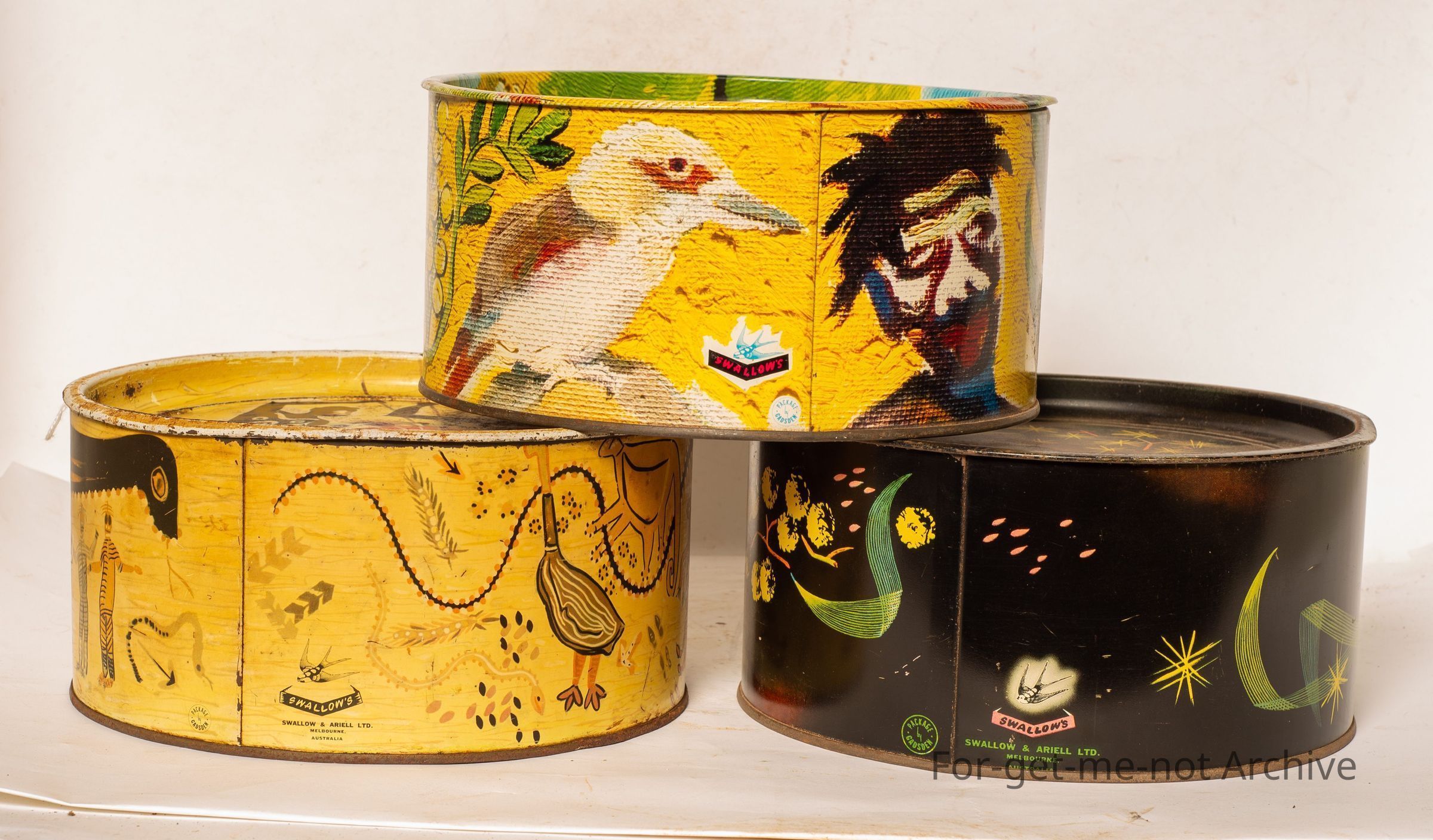 3 biscuit tins. These 3 tins were commissioned by swallow an ariel to be decorated in a pattern done by Doyle Howlett. This was done by the artwork was done by Doyle Howlett. The 3 different tins are Australian fauna and flora, aboriginal, and a silver wattle as our national plant. These tins were manufactured by Gadsden. These were put these series of tins were done in 1957.Collection