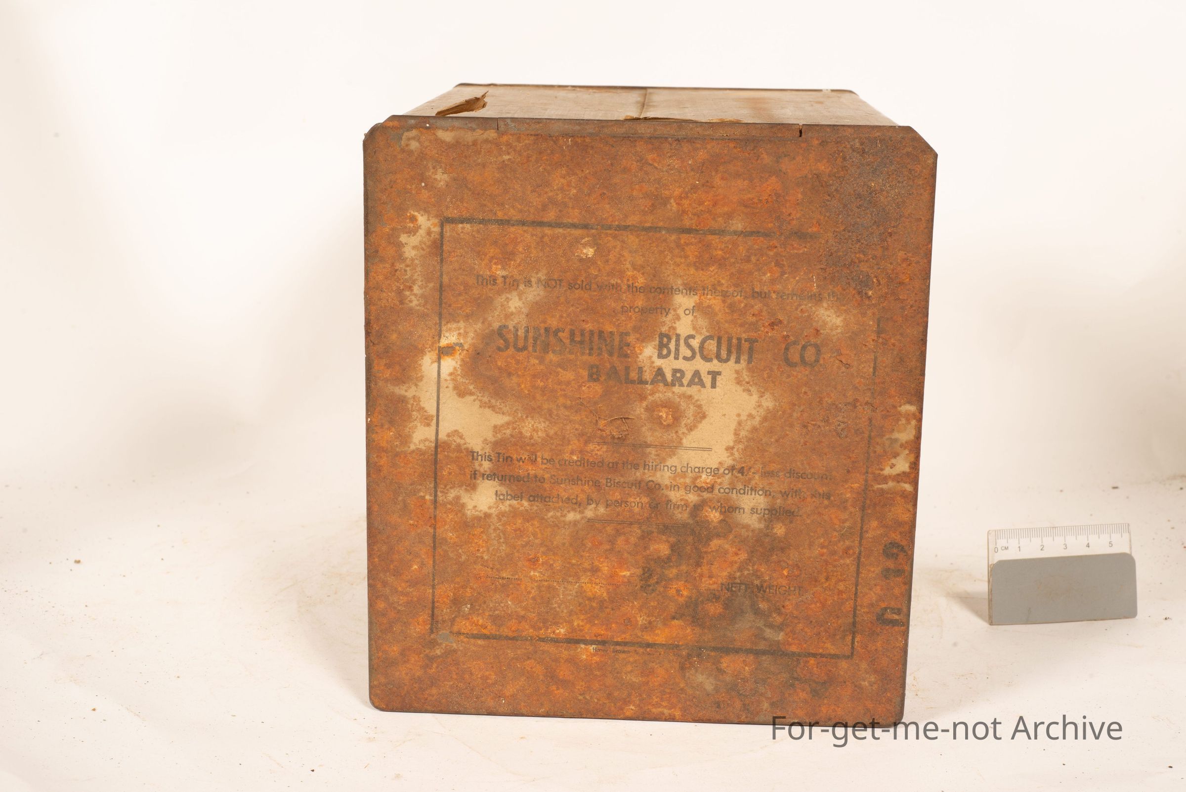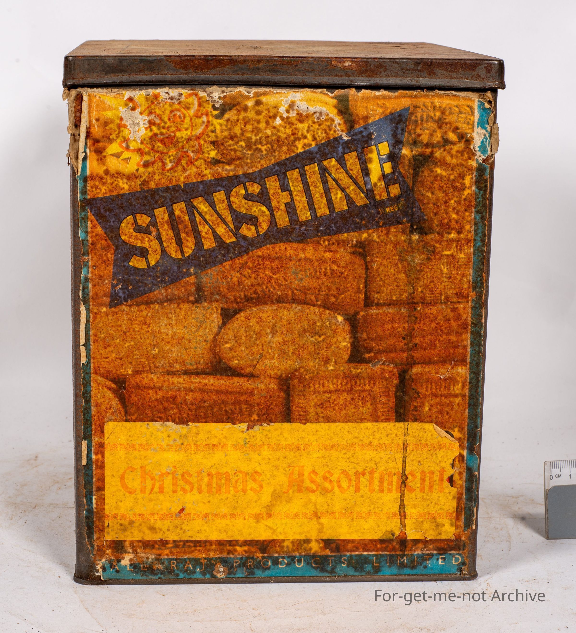 This is a large square biscuit tin from Sunshine Biscuits Ballarat. Paper label, pretty in just average condition. Contents of the sunshine tin is Christmas assortment. The tin has a not sold but hired with a credit on its returnCollection