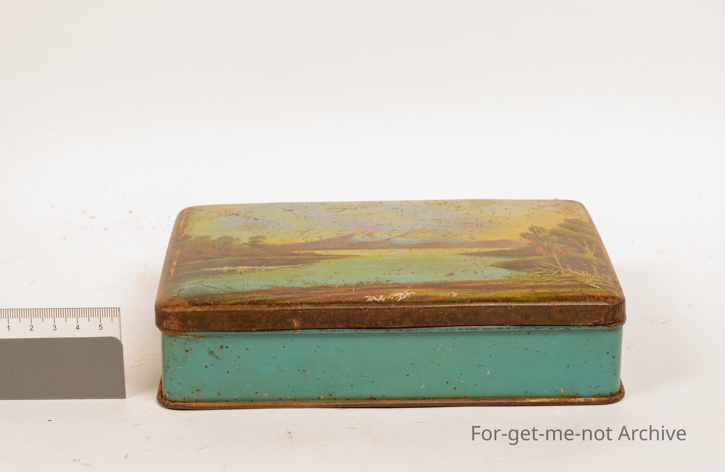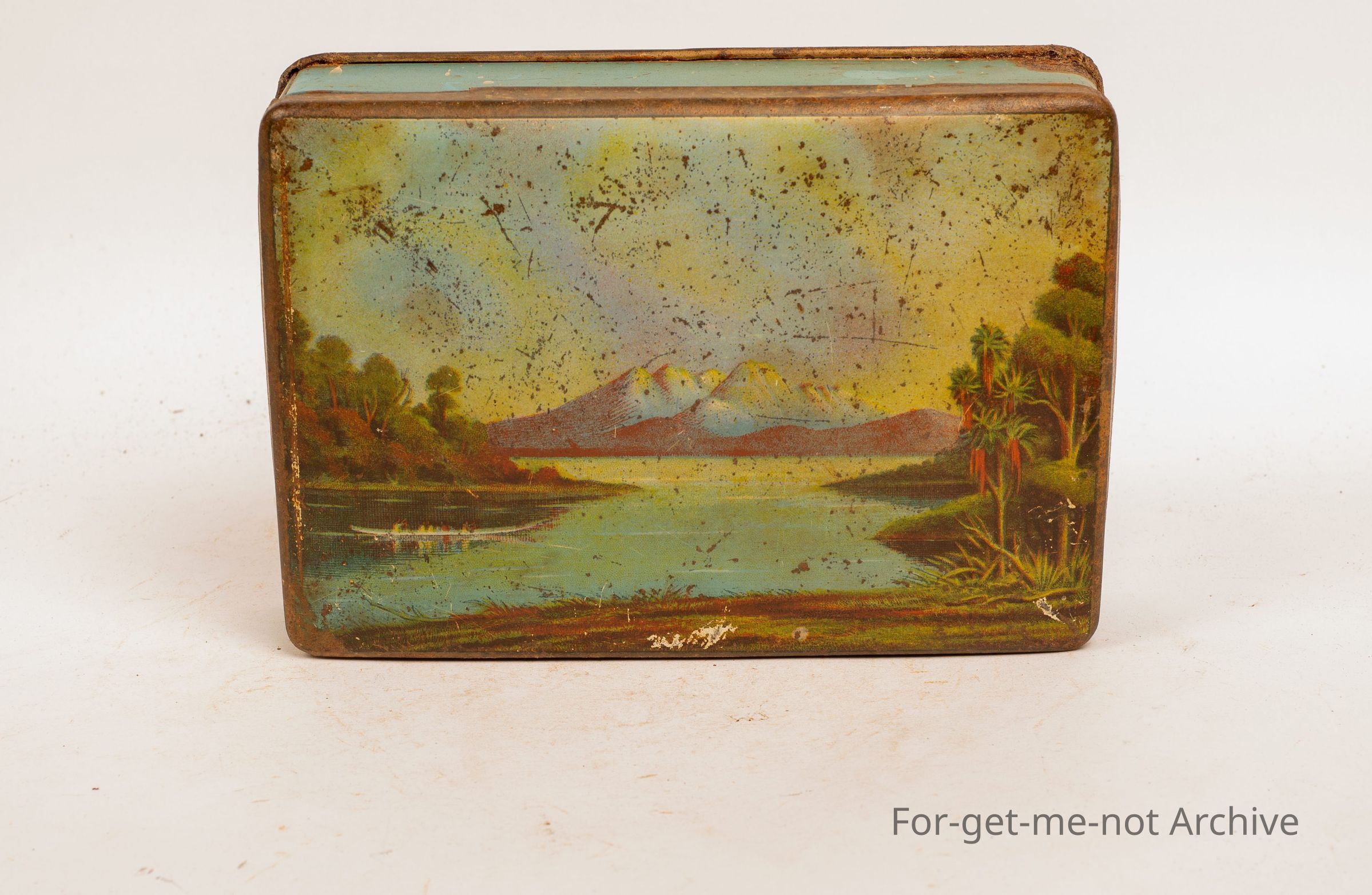 Biscuit tin from Sunshine Biscuits Ballarat. Rural scene on the front of lake with hills.