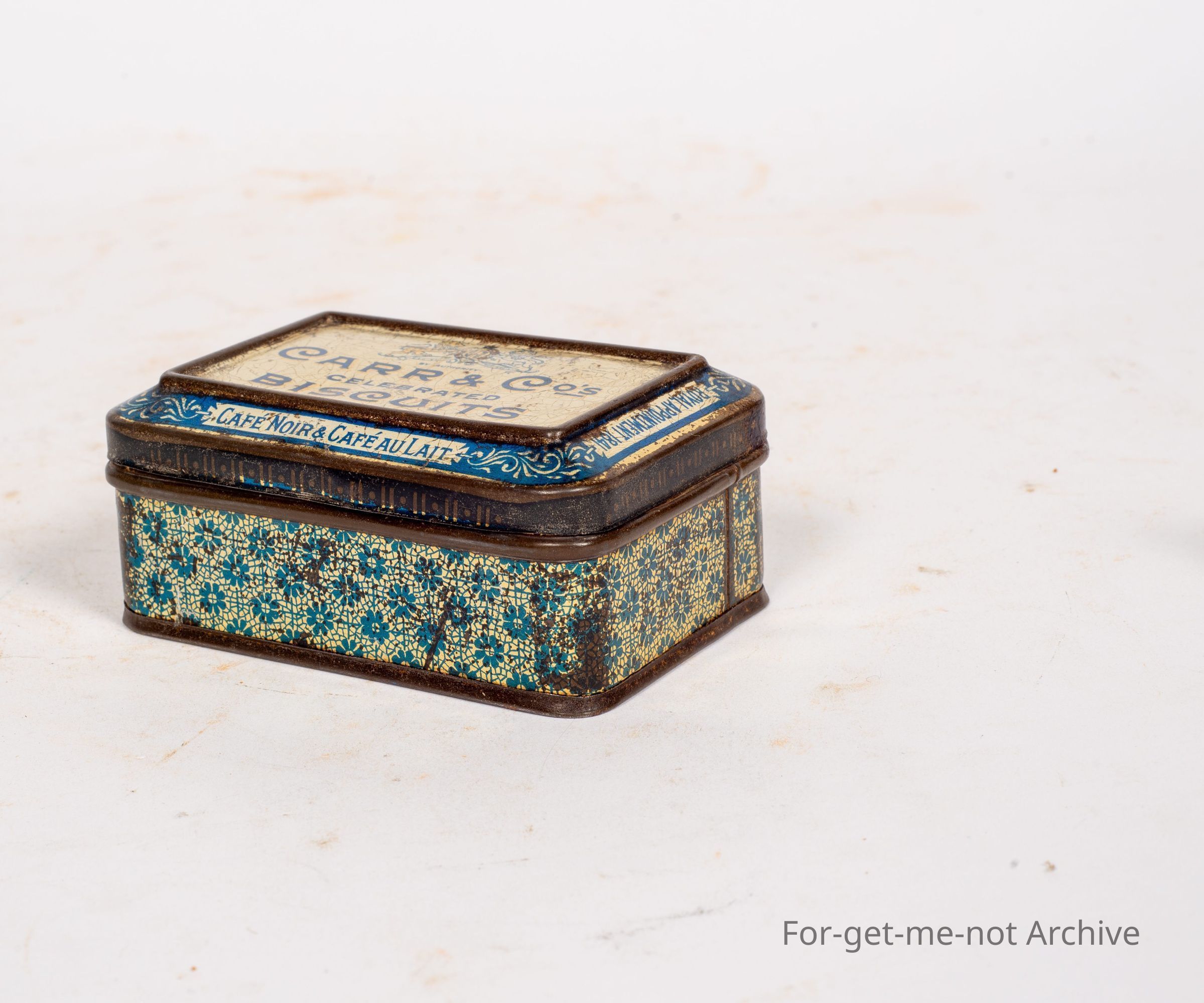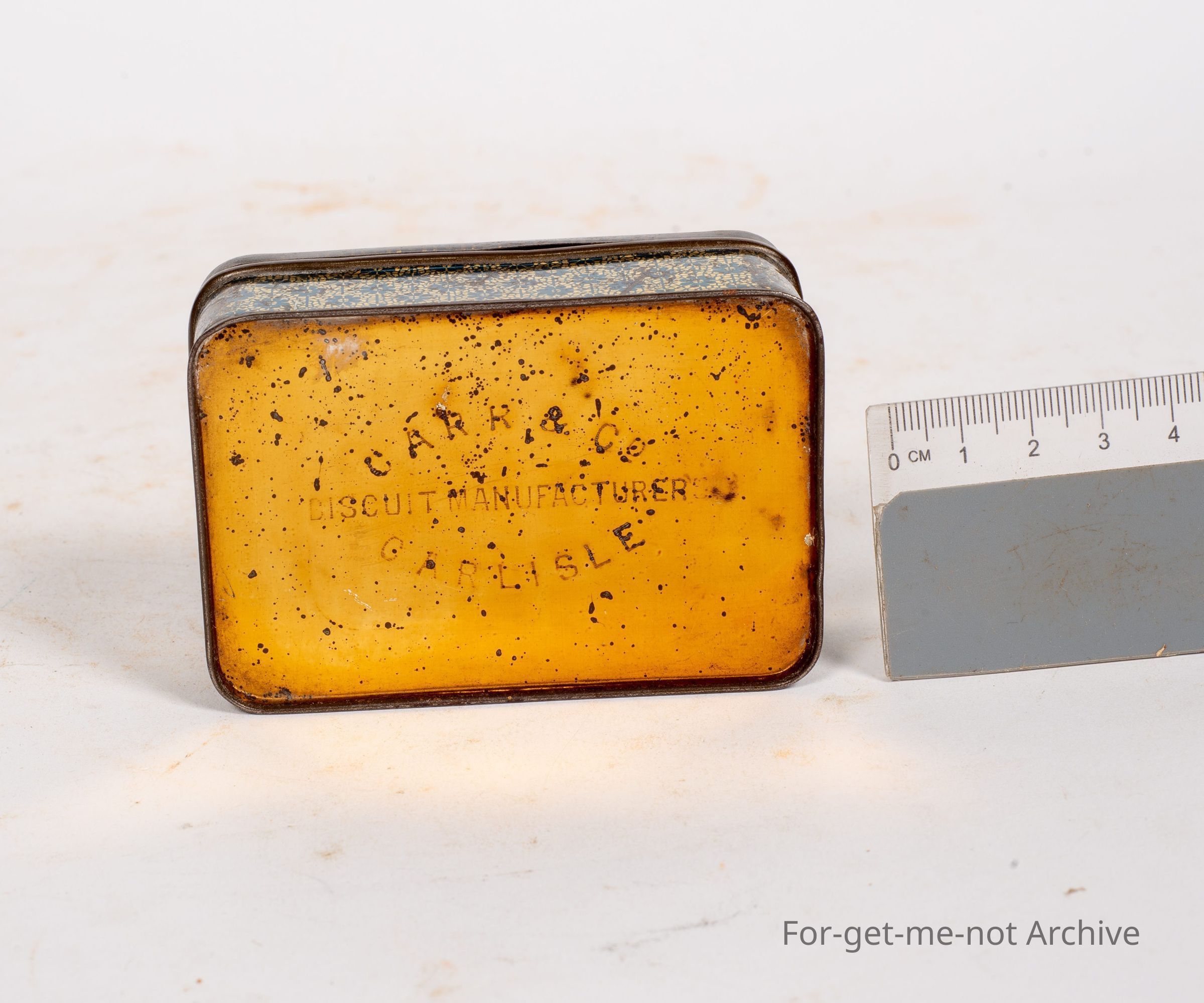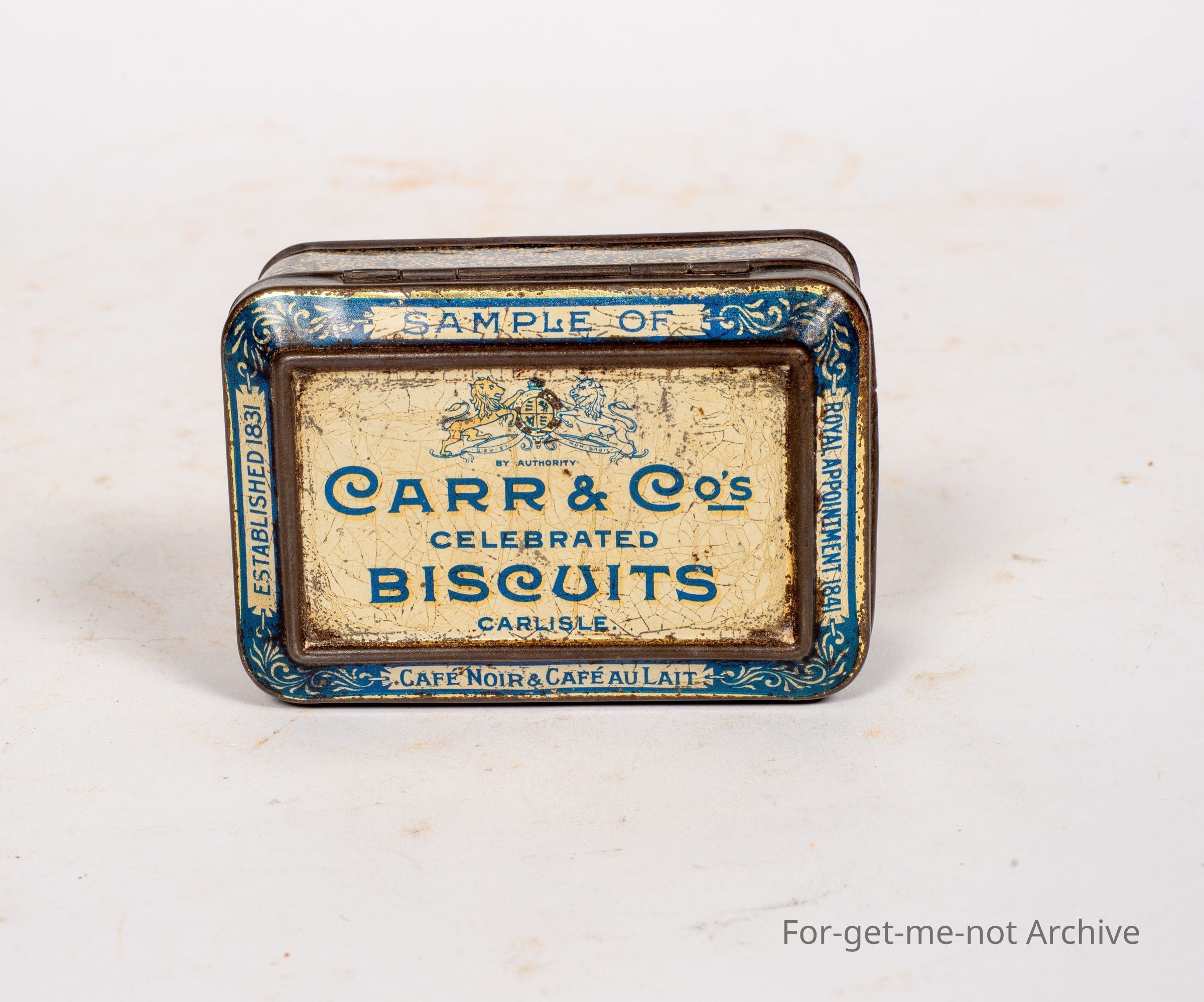 Beautiful little tin sample of Carr and Co celebrated biscuits, Carlisle. Coat of arms, various condition, this tin, embossed on the back, Carr and Co Biscuit Manufacturers Carlisle,Collection
