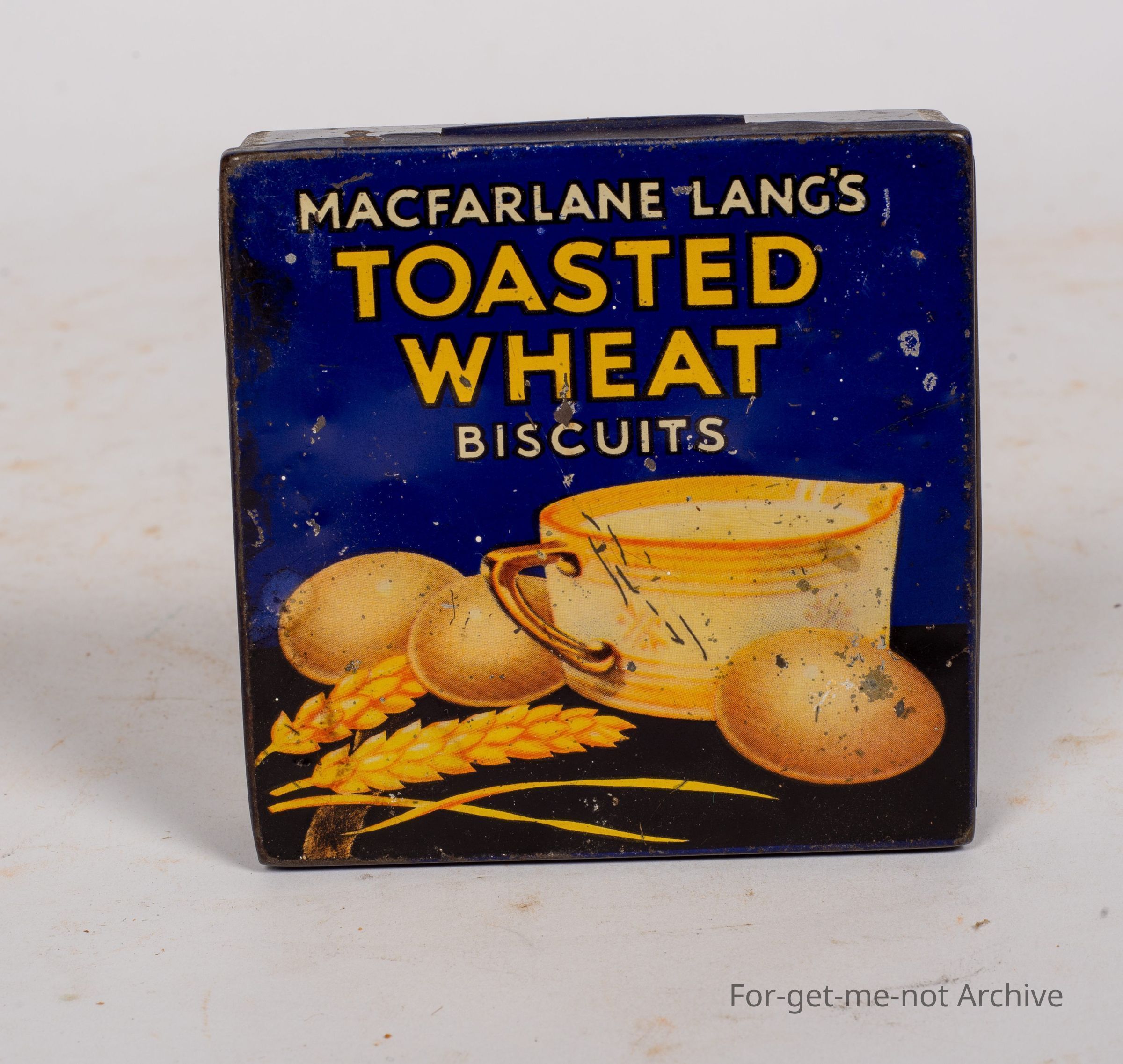 Sample tin of Macfarlane and Lang's toasted wheat biscuits. Nice graphics of wheat, eggs, and milk on the front. Has sample written on the back. Quite good order.