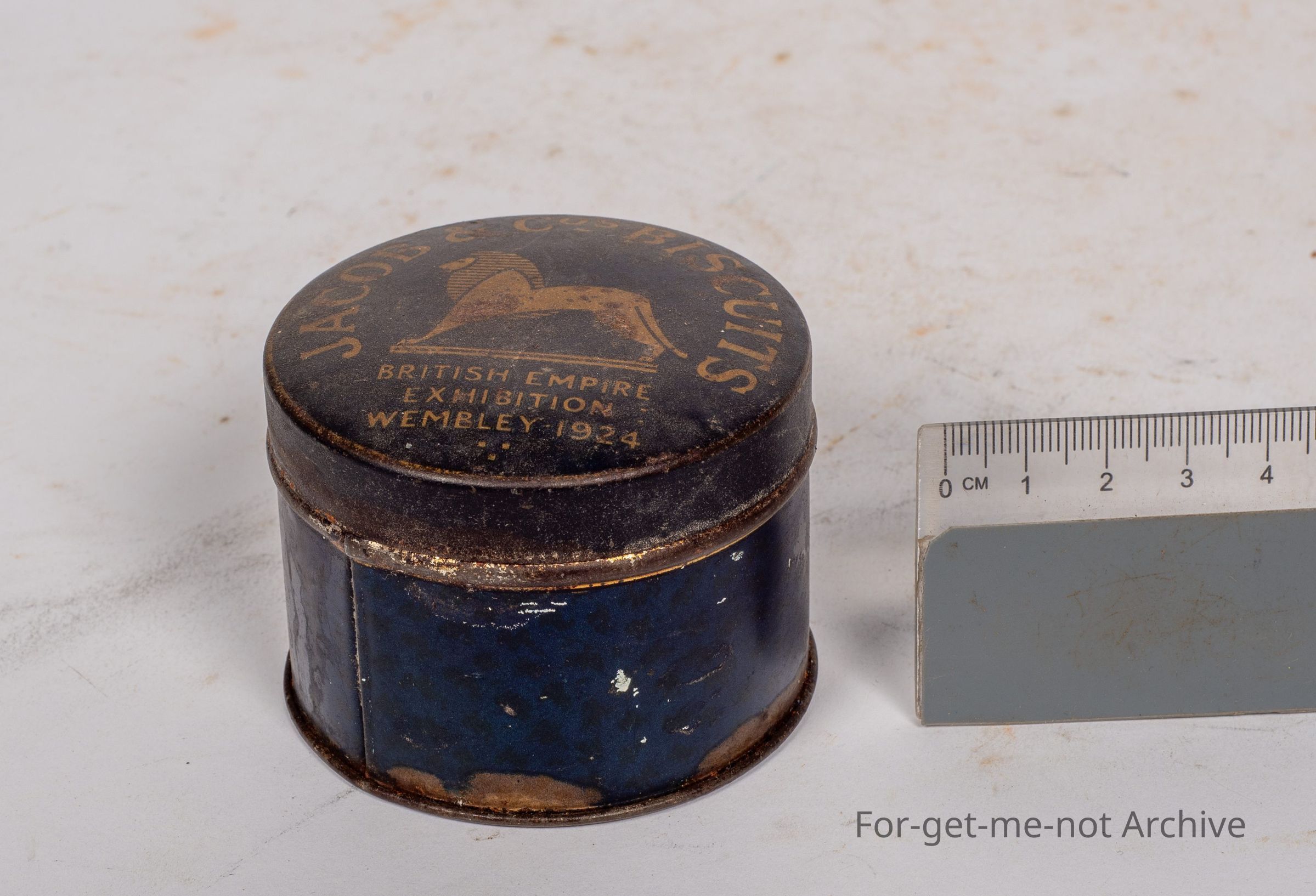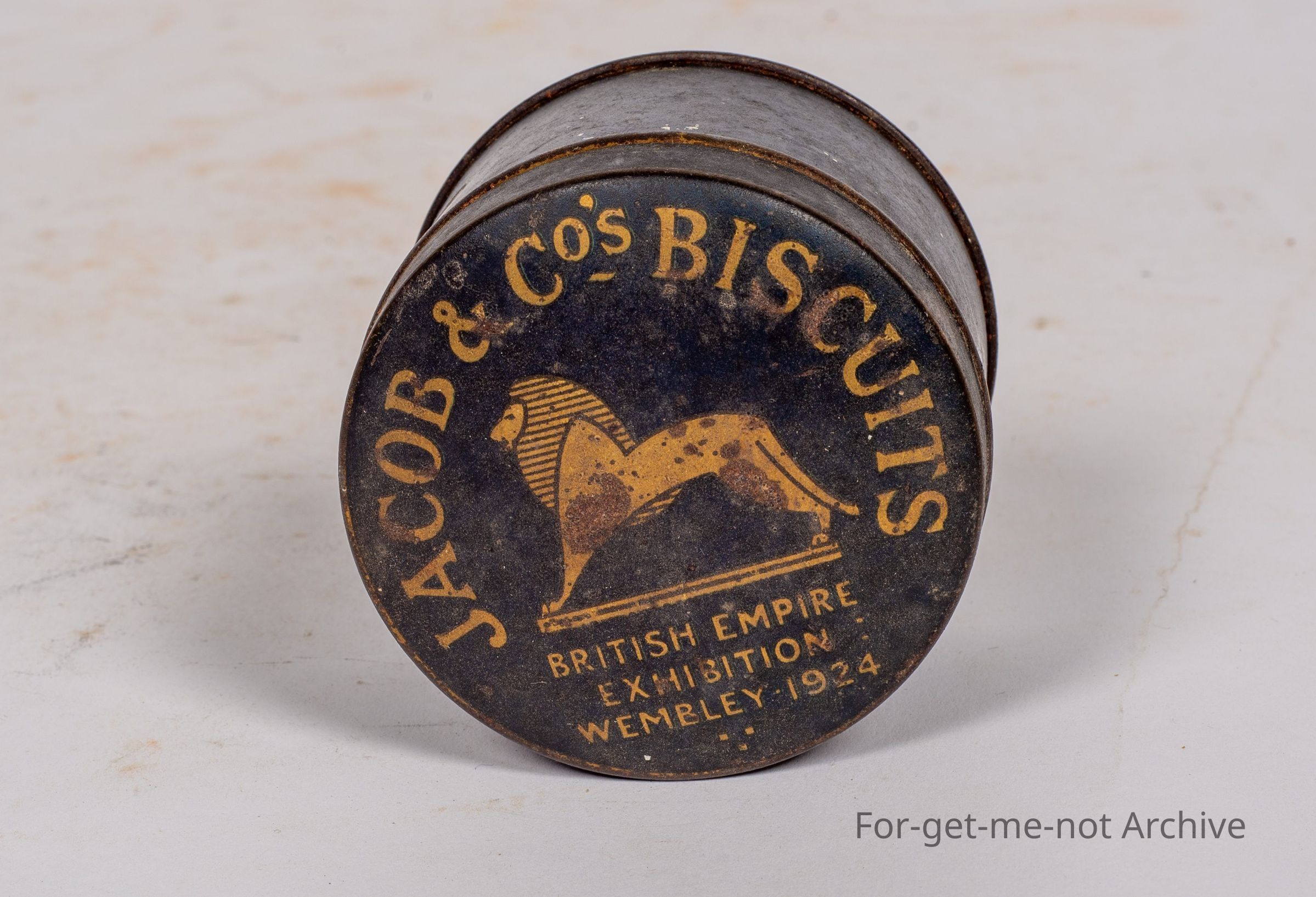 Is a tin of Jacobs and Co's Biscuits. British Empire Exhibition, Wembley, 1924. Image of a lion. This is a sample tin, quite good condition.