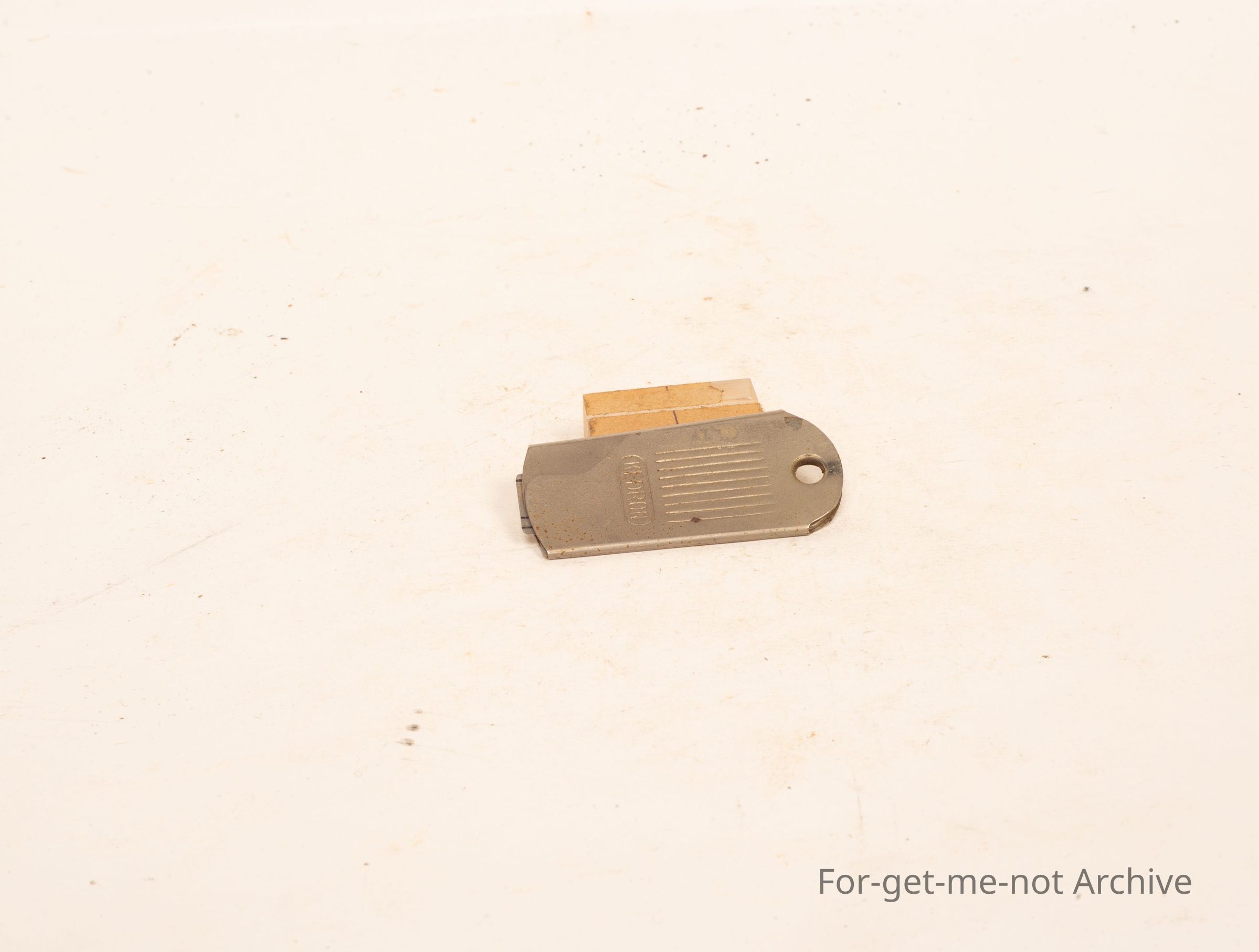 Is a small, fold away razor the keyring size unit unfolds to become a razor blade. Perhaps as a travel razer The cover folds back over it for protection. Stamped Kedron.