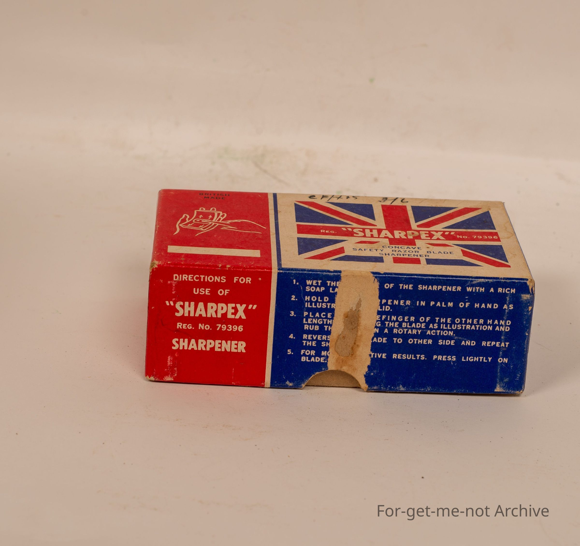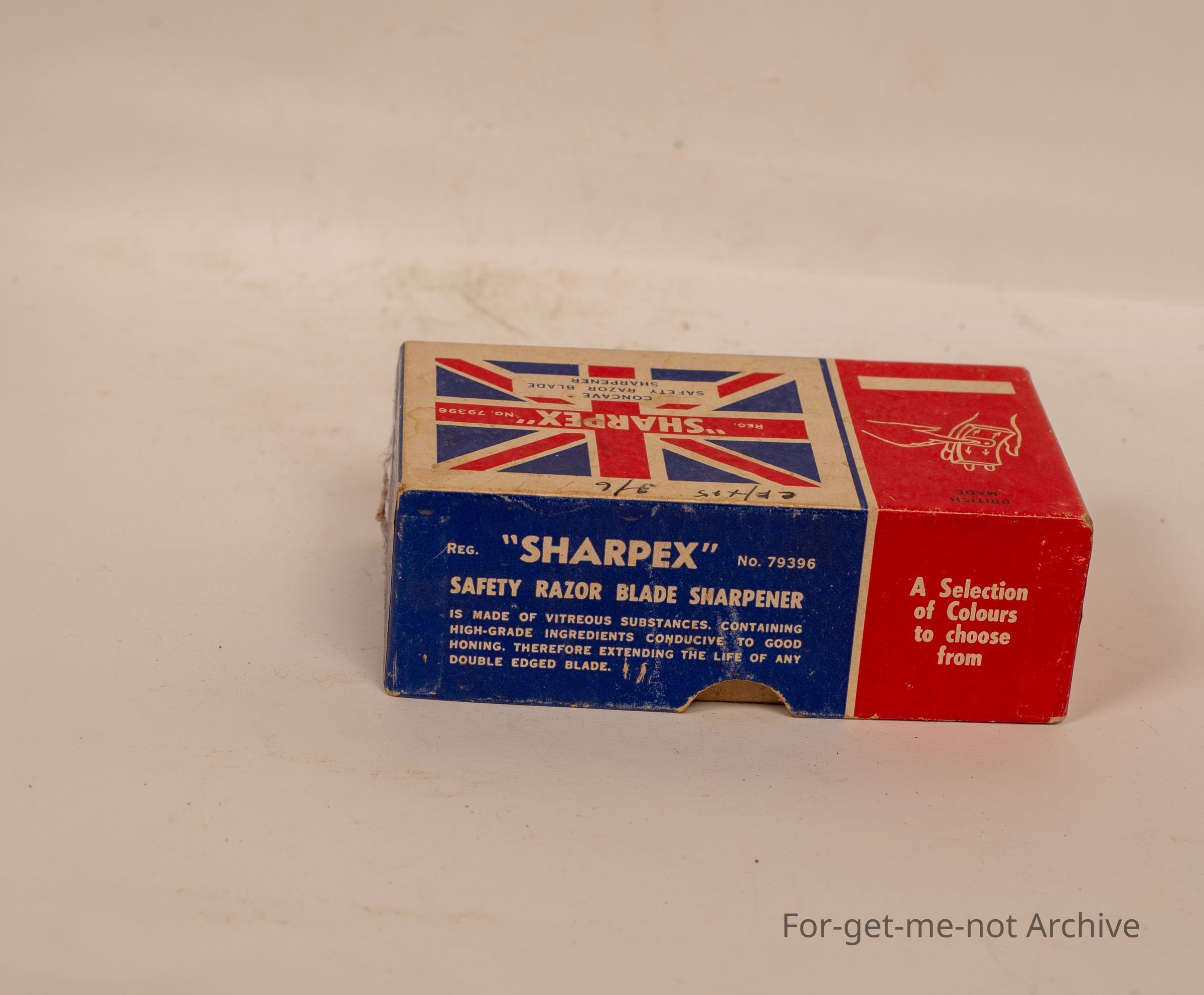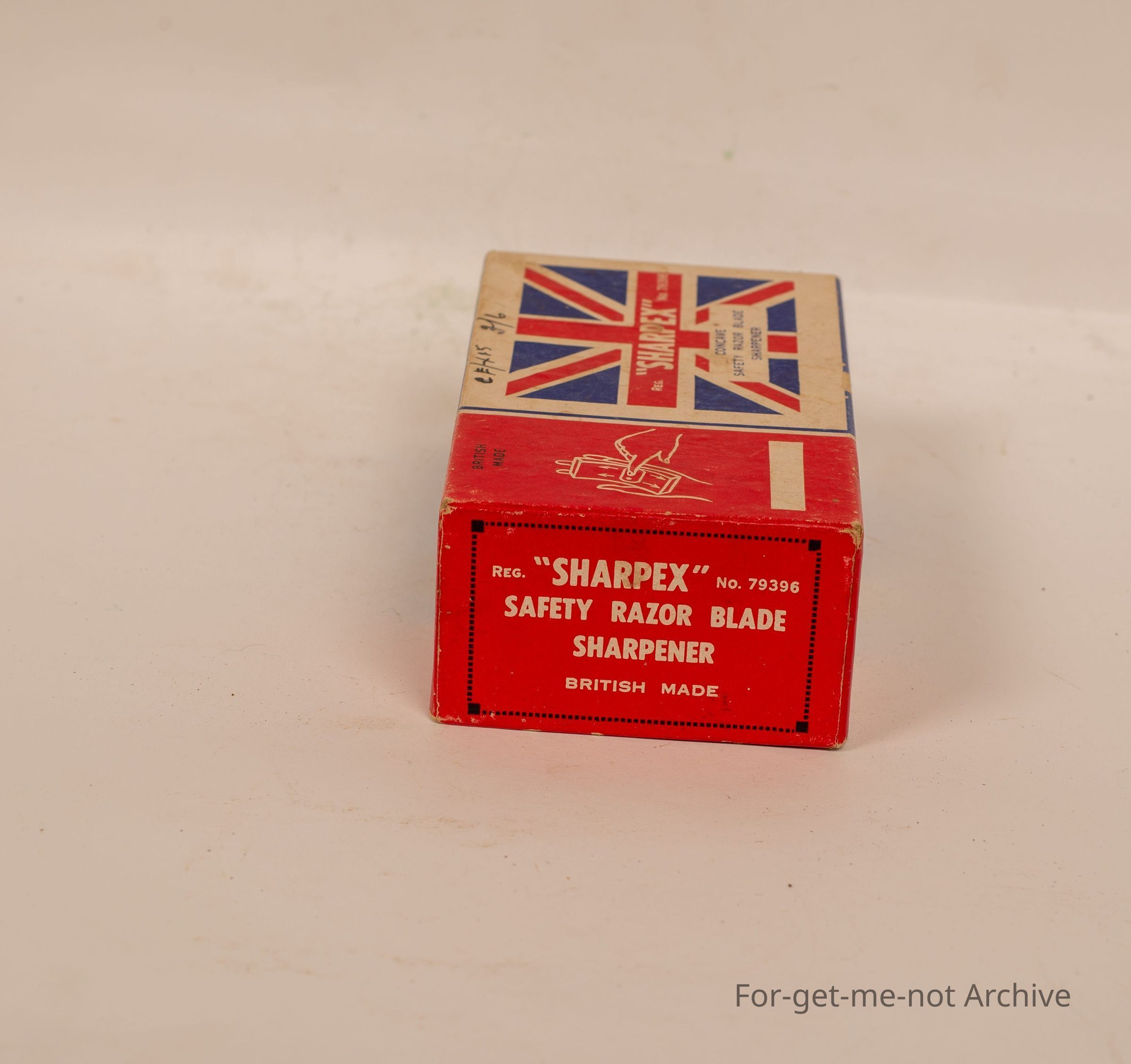 Cardboard box of sharpener called Sharpex Convex Concave Safety Razor Blade Sharpener. Just the box