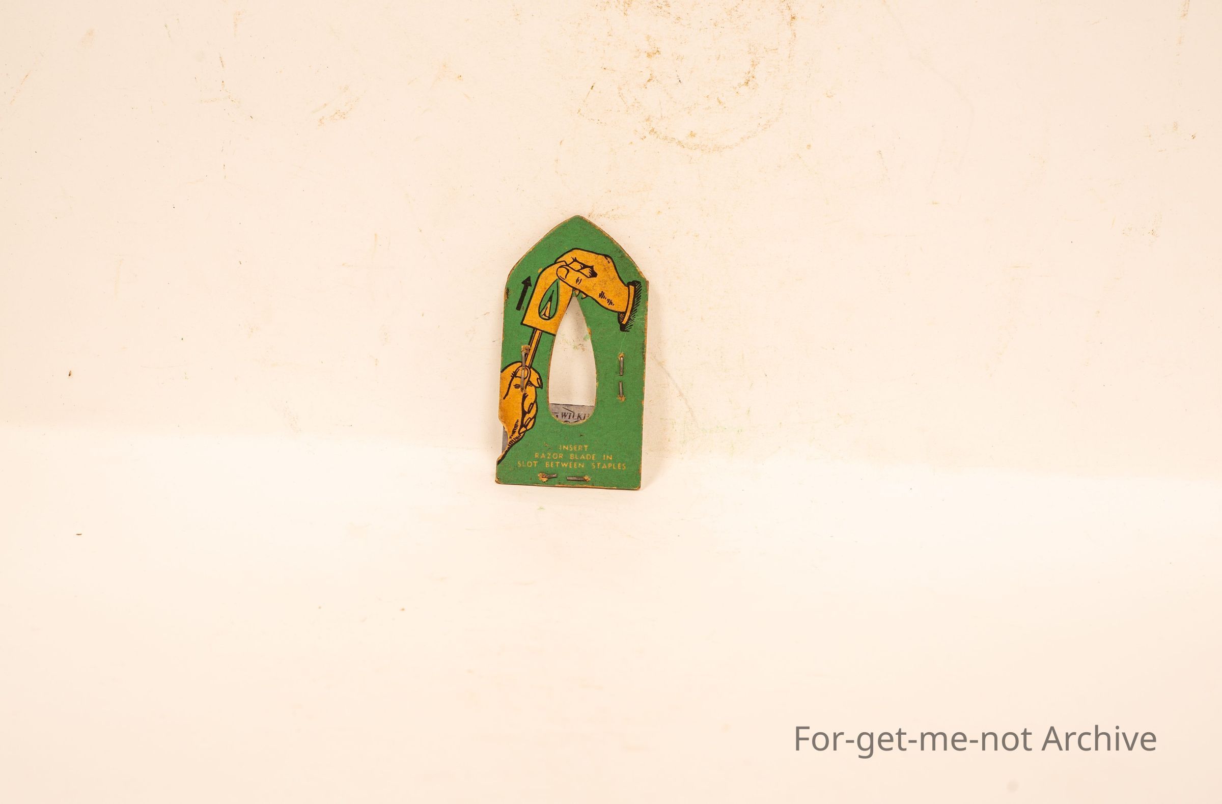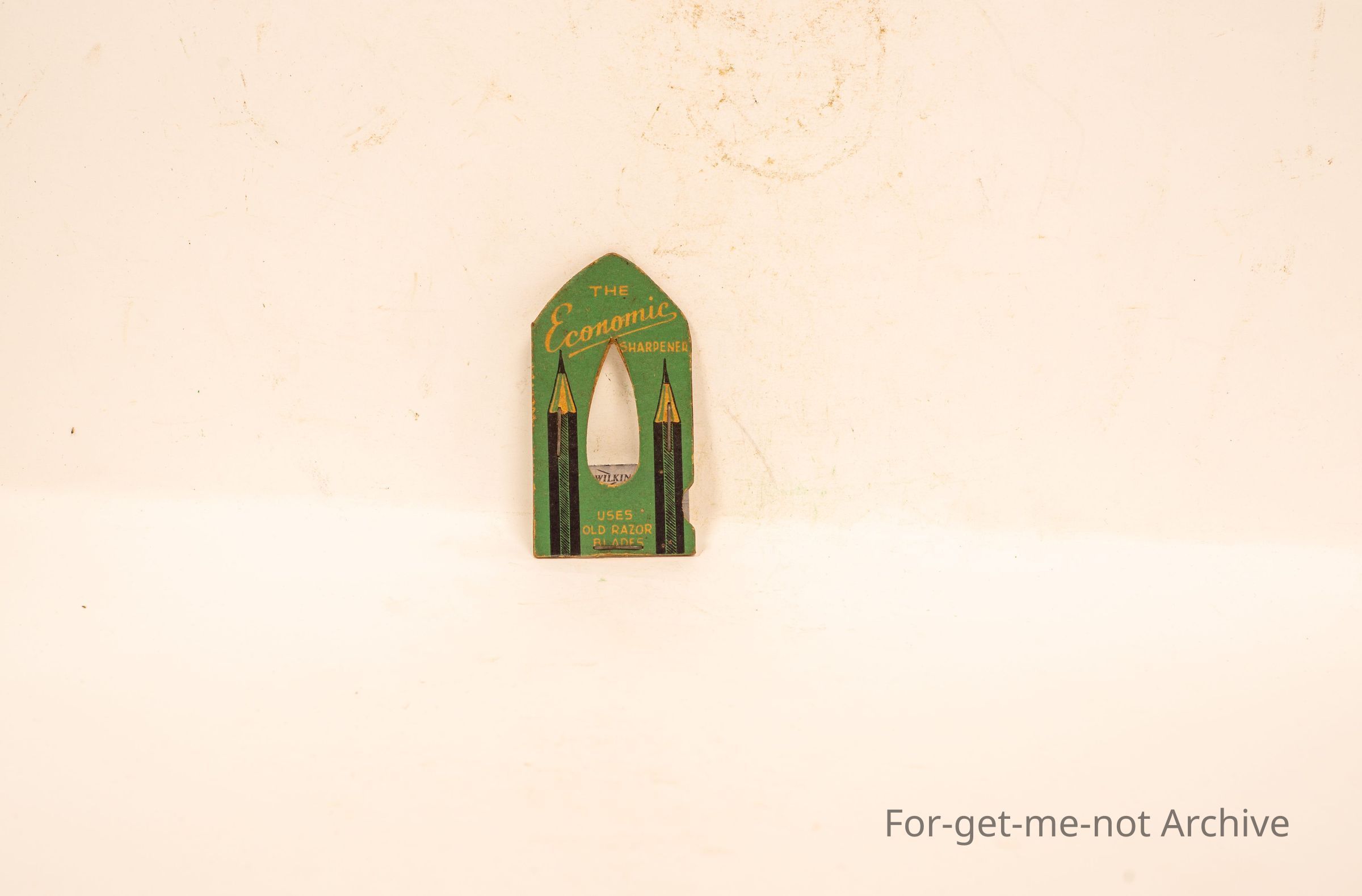 Lead pencil sharpener, called the economic sharpener with the image of 2 pencils. This takes a razor blade to do the sharpening made of cardboard. One of these is not in the Museum of Pens at Gundagai.Collection