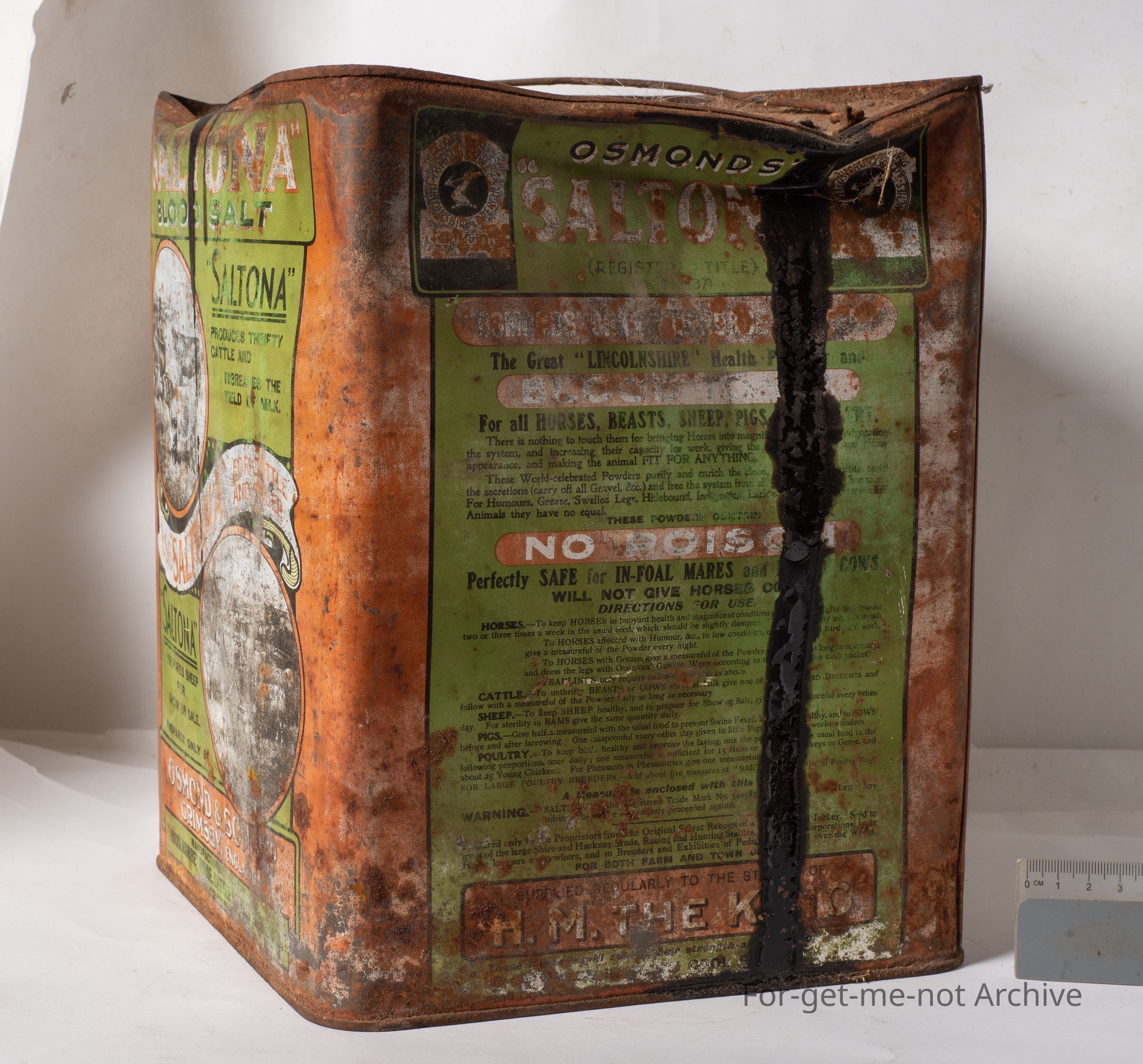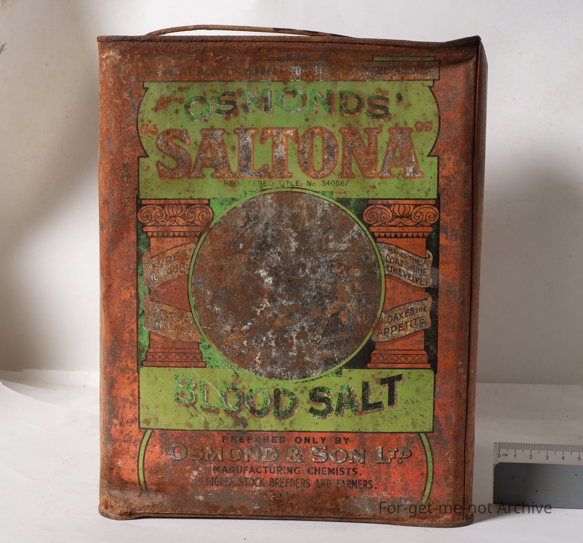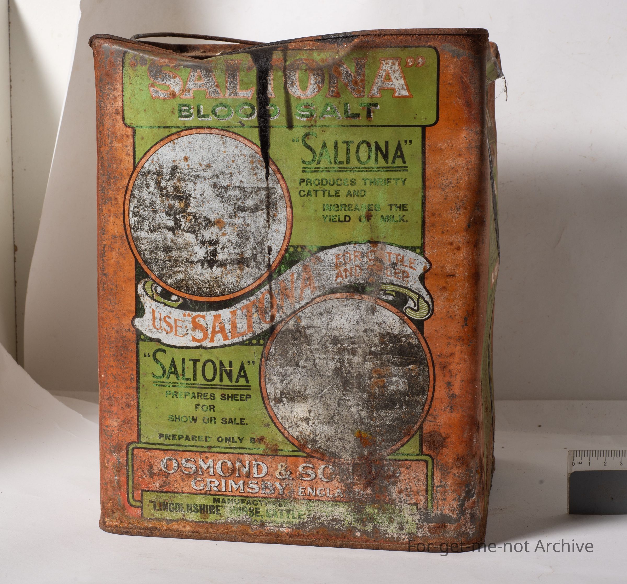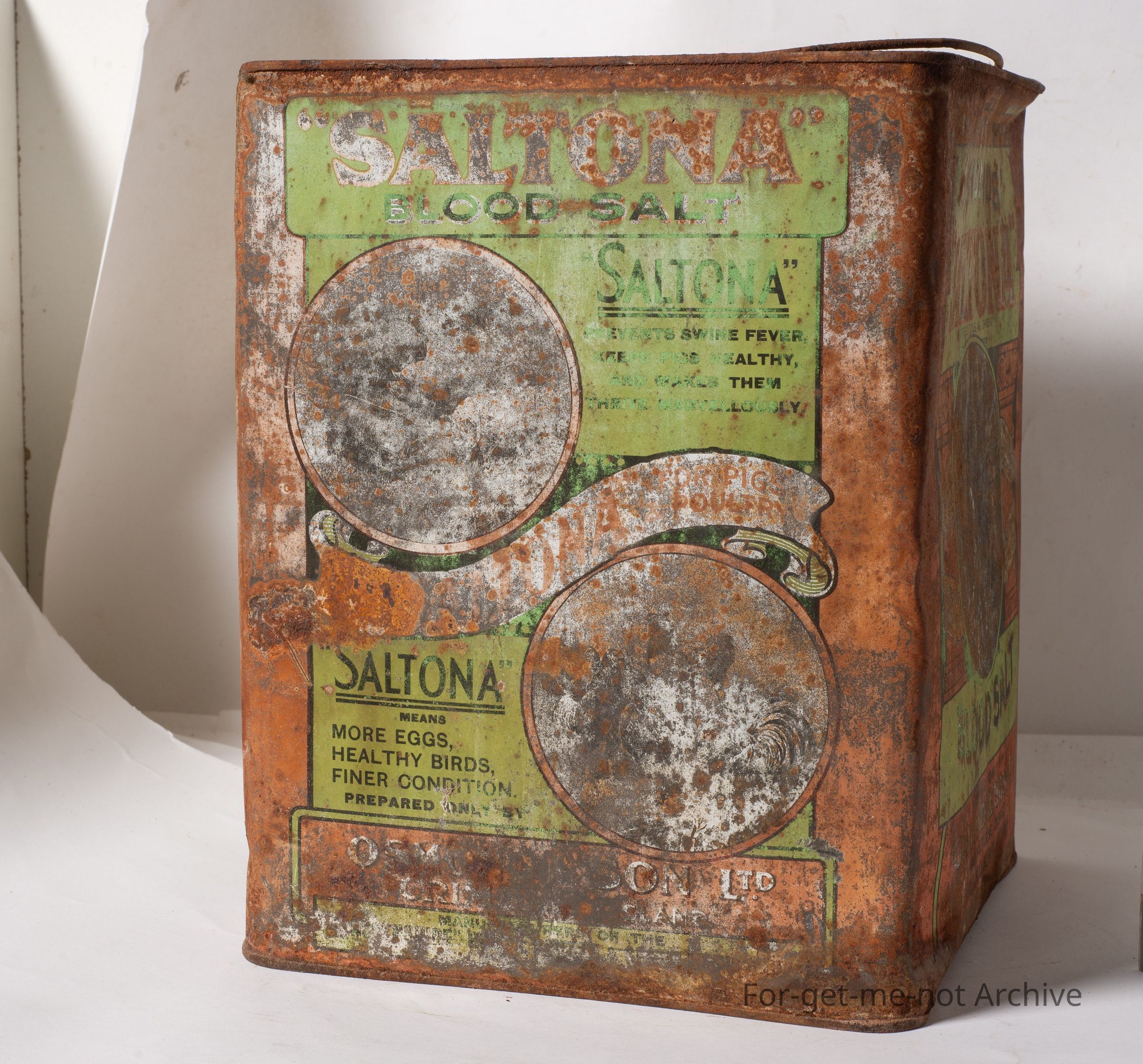 This is a 4 gallon tin of, Saltona blood salt, which was used as a remedy for livestock, horse and sheep, cattle, etcetera. This is a hard tin to find. There is some contents inside it. The condition is pretty down.Collection