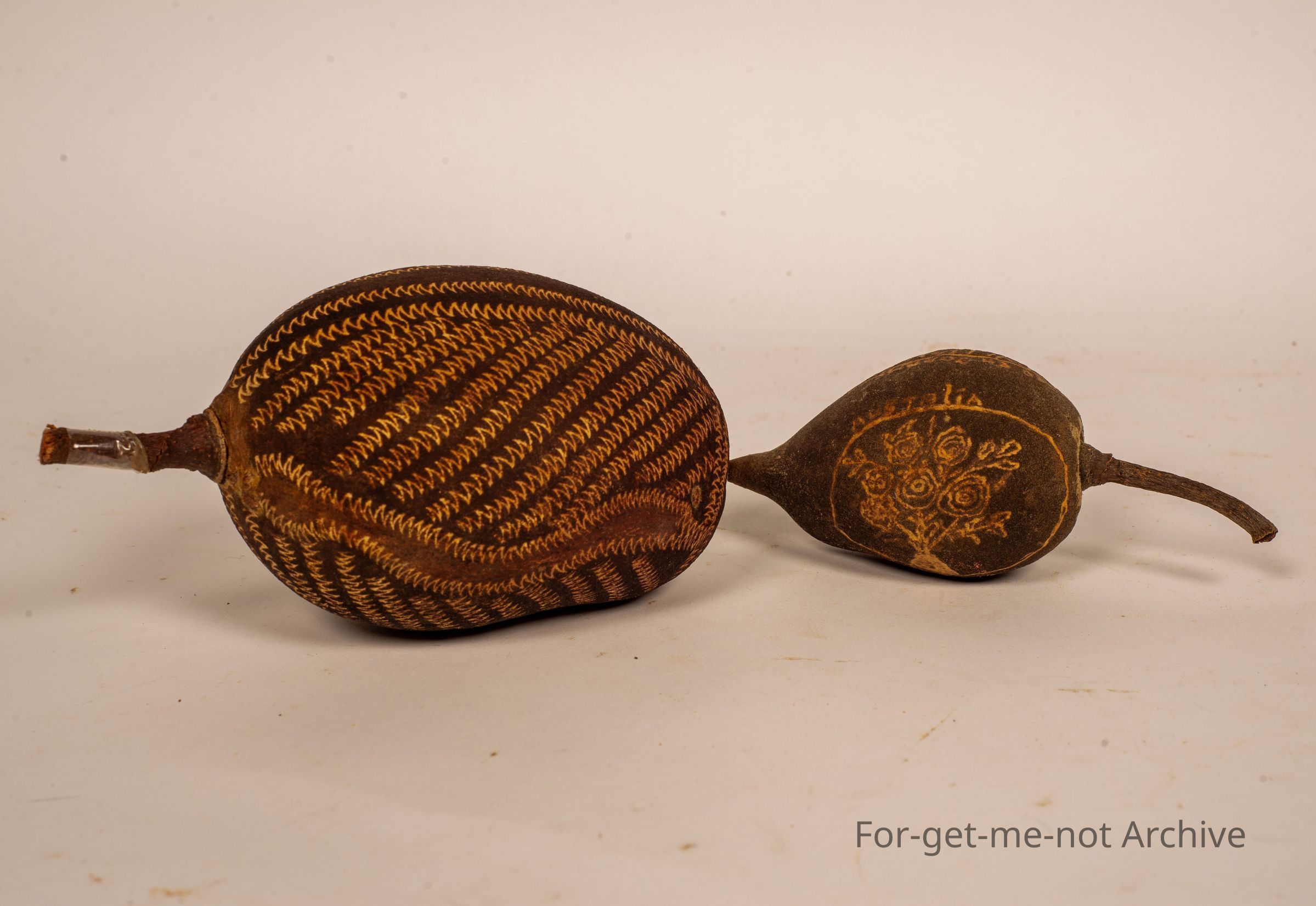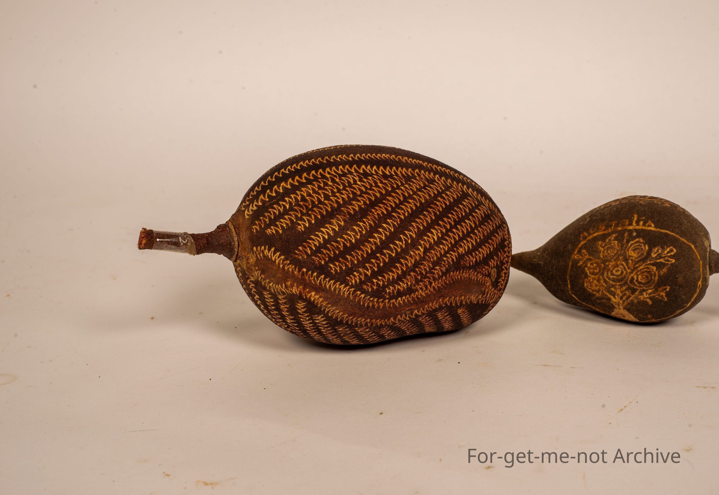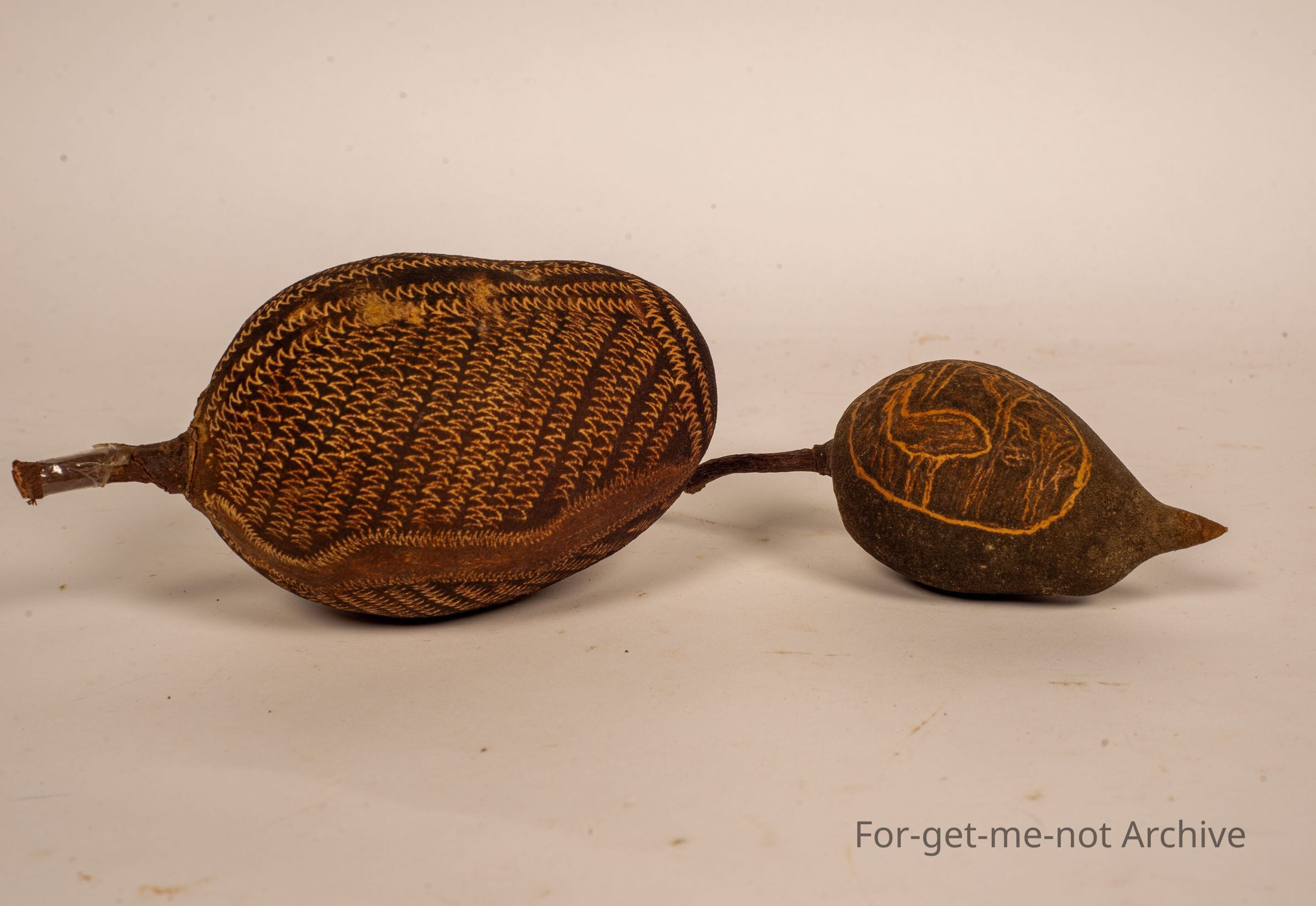 2 Boab nuts. These have been crafted with scratching through the outer surface, with aboriginal patterns and an emu scratched into 1.These are little craft items,