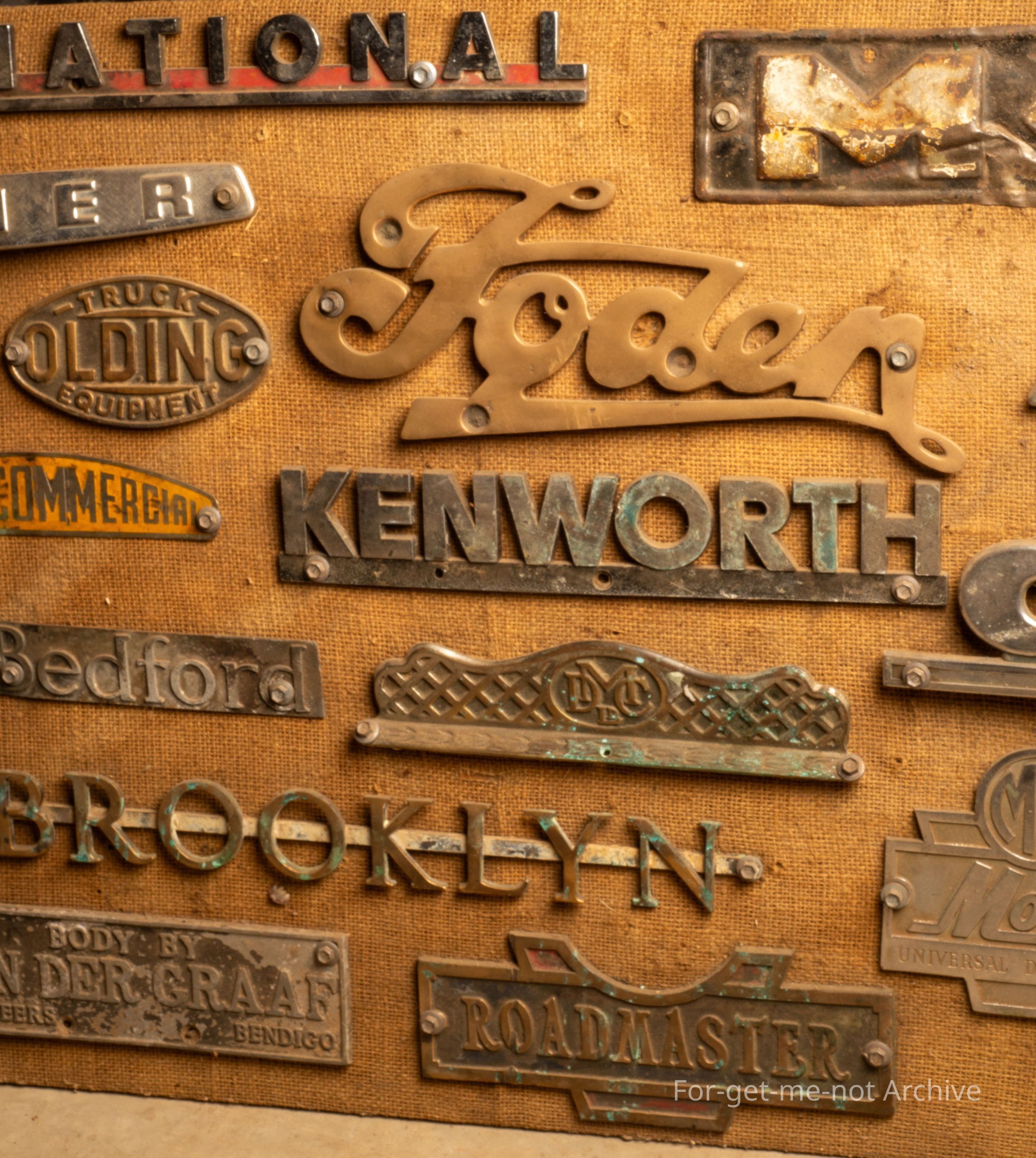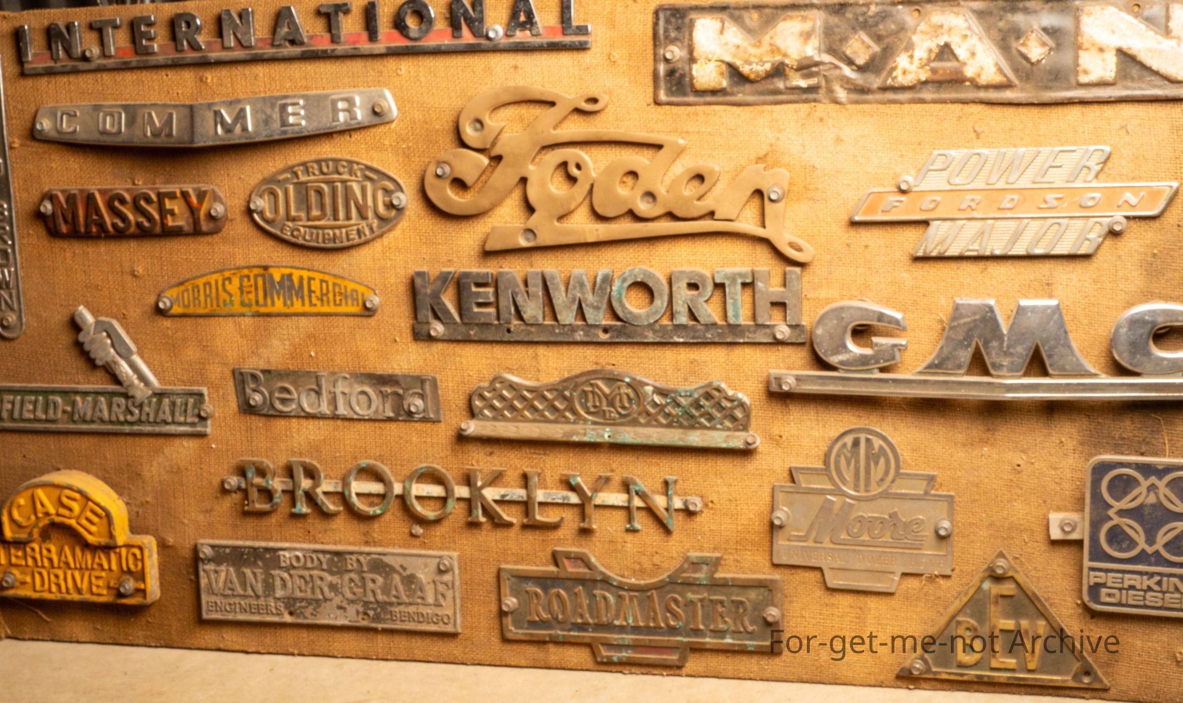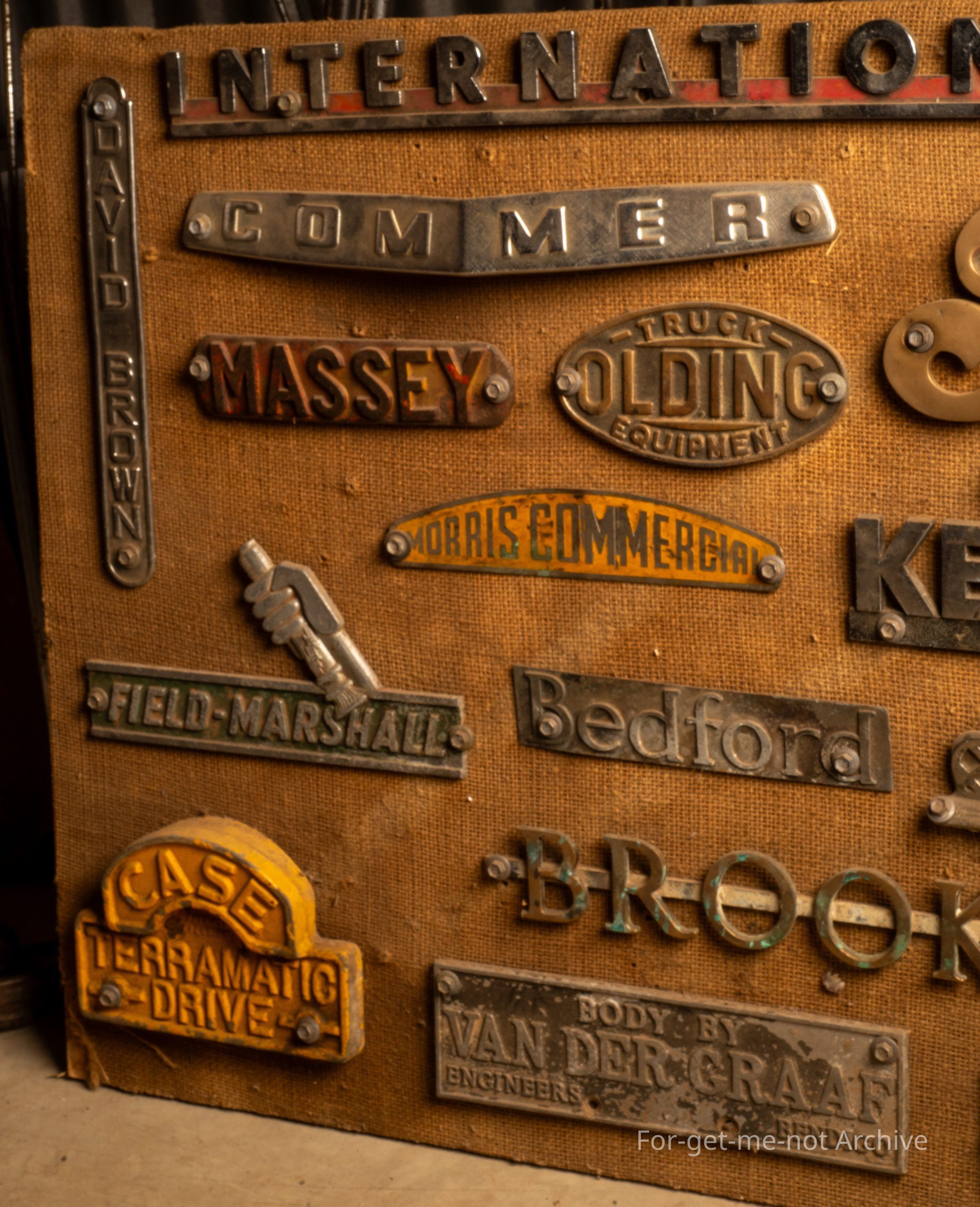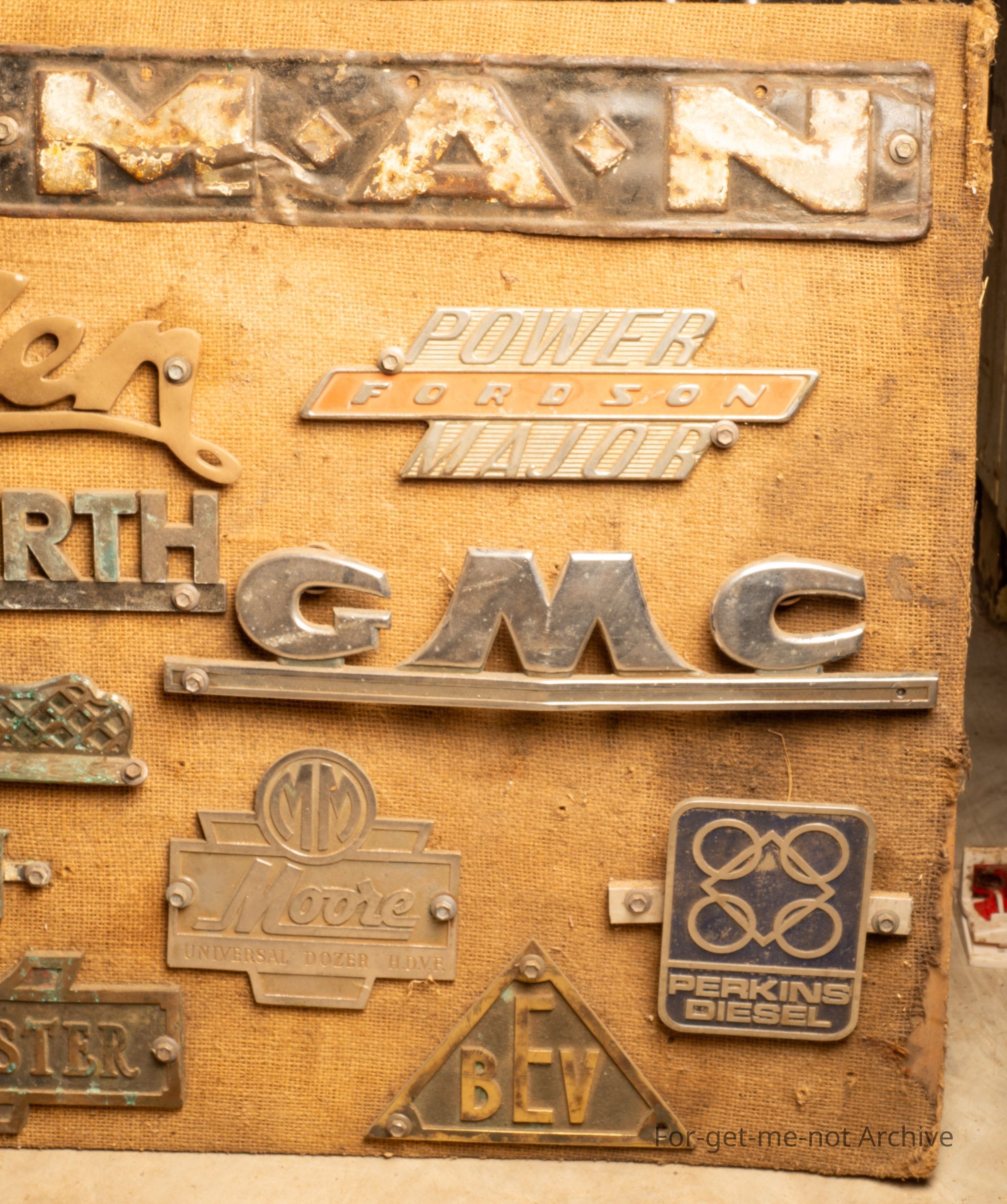 Description, this is a board of, name plates, etcetera, from various manufacturers of trucks, tractors, oil heavy industrial equipment. Total of roughly 20