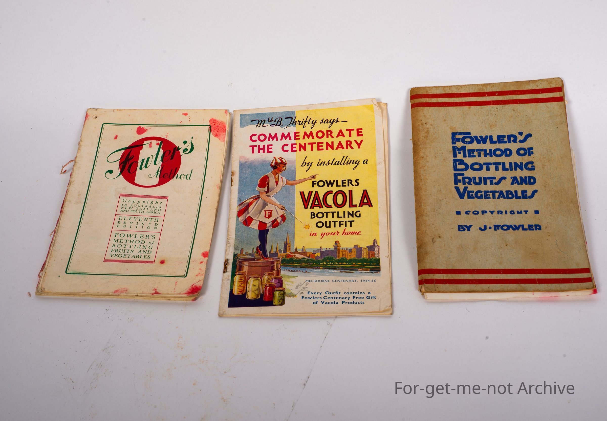 Is a group of 3 Fowlers booklets, method of bottling fruits and vegetables, the second one is Fowler's method. Looks to be an older book. Once again, for fruit and vegetables. The third one is, the 30 years commemorative for century by installing Fowler's bottling outfit, 1934, 35.Collection