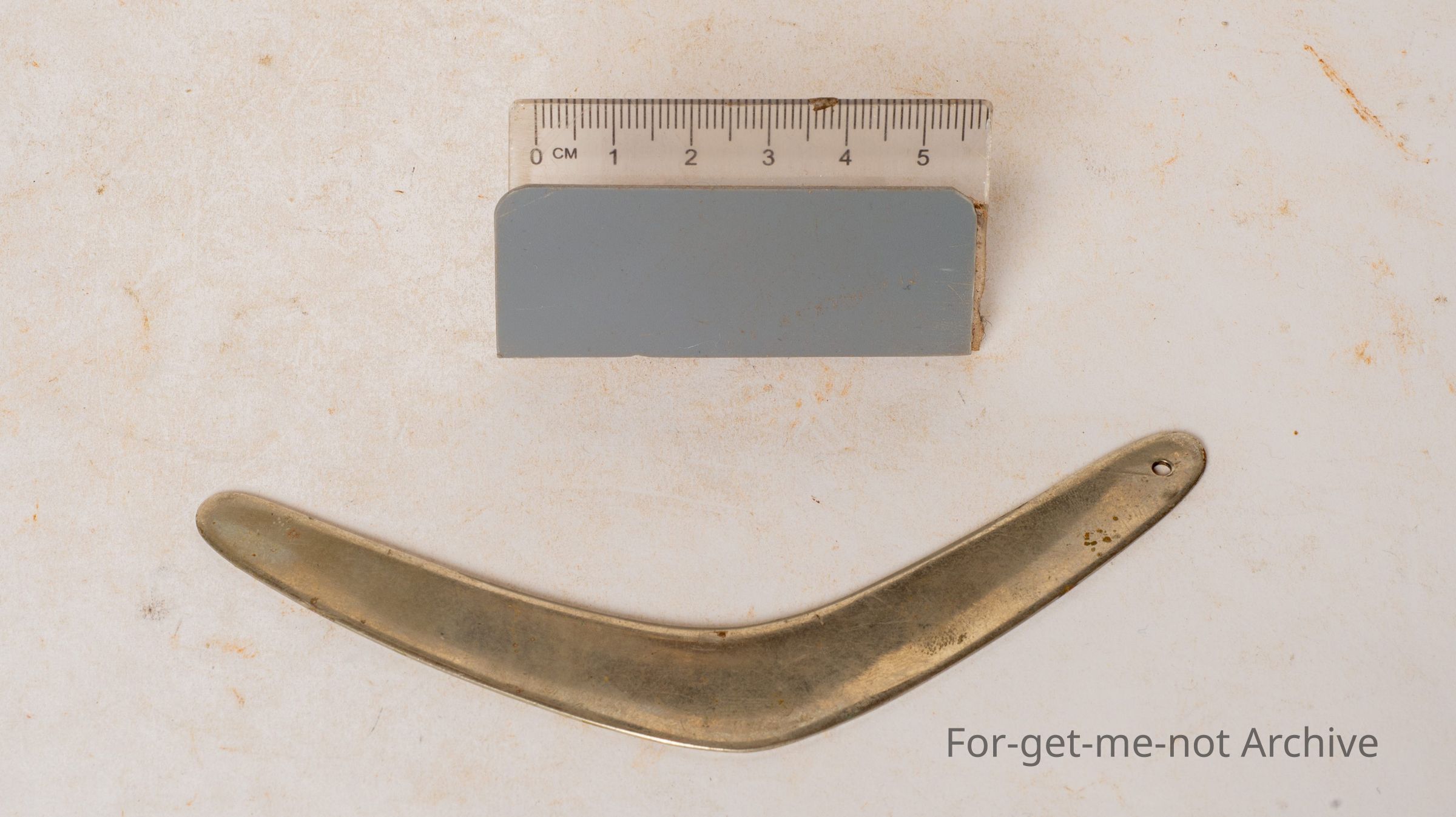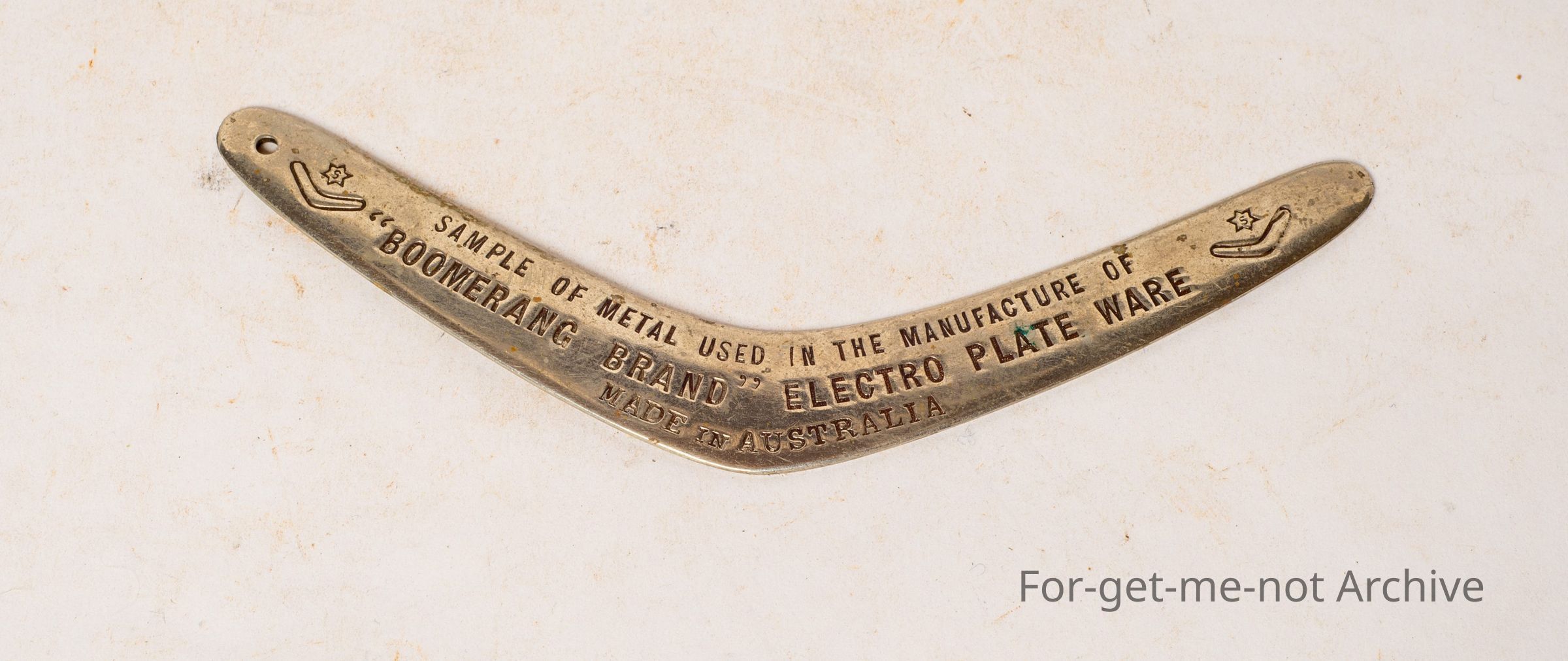 This is a boomerang which states sample of metal used in the manufacture of Boomerang brand electroplate wear made in Australia. This was by the, Stokes company in Melbourne. When they published the book on Stokes Co., they couldn't find one of these to put in the book. Quite a scarce piece.Collection