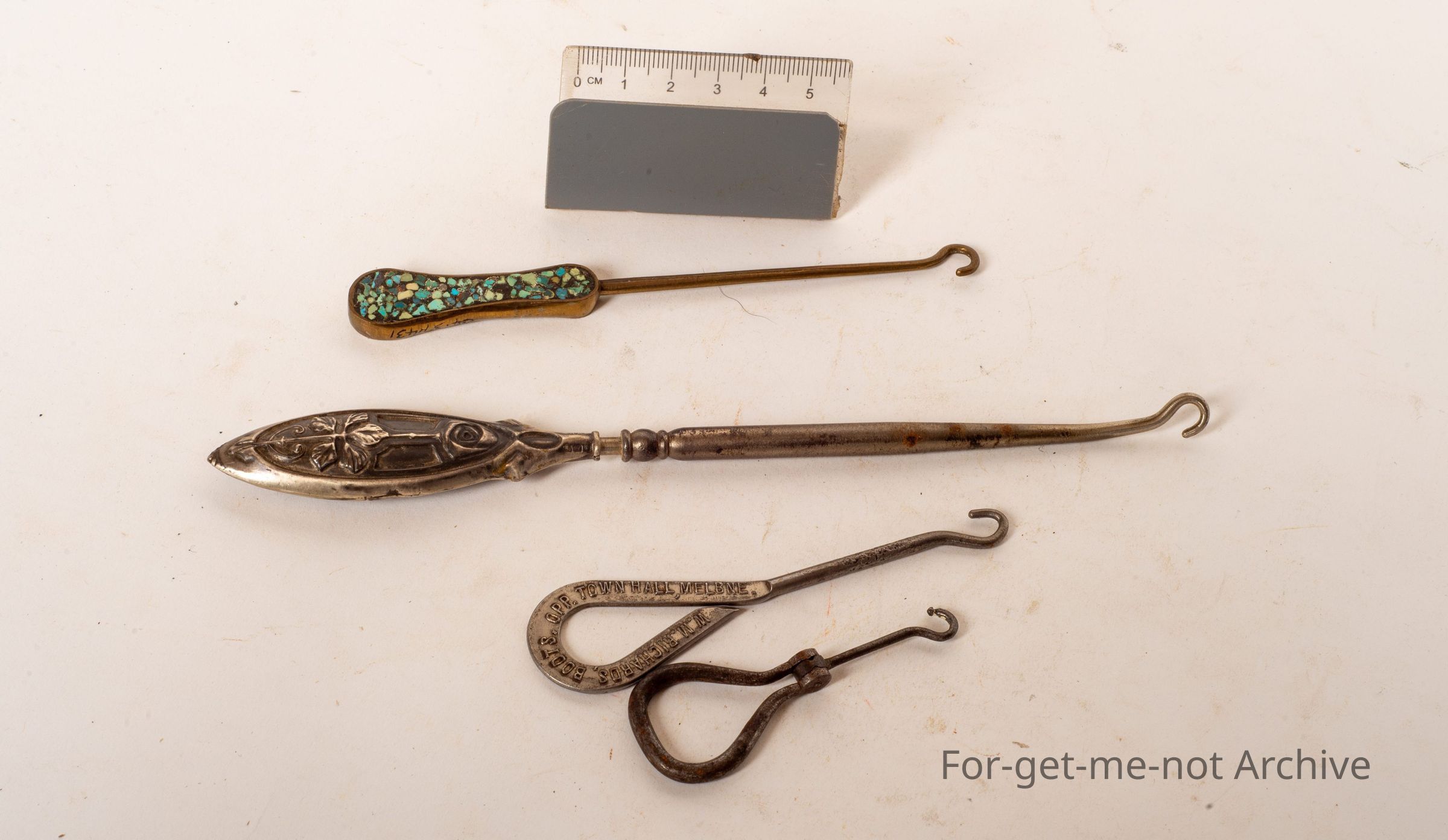 4 boot hooks with varying stages of ornament, some couple plain and a couple of really good ones,