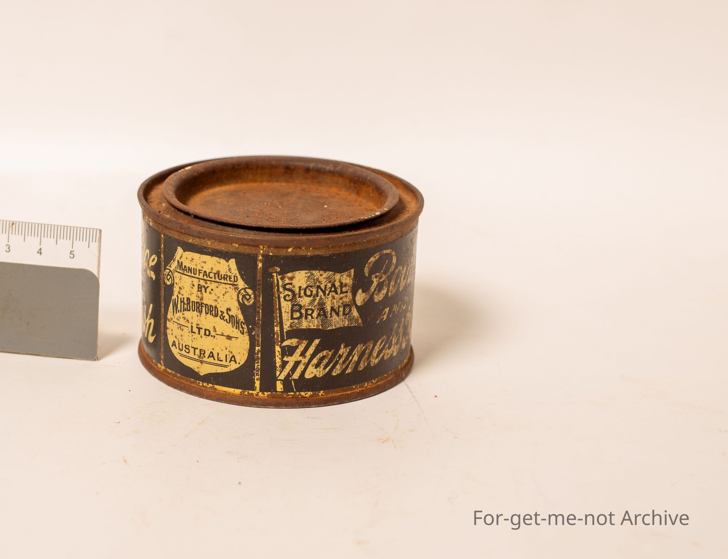Is a tin of Signal Brand, boot, shoe, and harness polish. WH Burford and Sons Australia. I'd say this tin will be very old,