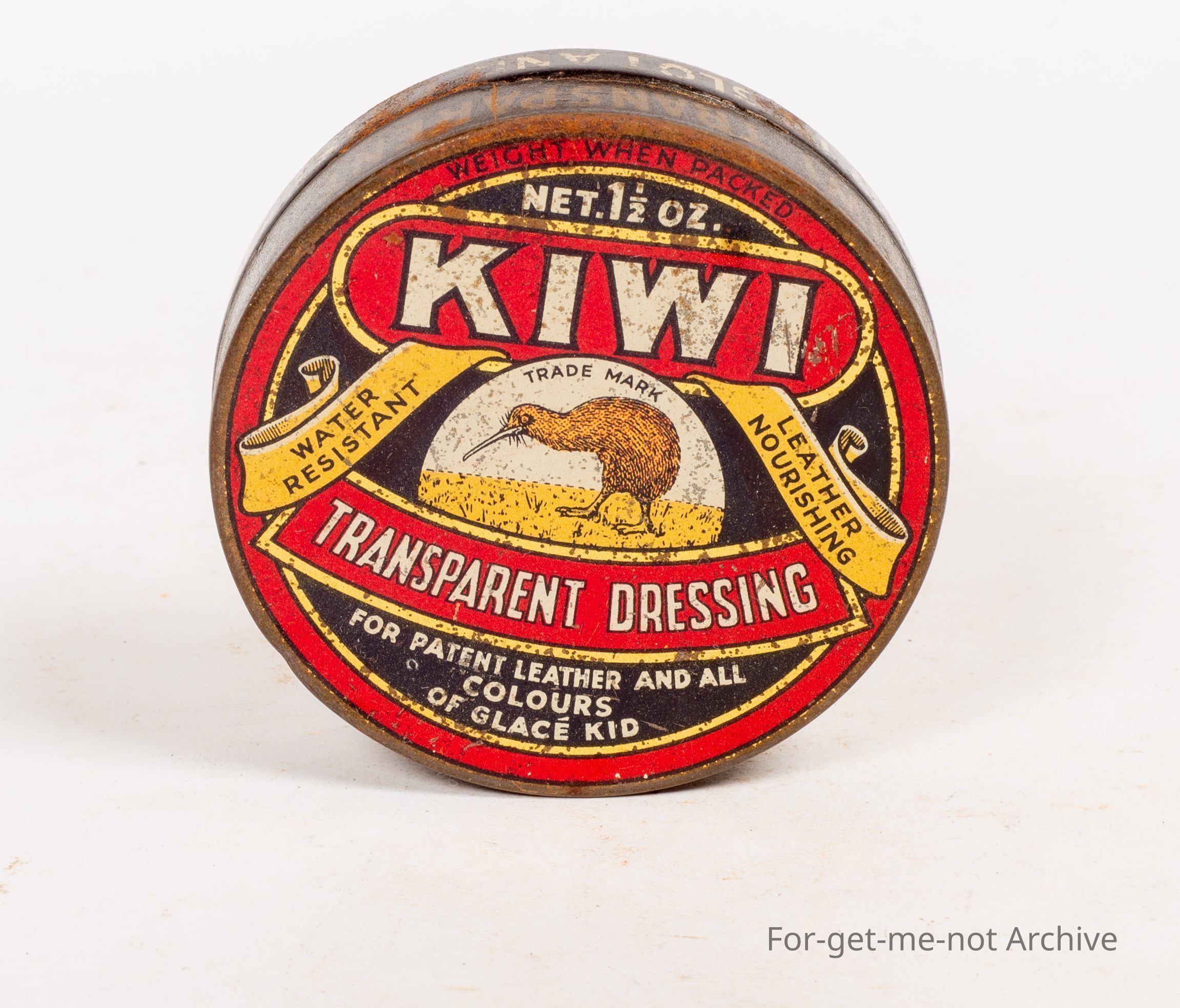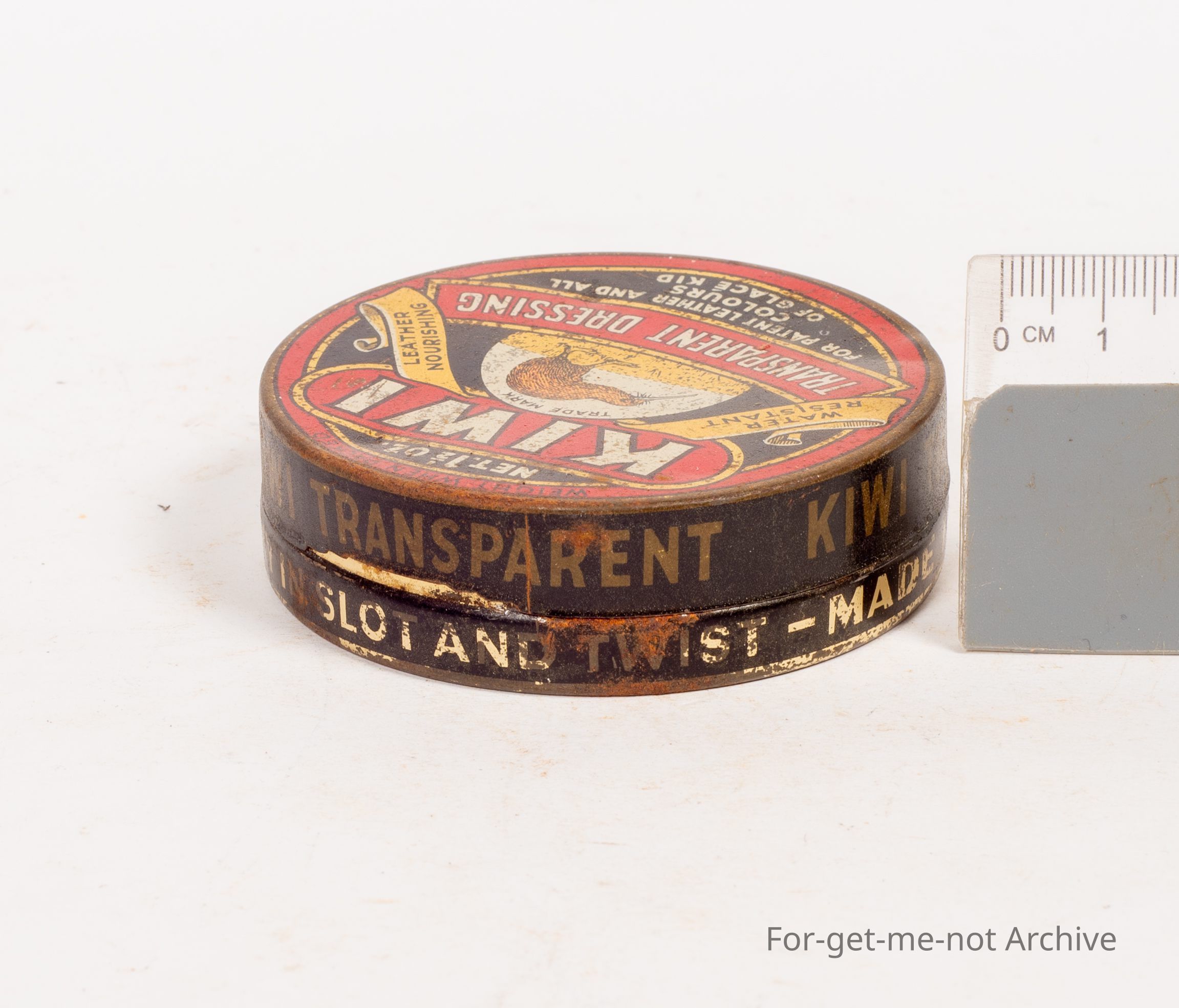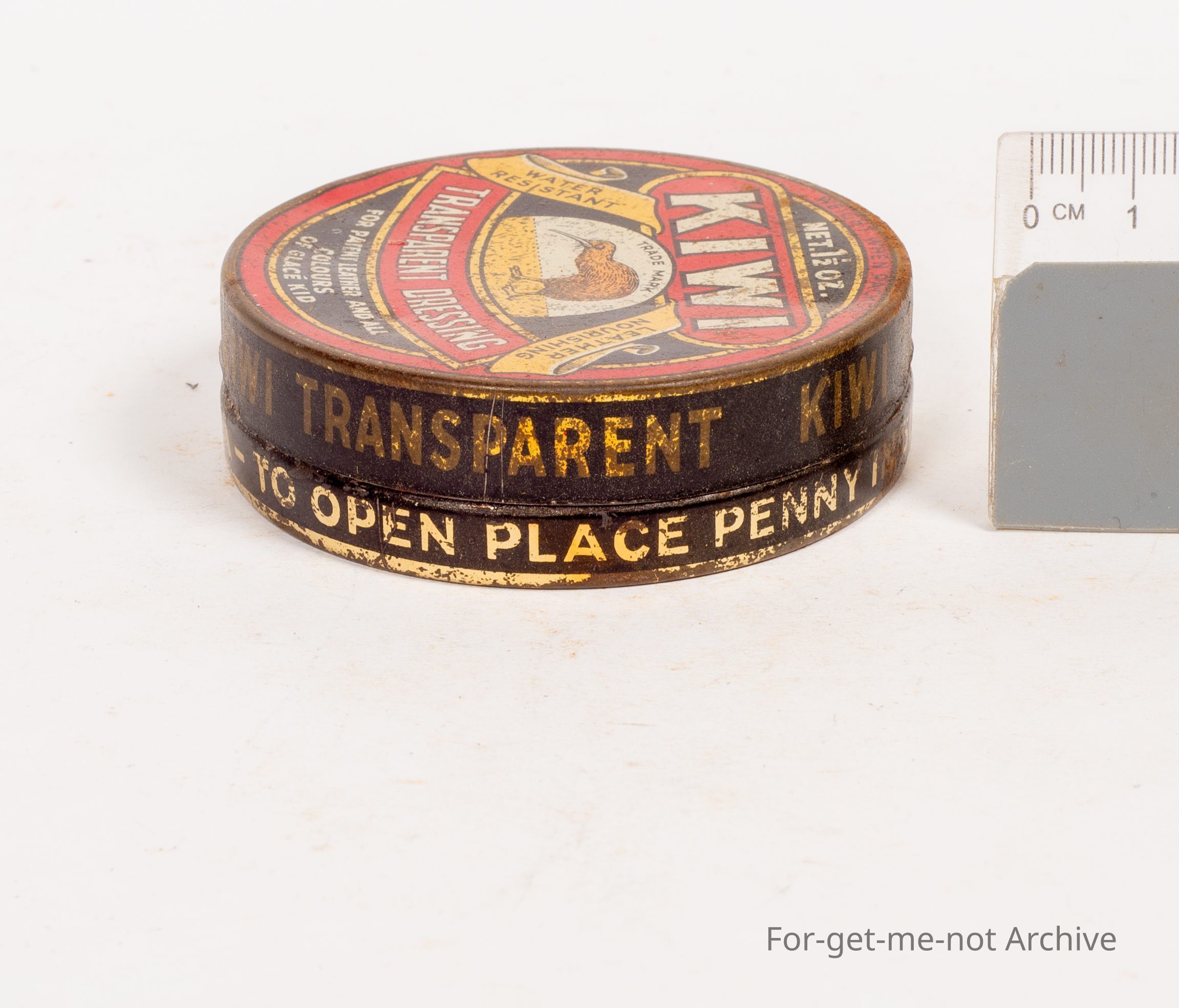 Boot polish tin, Kiwi transparent dressing, 1 and a half ounce net weight, pretty early Kiwi 1, not bad condition.