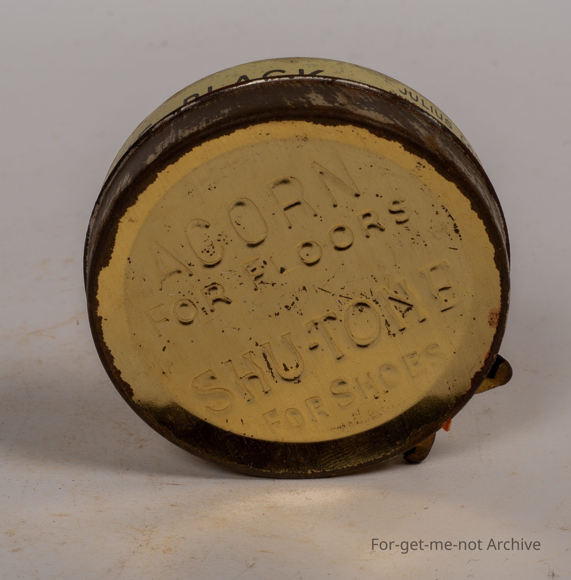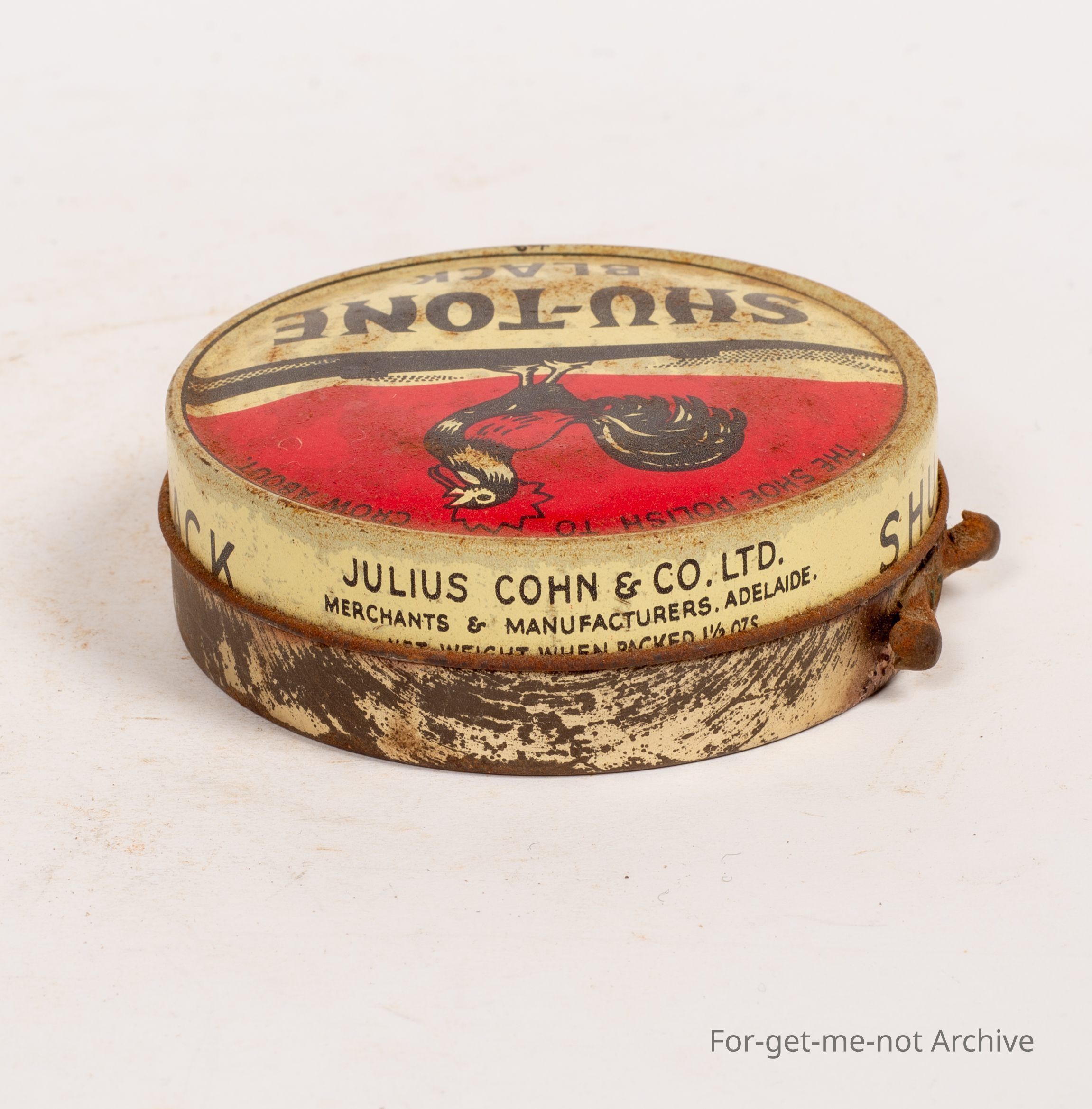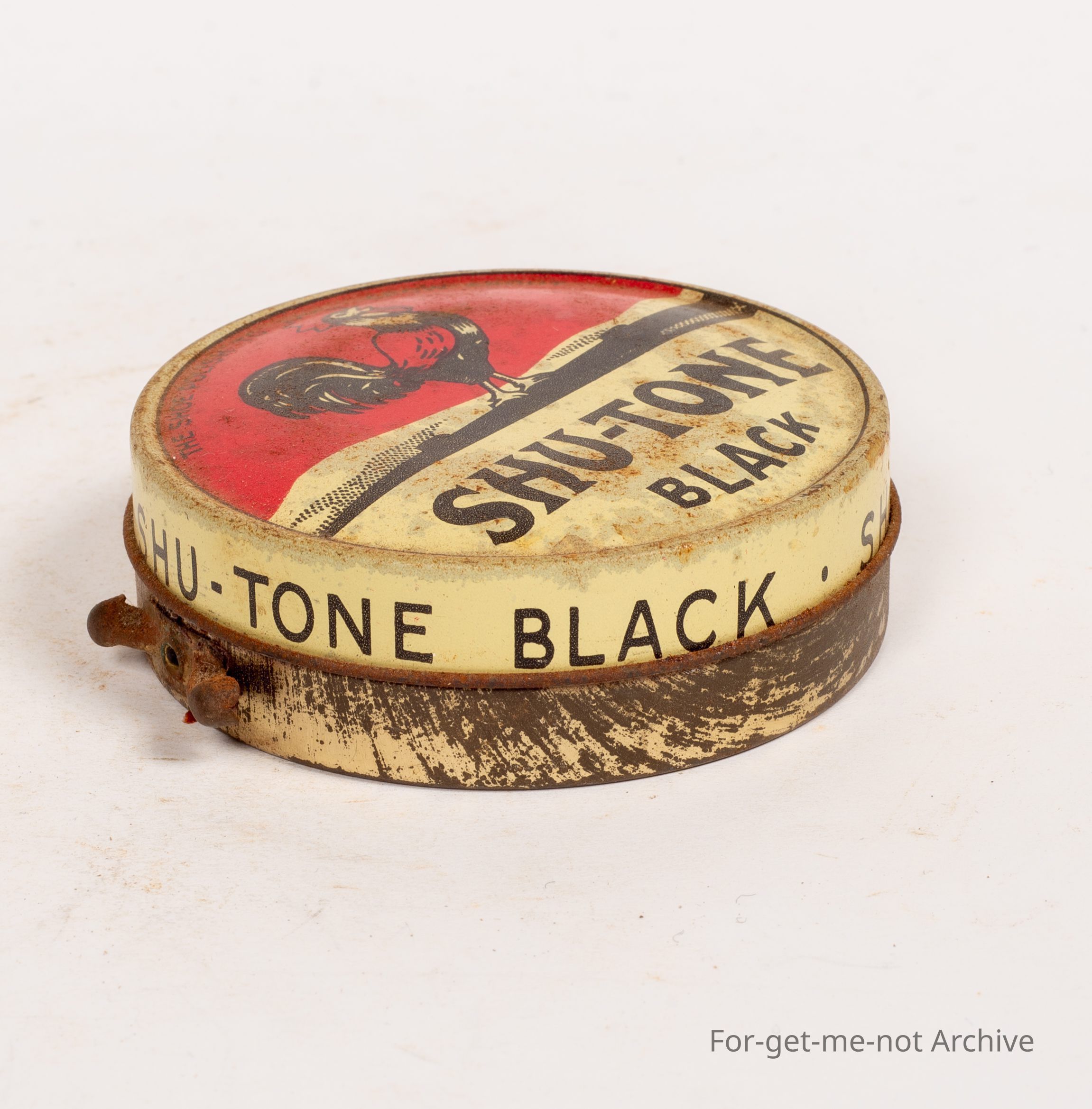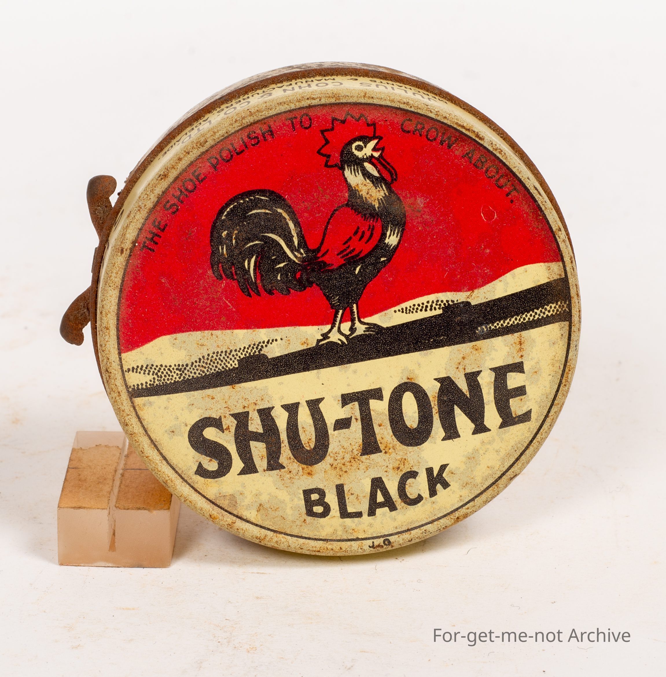Boot Polish Tin, Shu-tone, black, the shoe polish to crow about with rooster.