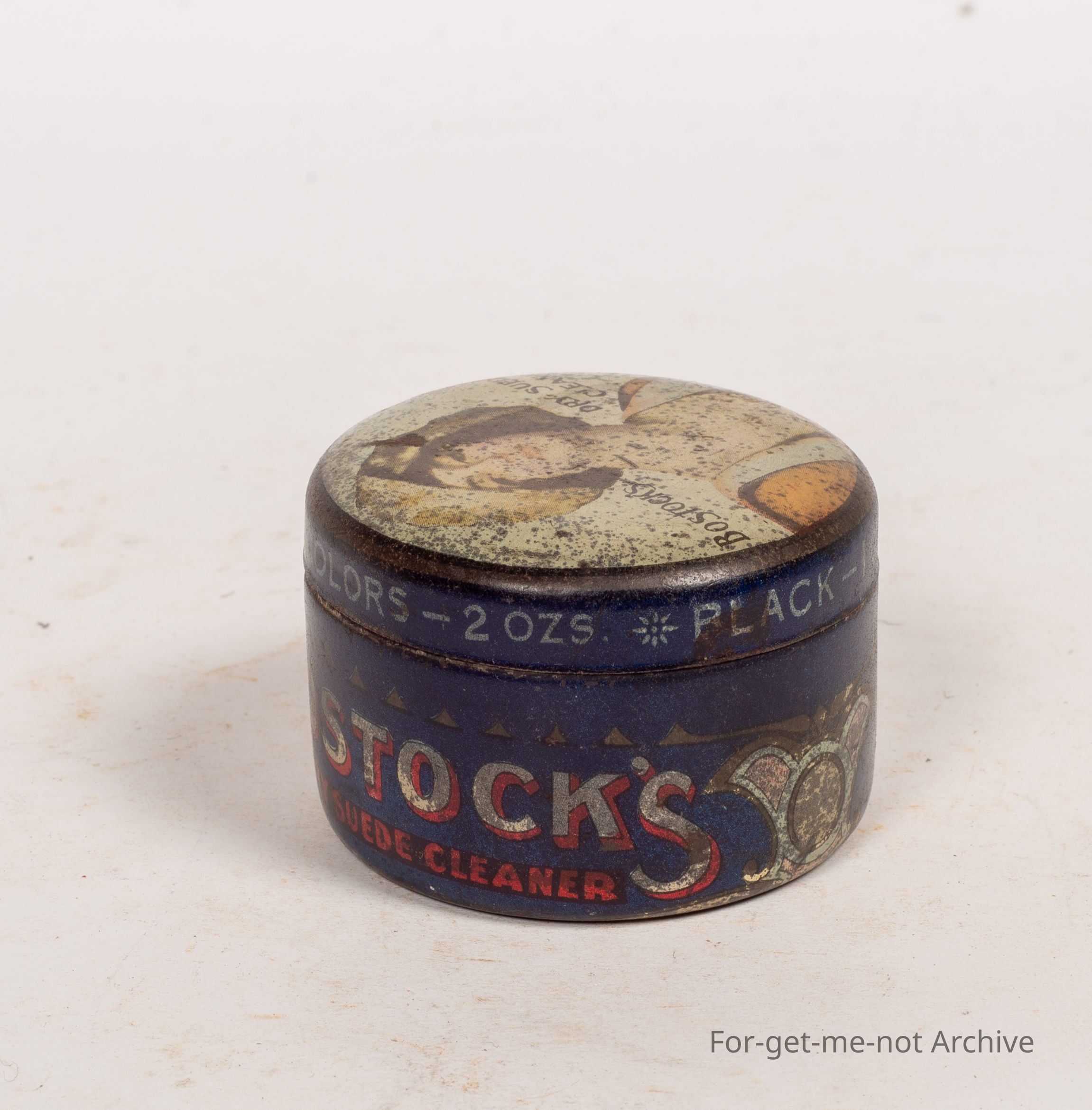 Boot polish tin. Bostocks, dry suede cleaner. Image of lady, probably a very early tin, 2 ounces capacity, black.