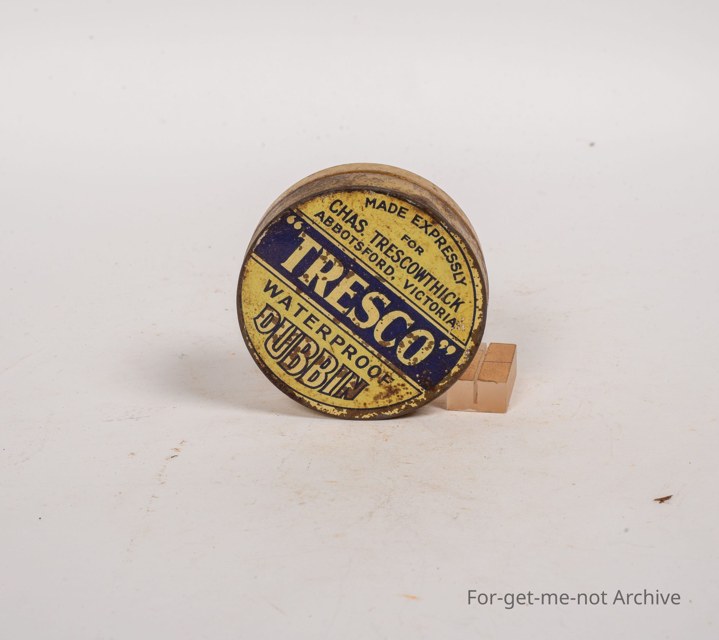 Boot polish tin. Tresco waterproof dubbin. Made expressively for Chas Trescowthick, Abbotsford, Victoria.