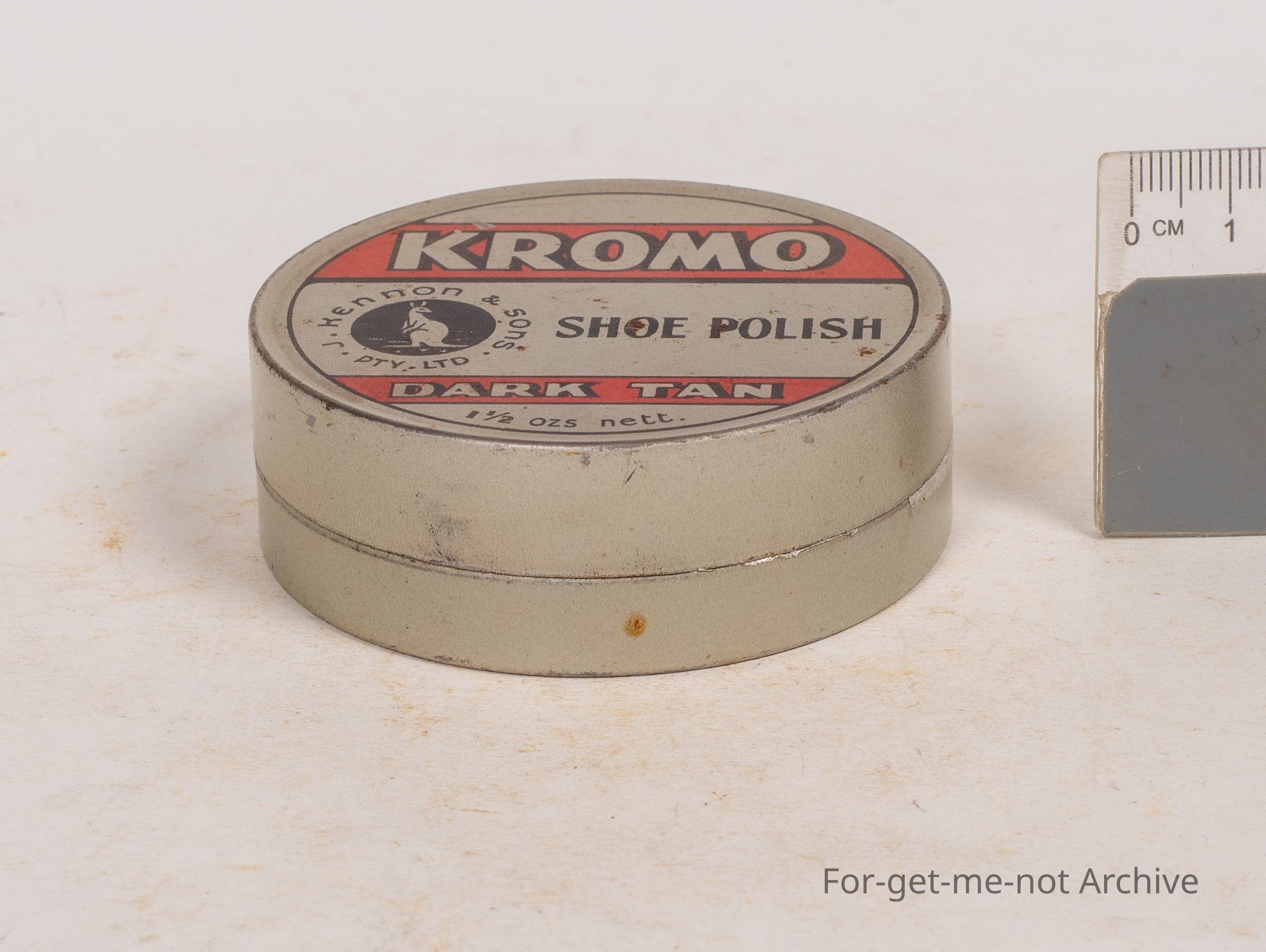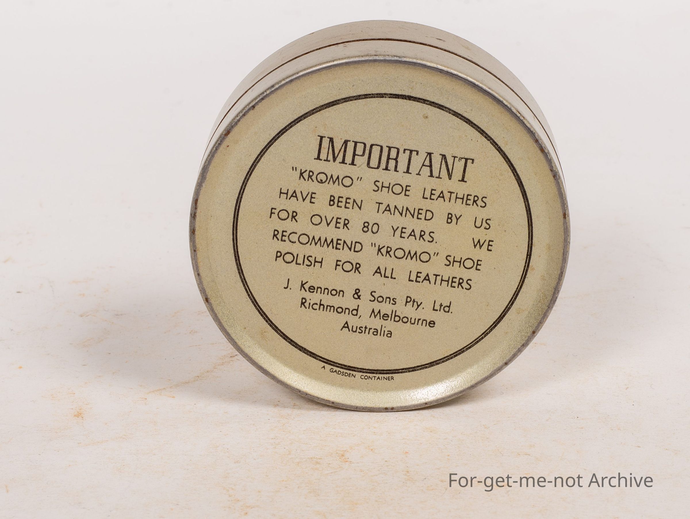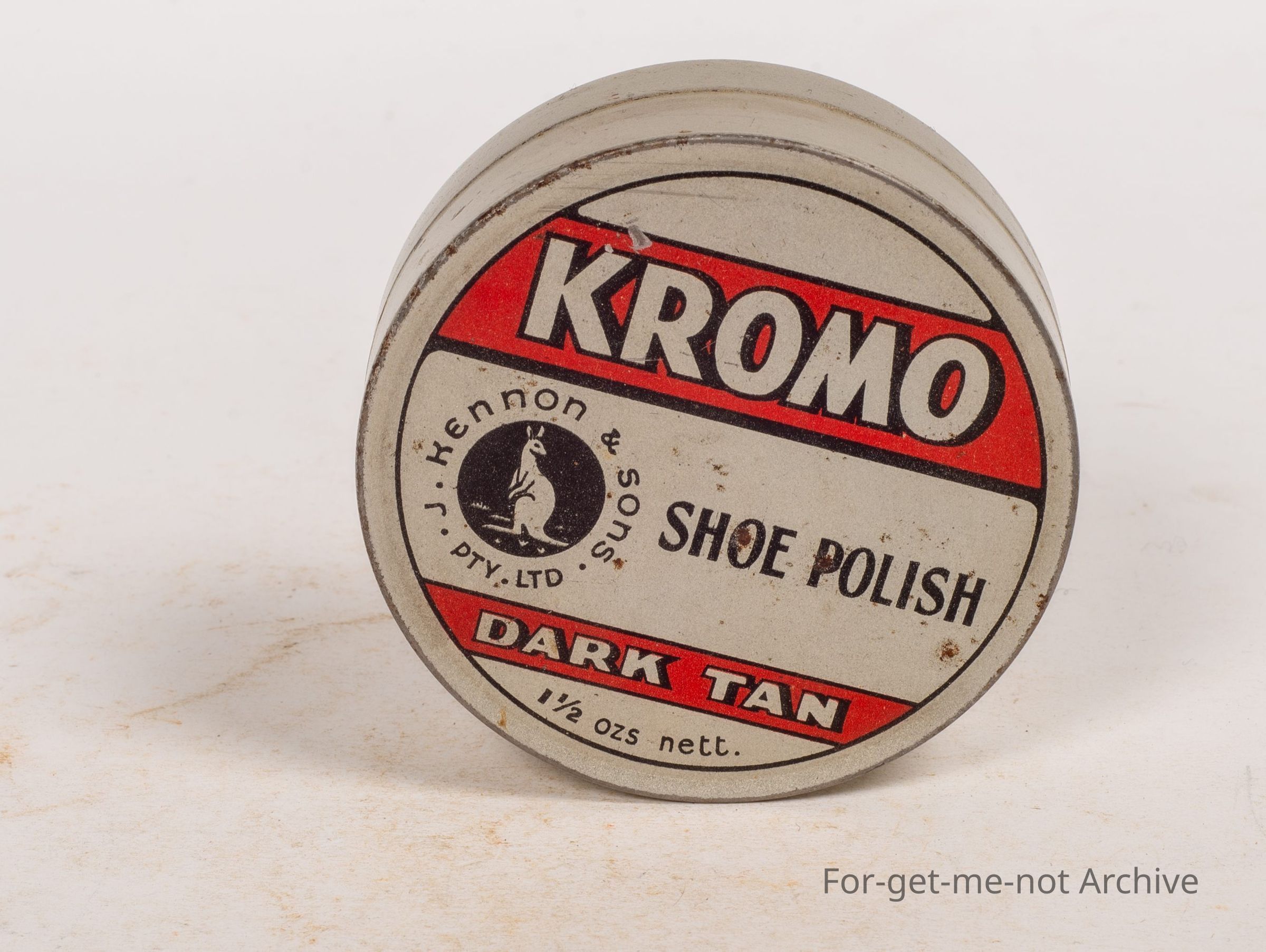 Boot polish tin, Kromo, Kennon and Son Proprietary Limited, kangaroo image, made by Kennon and Son Richmond, Melbourne, Australia. Dark tan, 1 and a half ounce capacity.