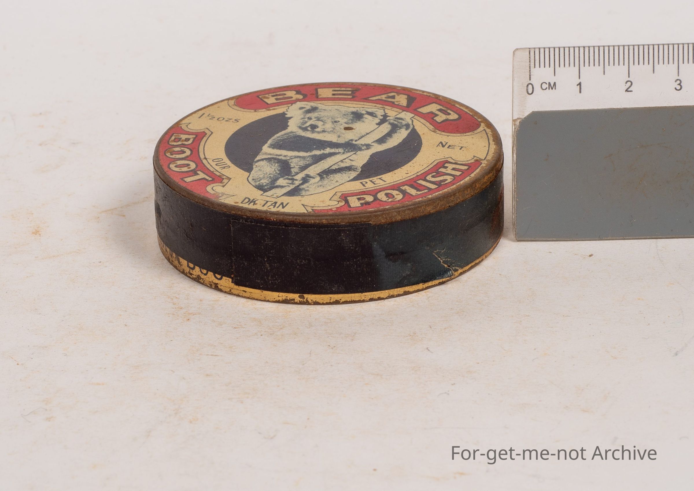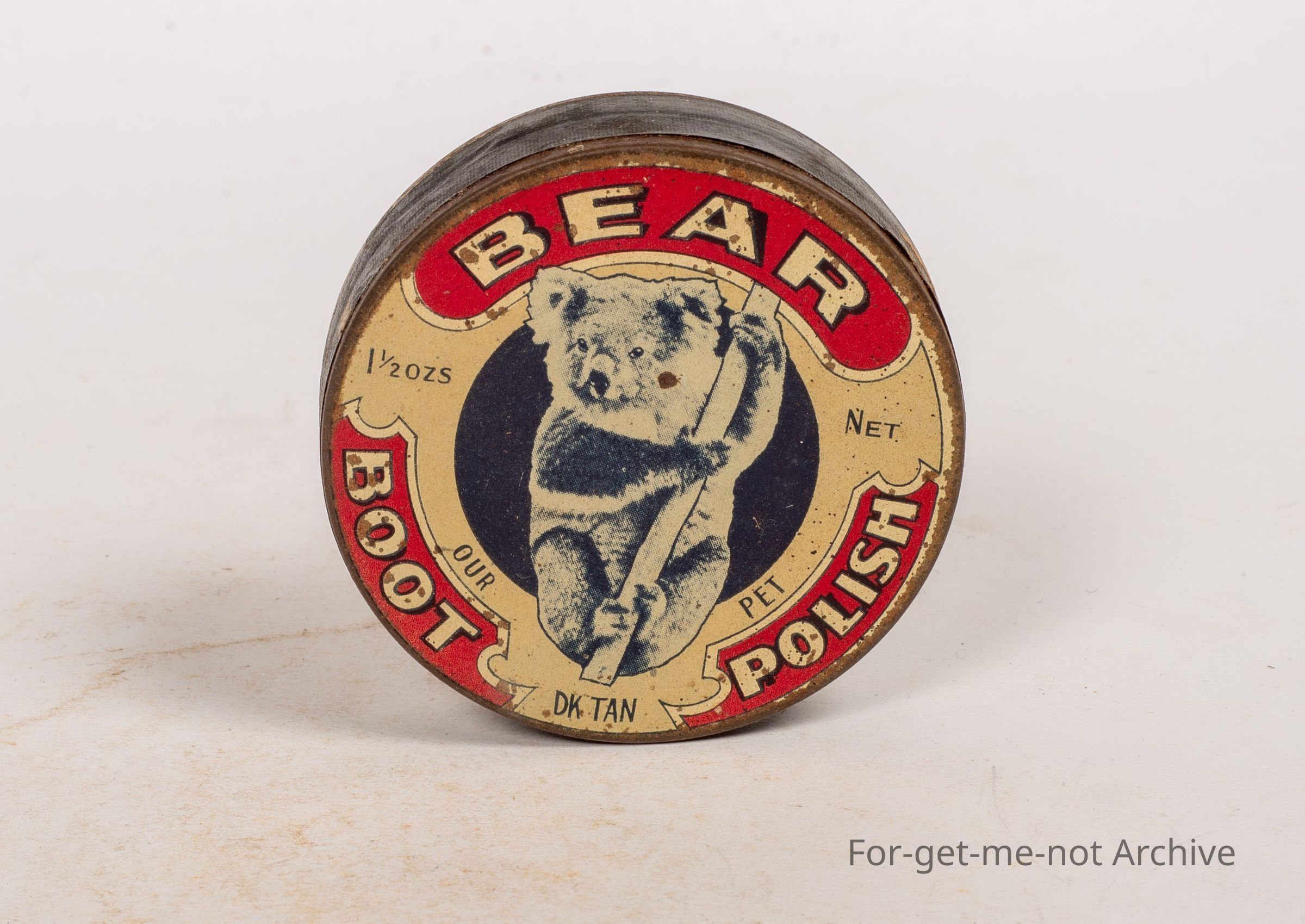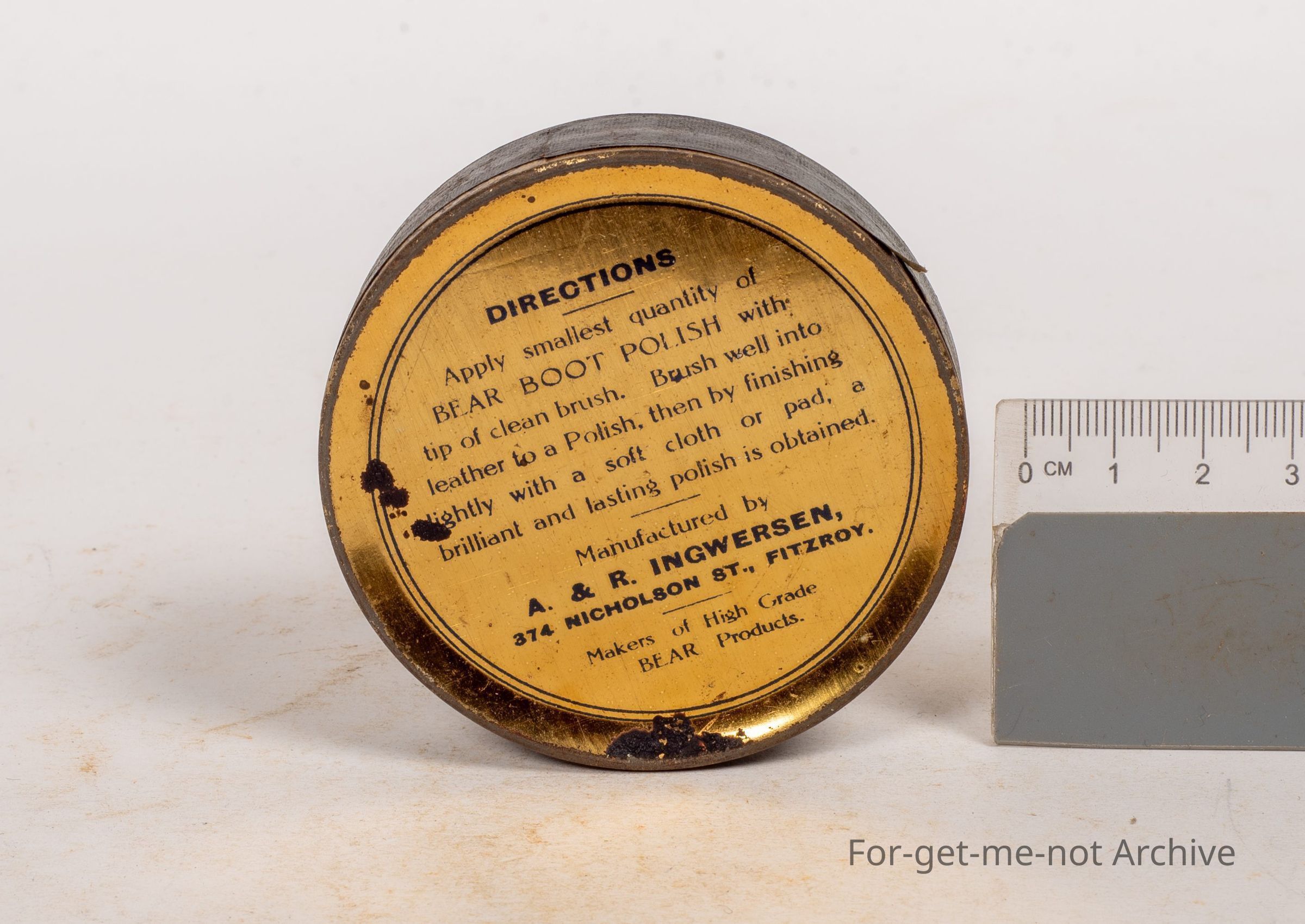 Boot polish tin. Bear boot polish. 1 and a half ounces net, koala in the tree. The this has been packed by Ingwersen, Nicholson Street, Fitzroy.