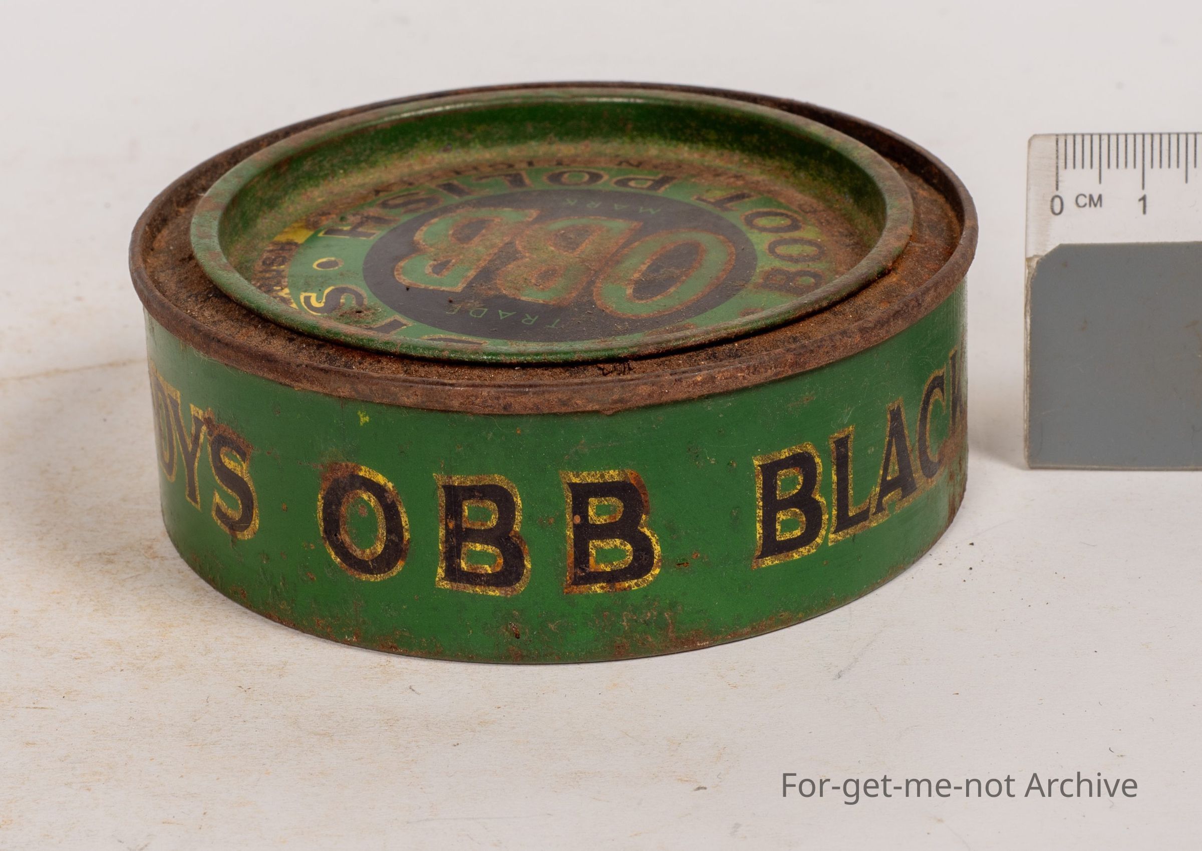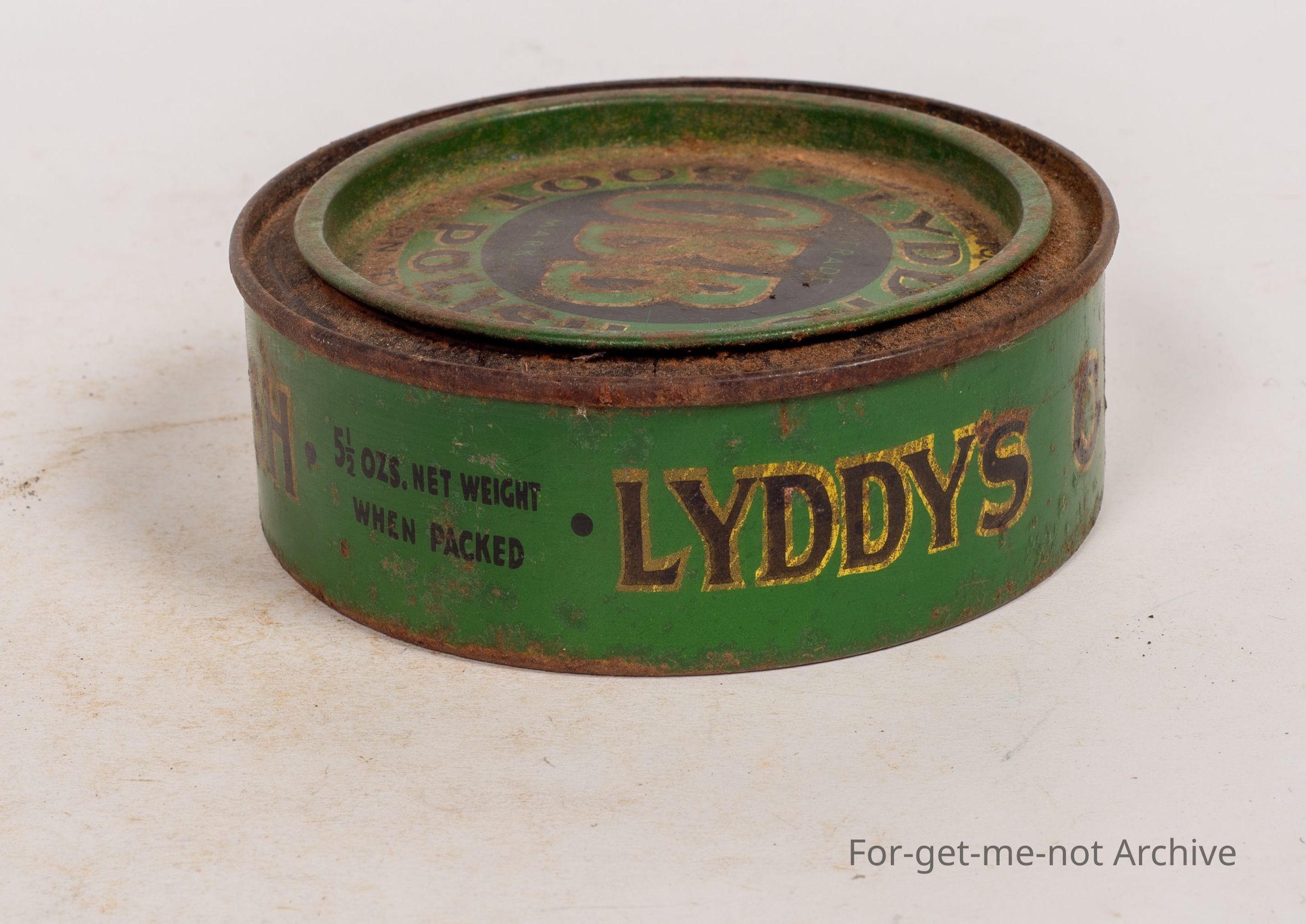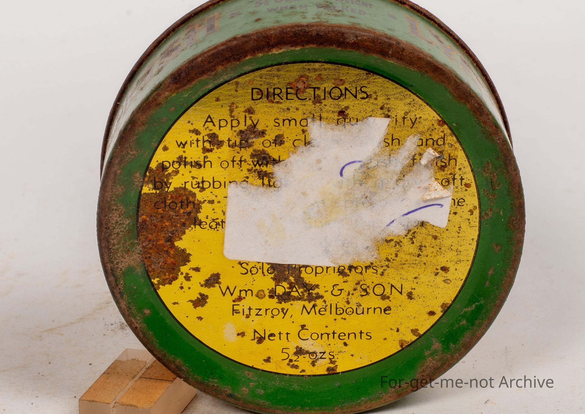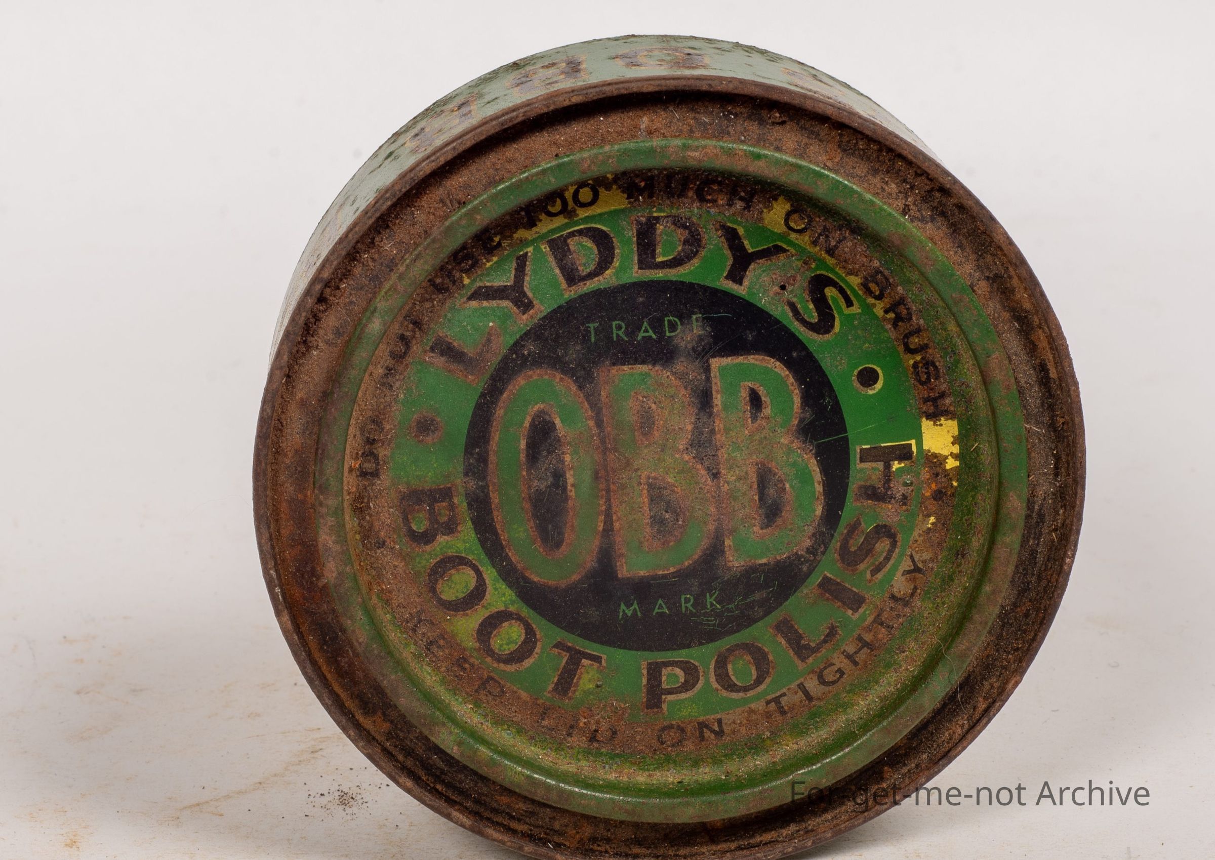 Boot polish tin, Liddy's OBB boot polish. This is not in good condition. 5 and a half ounces, packed in Fitzroy, Melbourne by WM William Day and Sons.