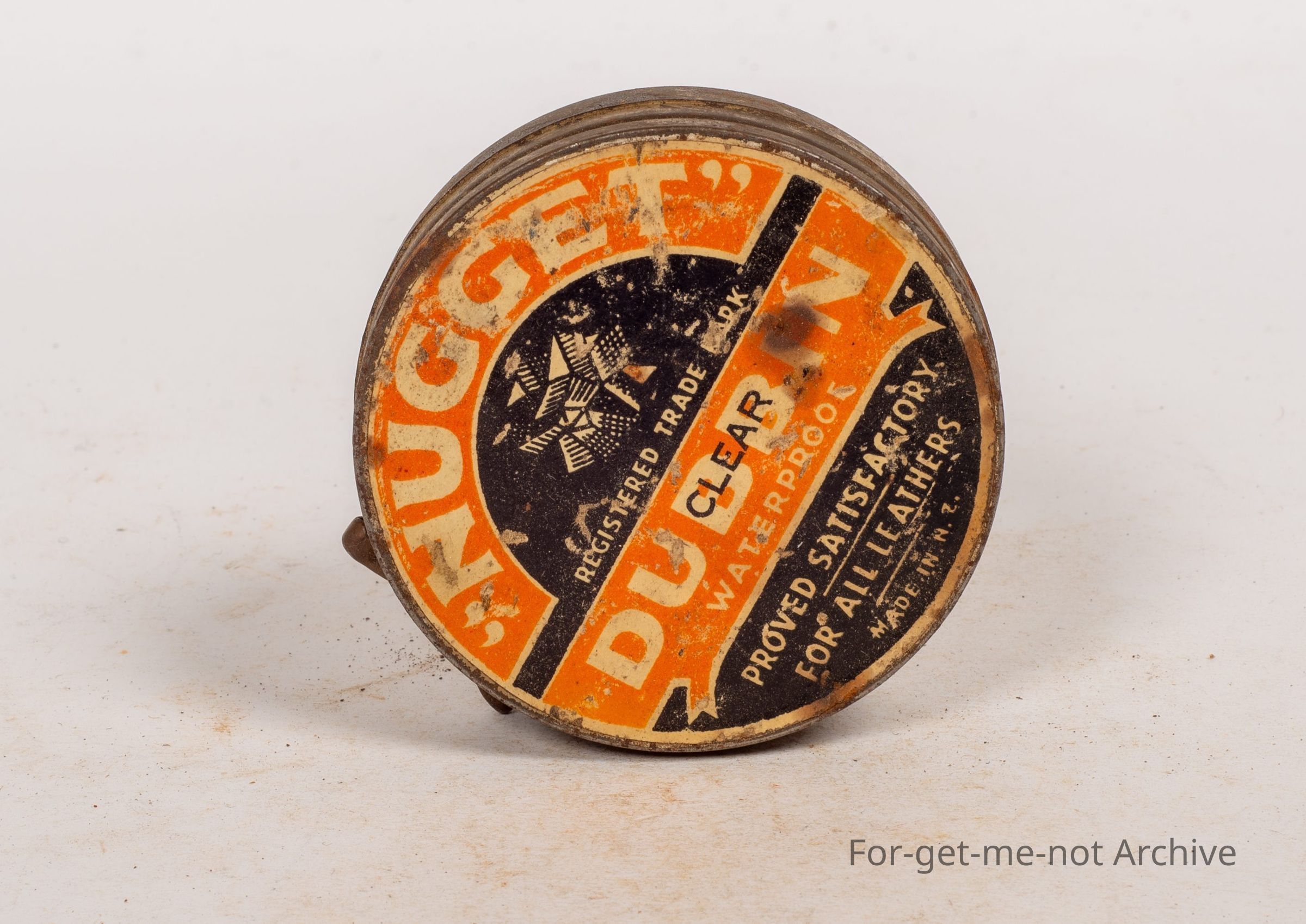 Boot polish tin. Nugget, Dubbin clear waterproof, satisfactory for all leathers made in New Zealand.