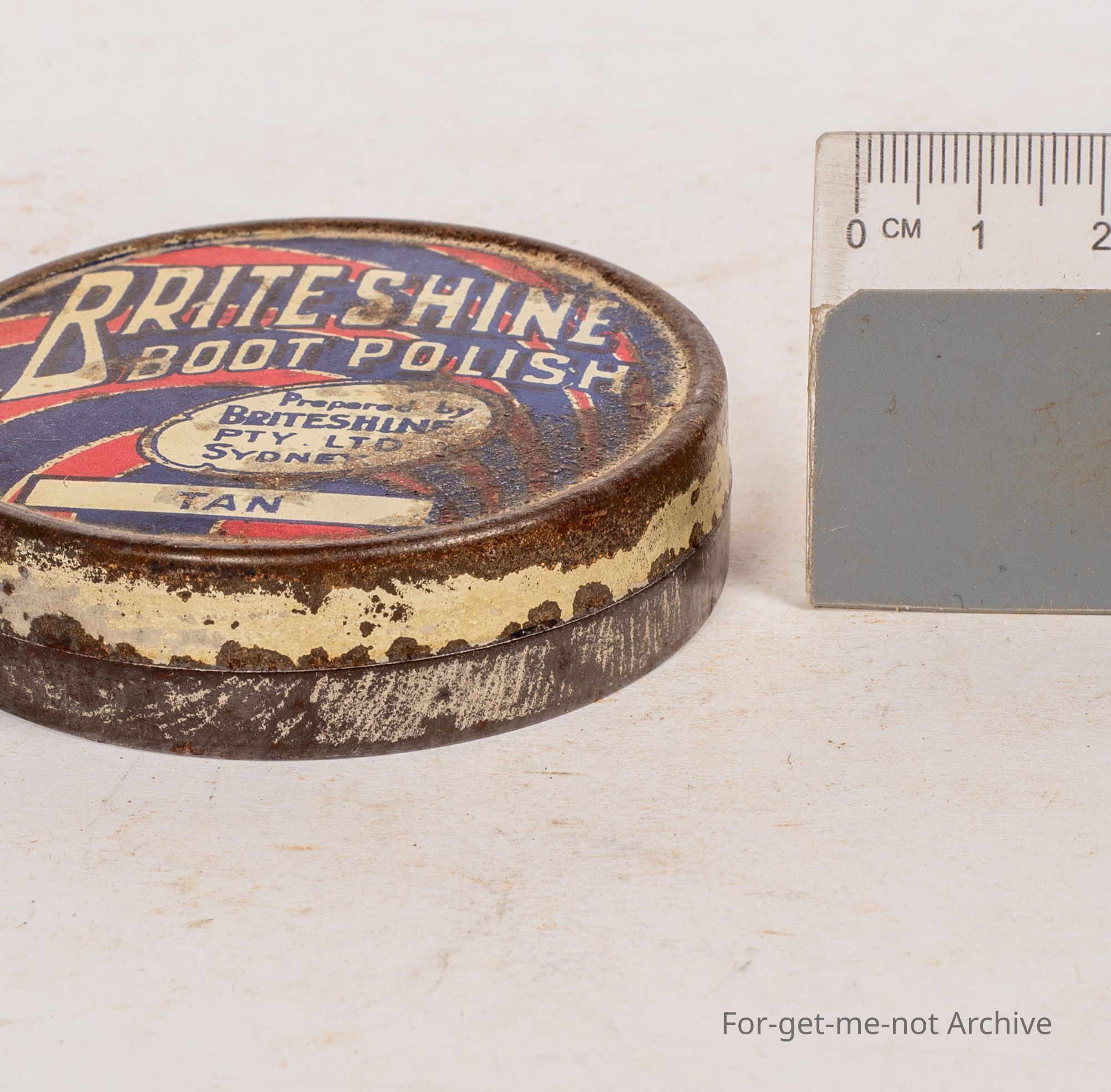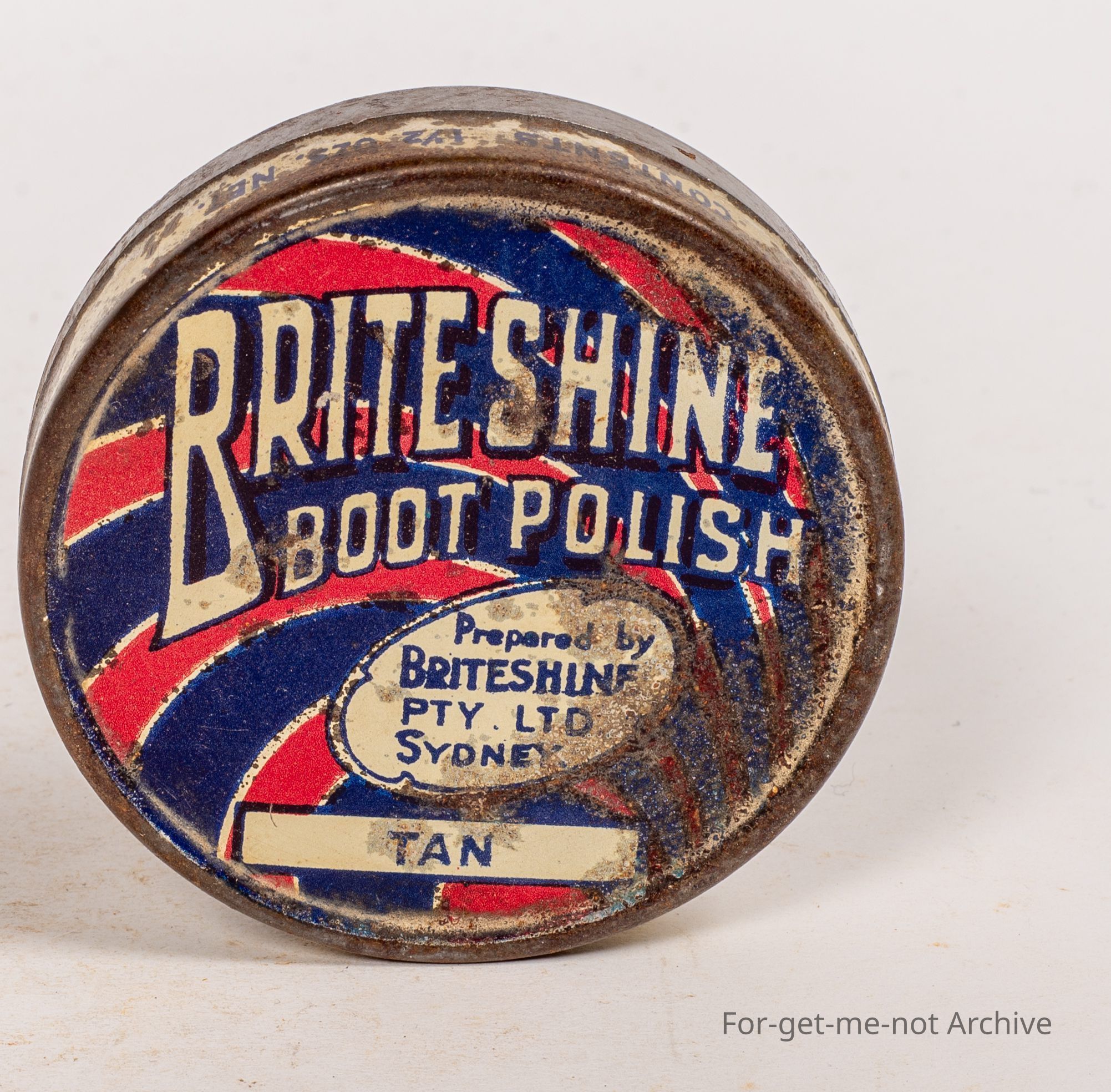 Boot polish gin., Brightshine Boot Polish prepared by Bright Shine Sydney. This is tan, an early hard to find Australian tin.