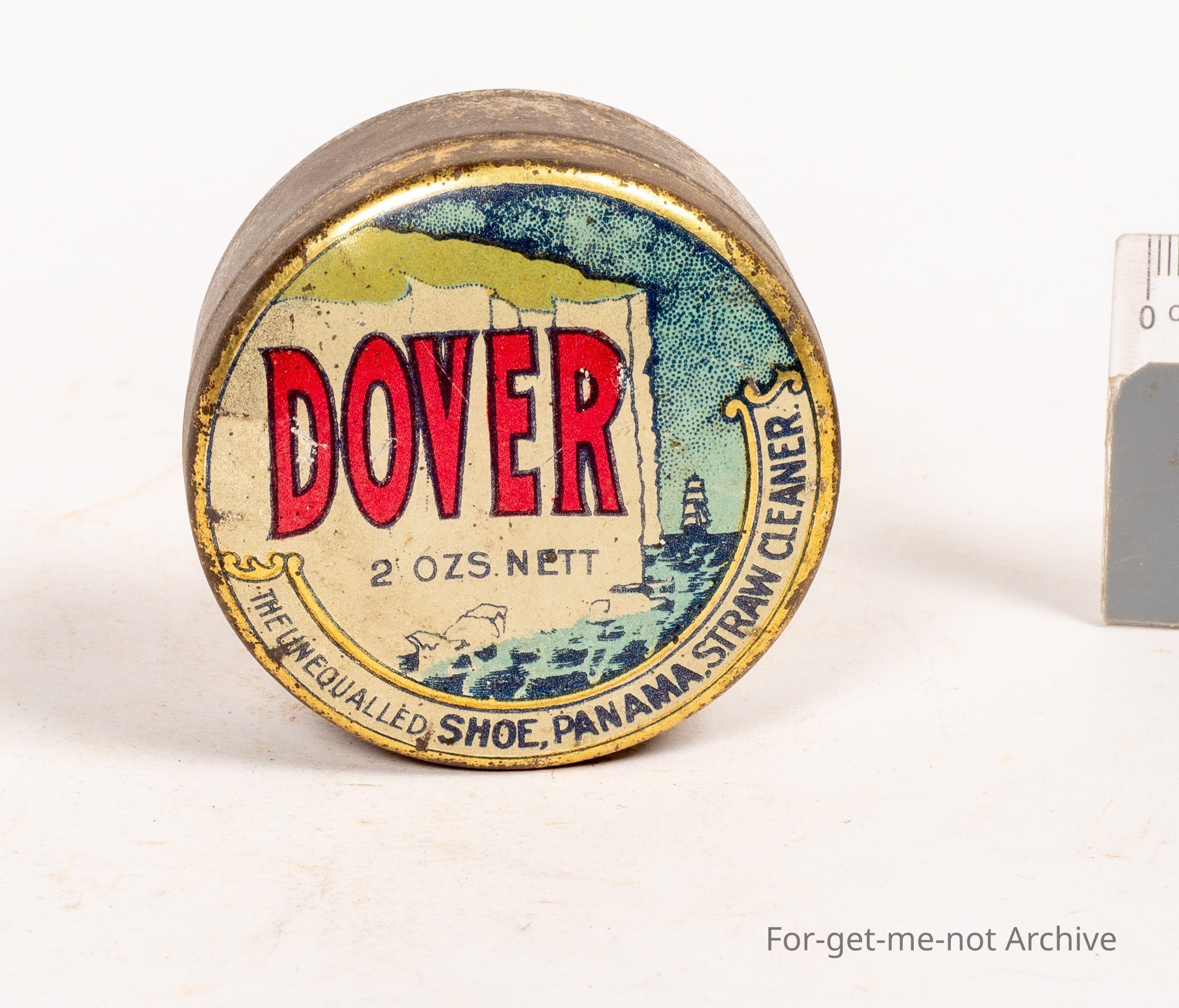 Boot polish tin, Dover, 2 ounce net, the unequalled shoe Panama straw cleaner. Scene of an old sailing ship, background of the white cliffs of Dover, beautiful nick.