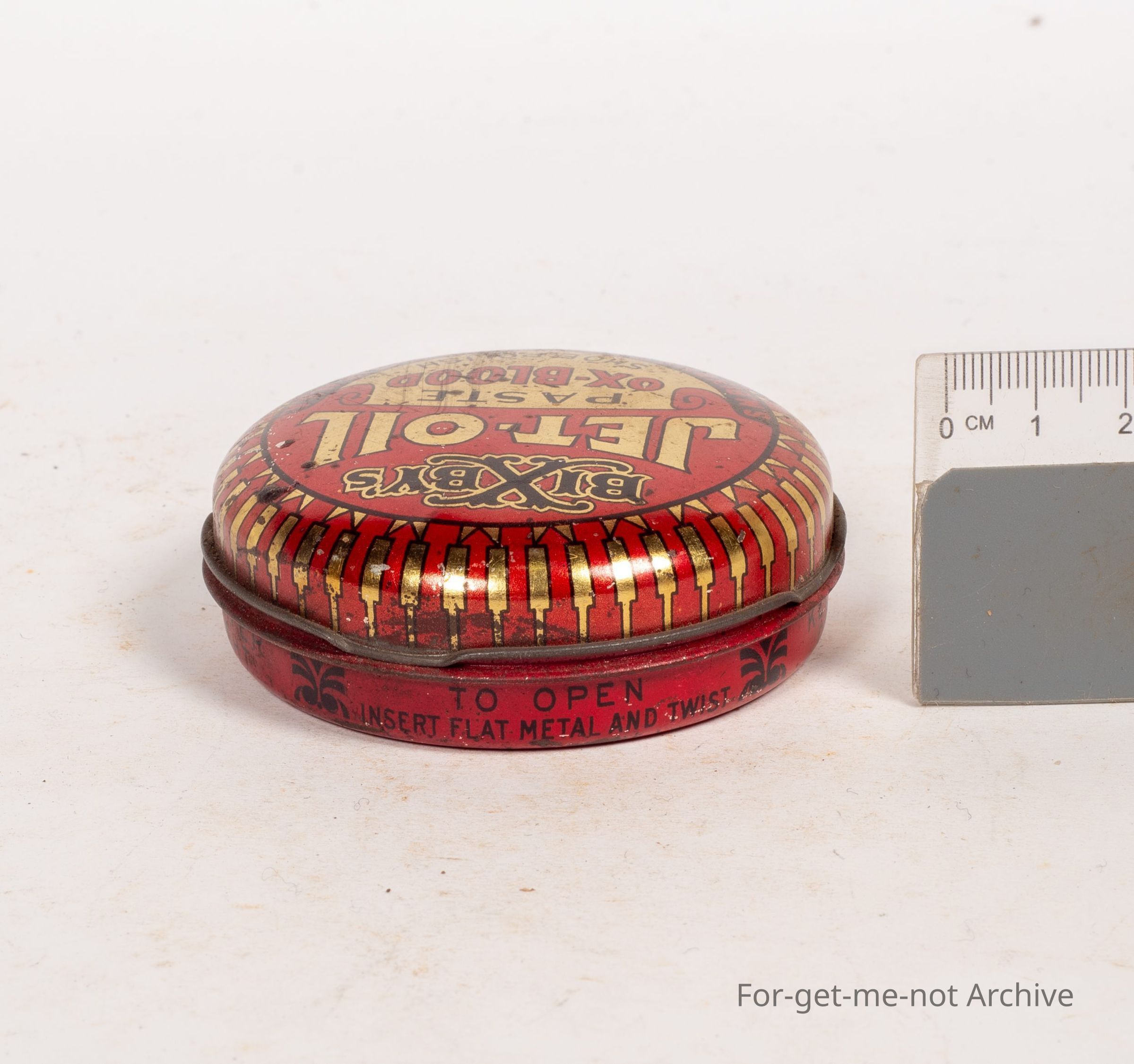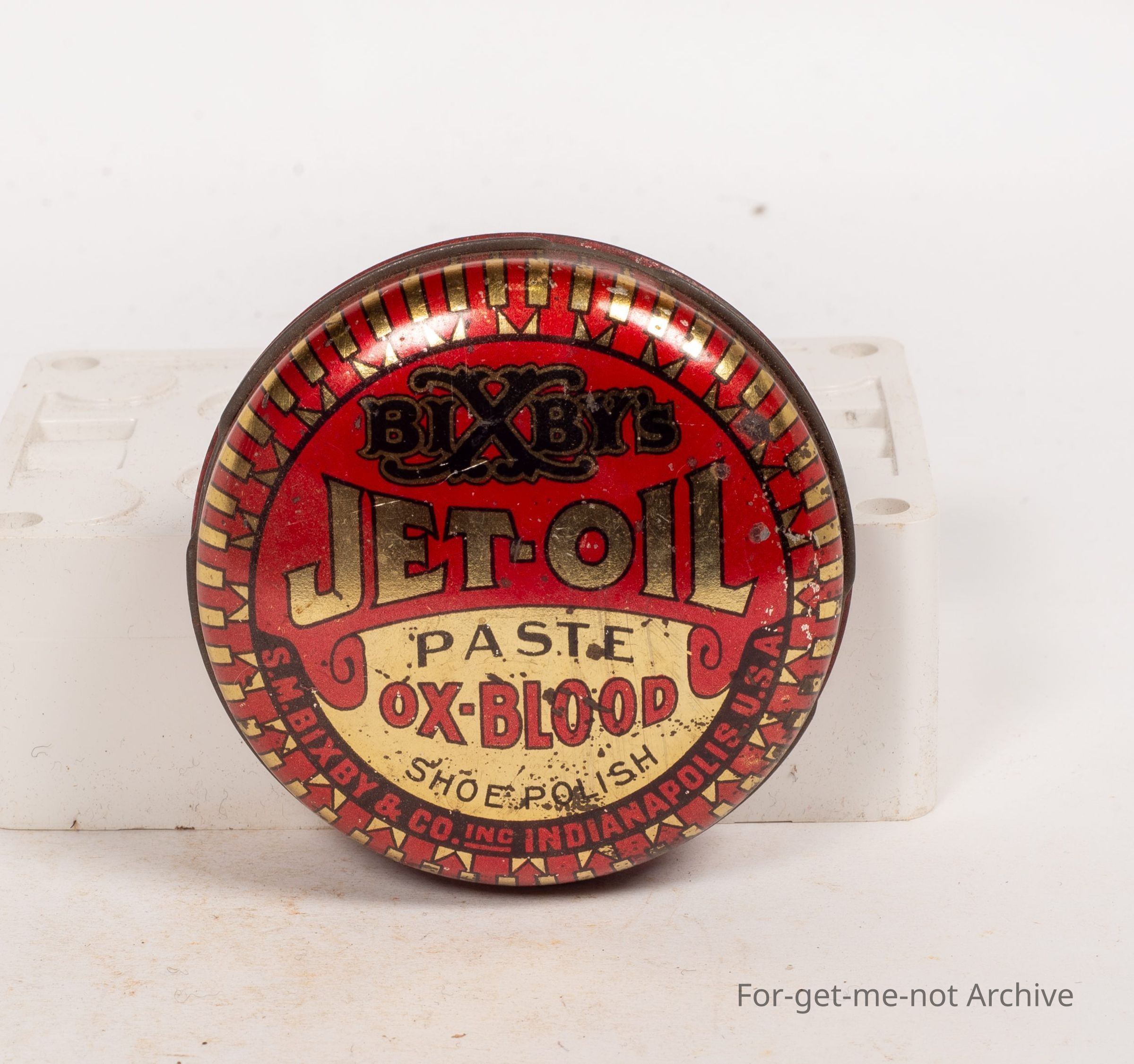 Boot polish tin. Bixby's Jet Oil Paste Oxblood Shoe Polish. Made in Indianapolis USA, beautiful graphics. Tin, good condition, 1 and 3 quarter ounces.