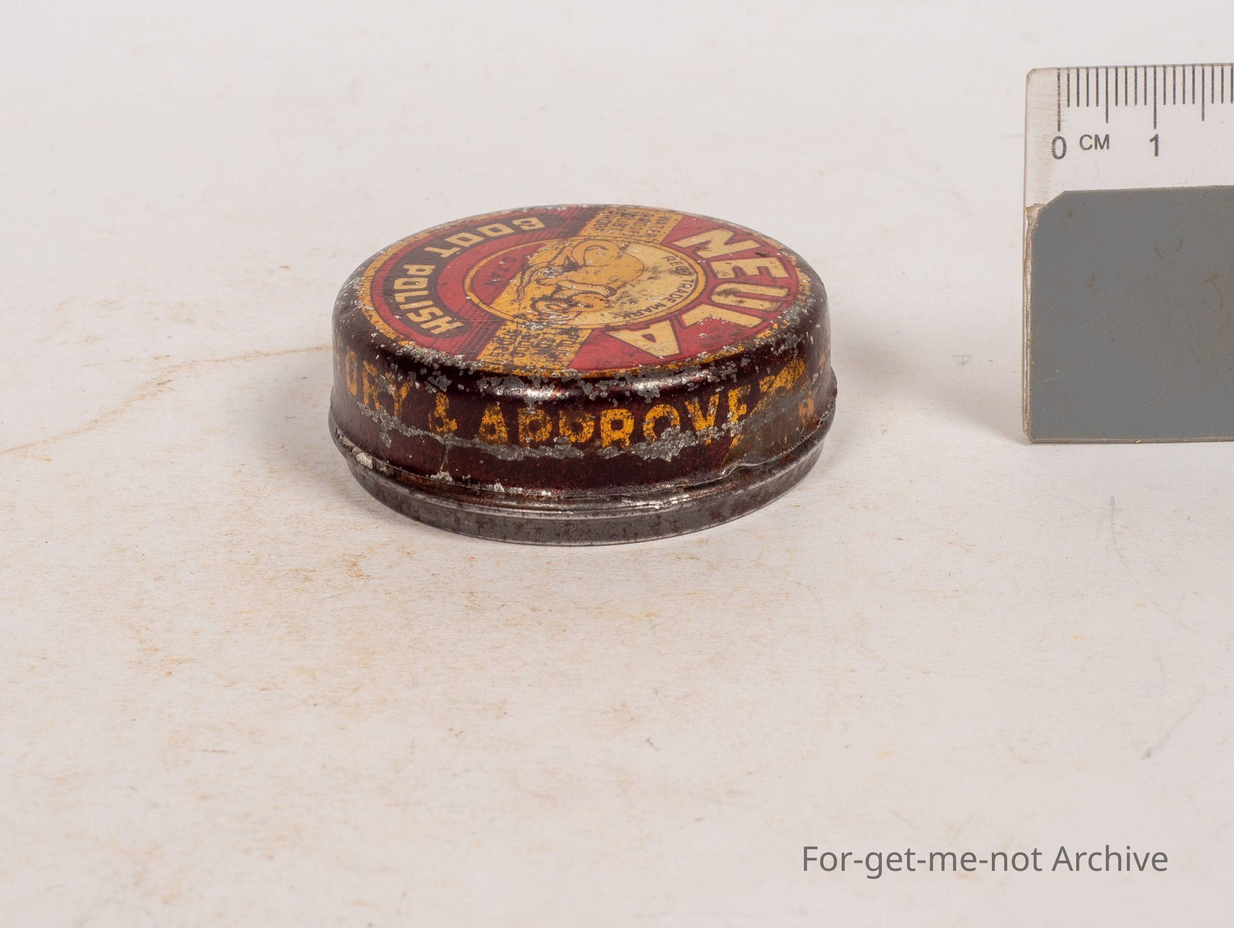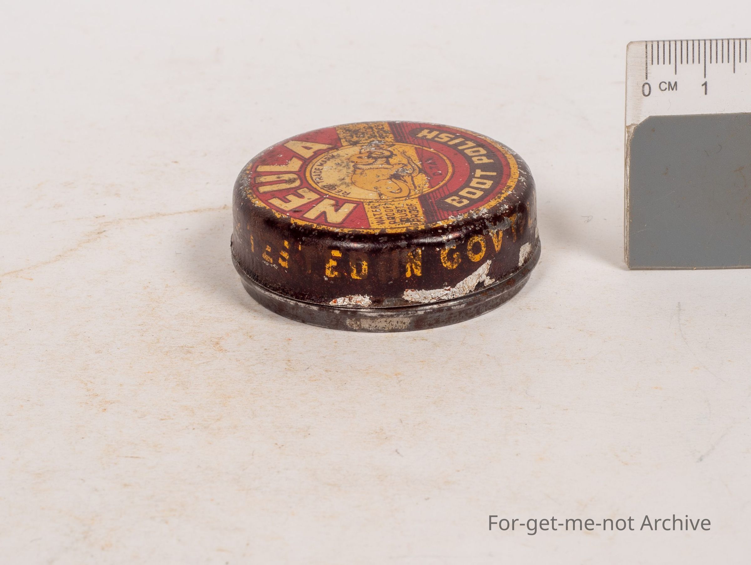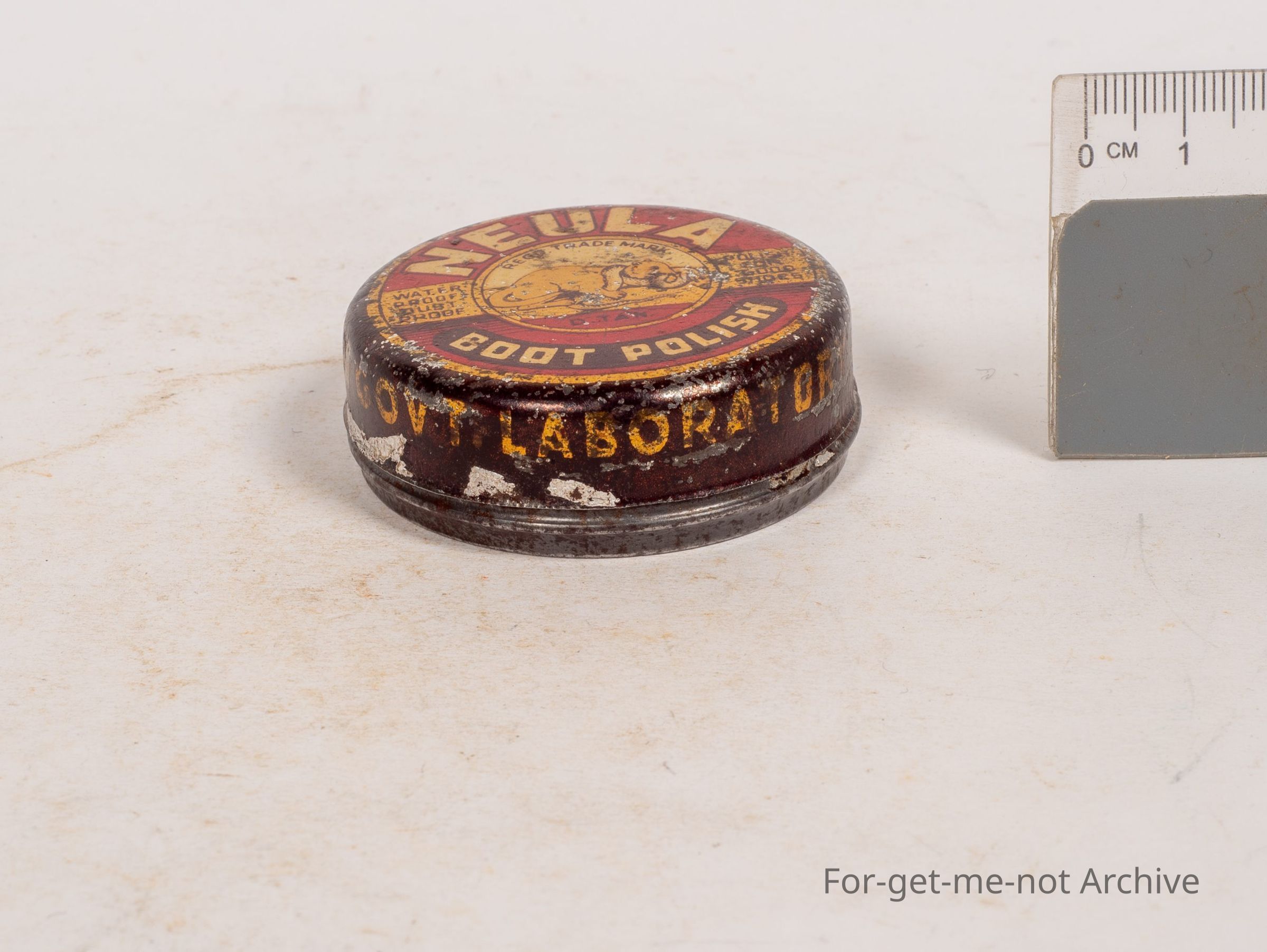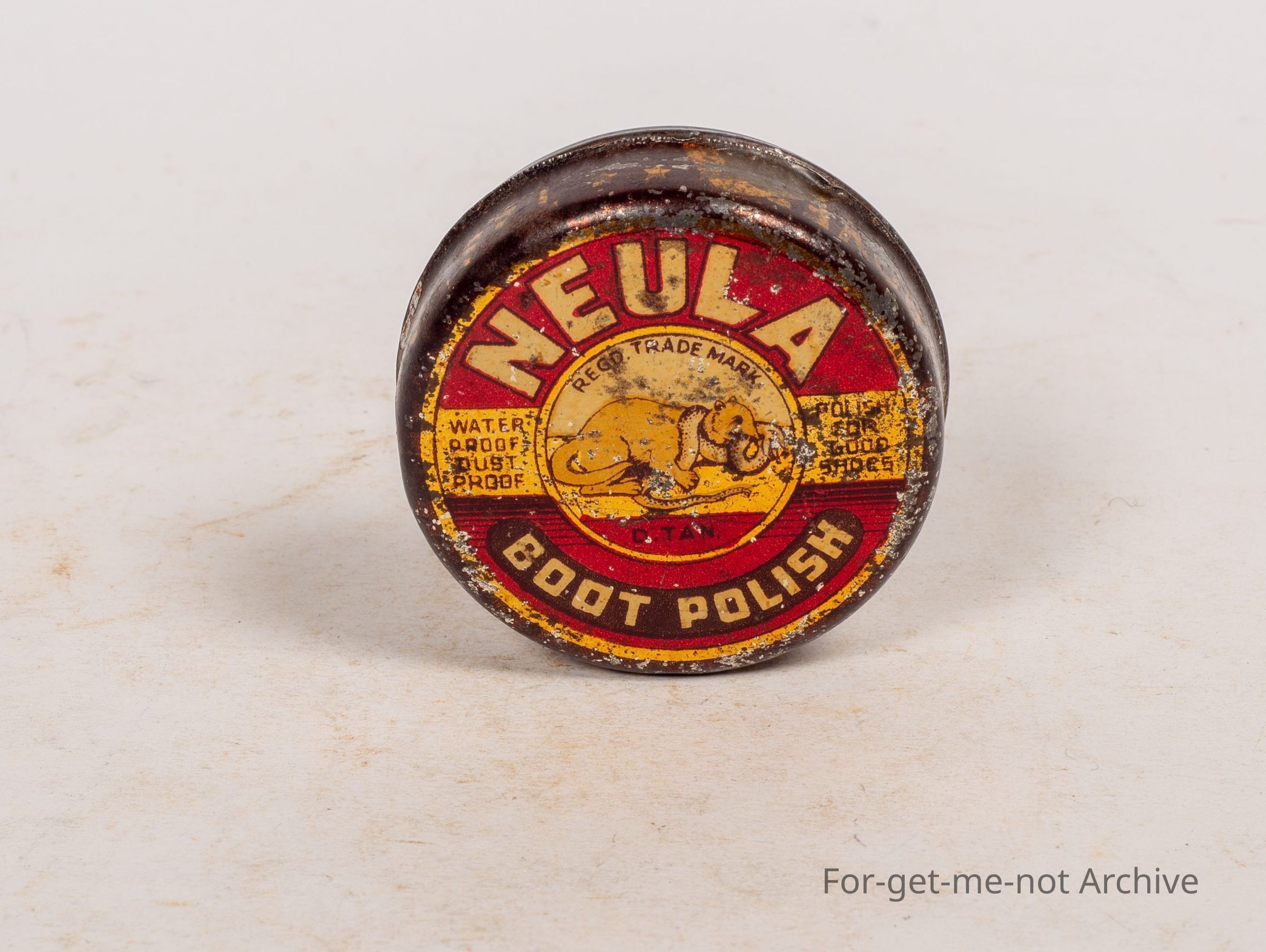 Boot polish tin, only a small tin called Neula, boot polish, dark tan, made in the government laboratory, an image of, some sort of an animal, possibly mongoose, killing a snake. A rare tinCollection