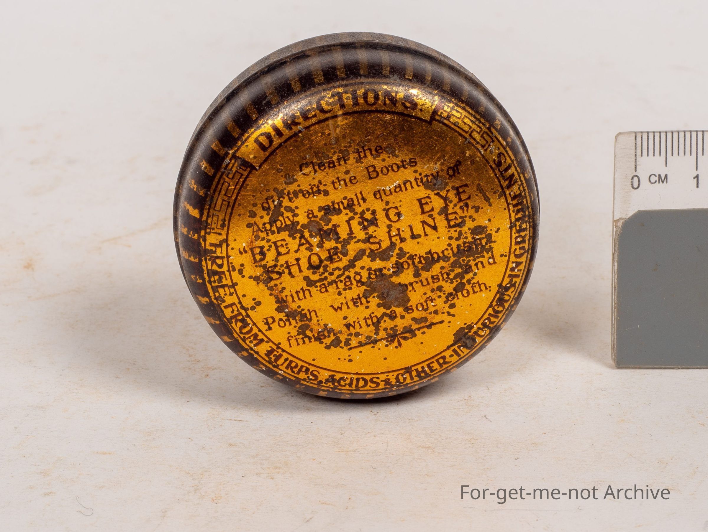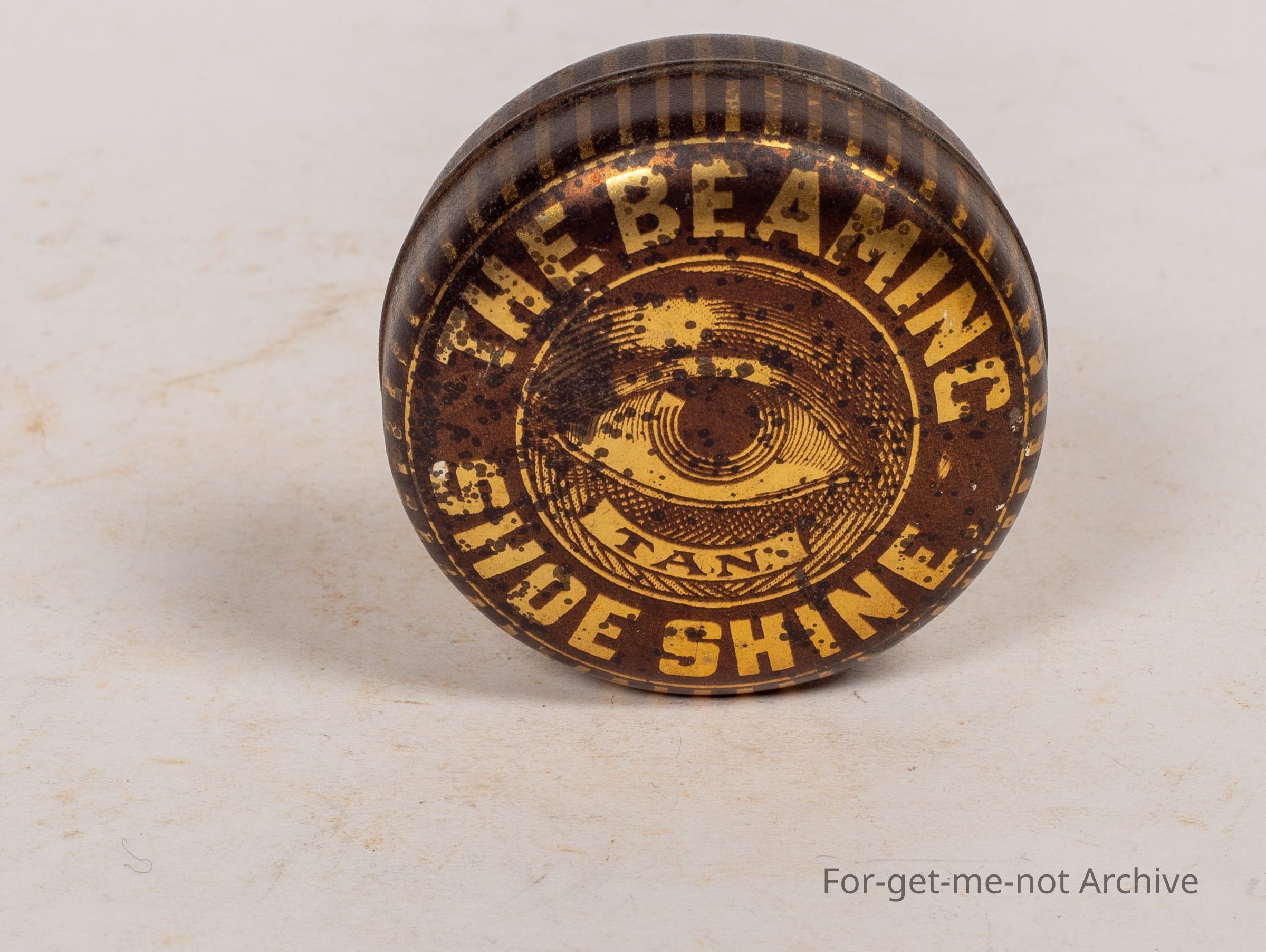 Boot polish tin, the Beaming Shoe Shine tan with an eye image in the middle, Don't say what country, but this is an early tin in pretty good condition, most unusual.