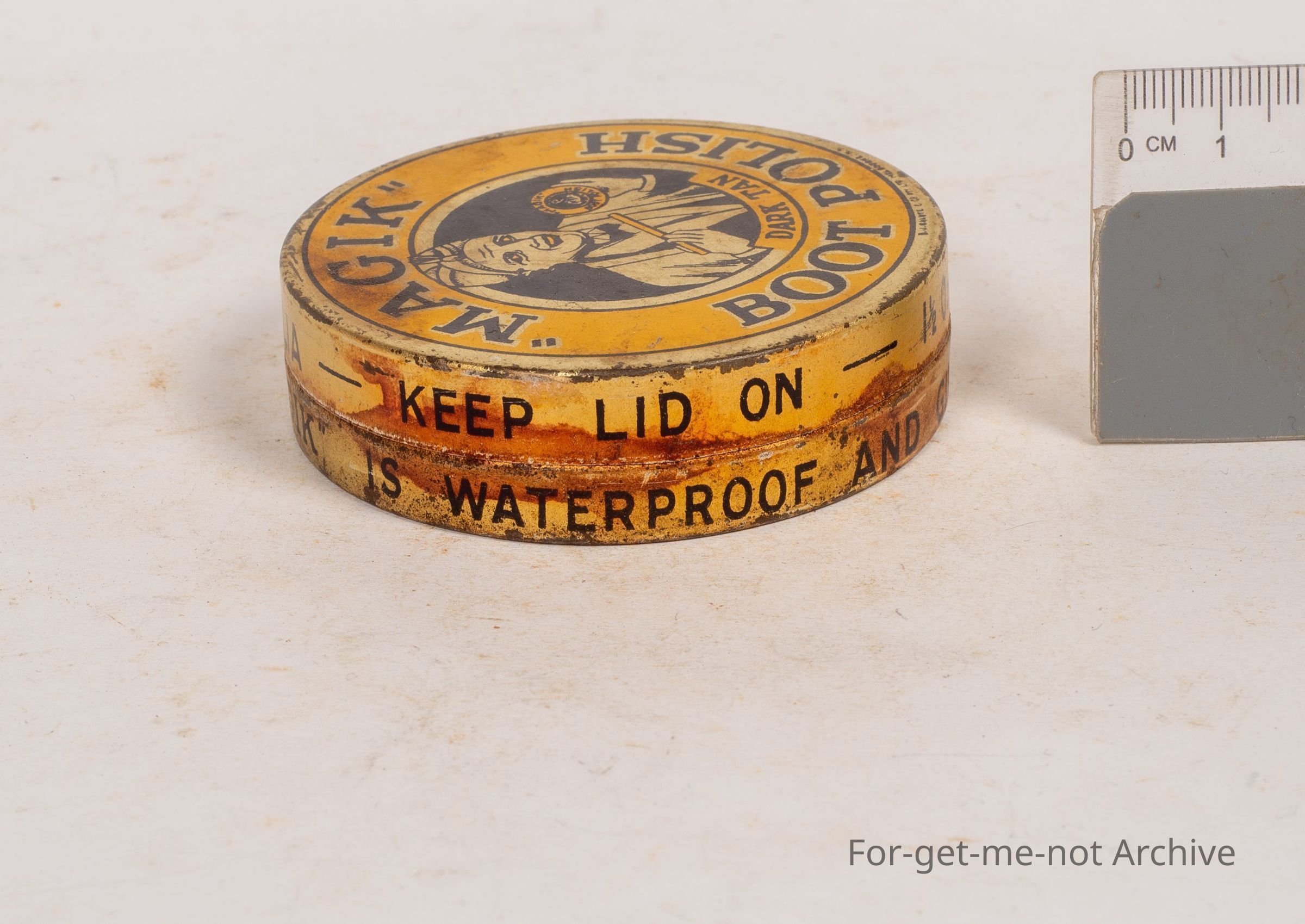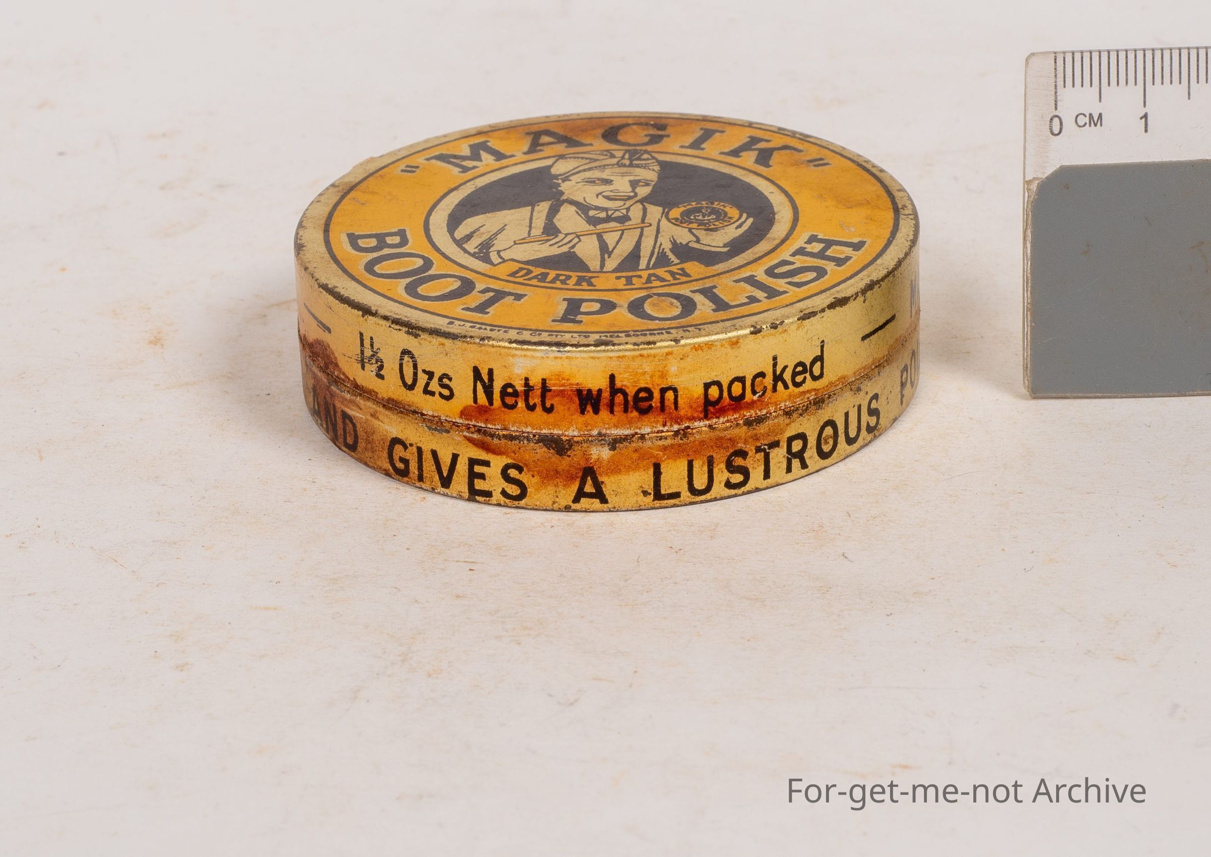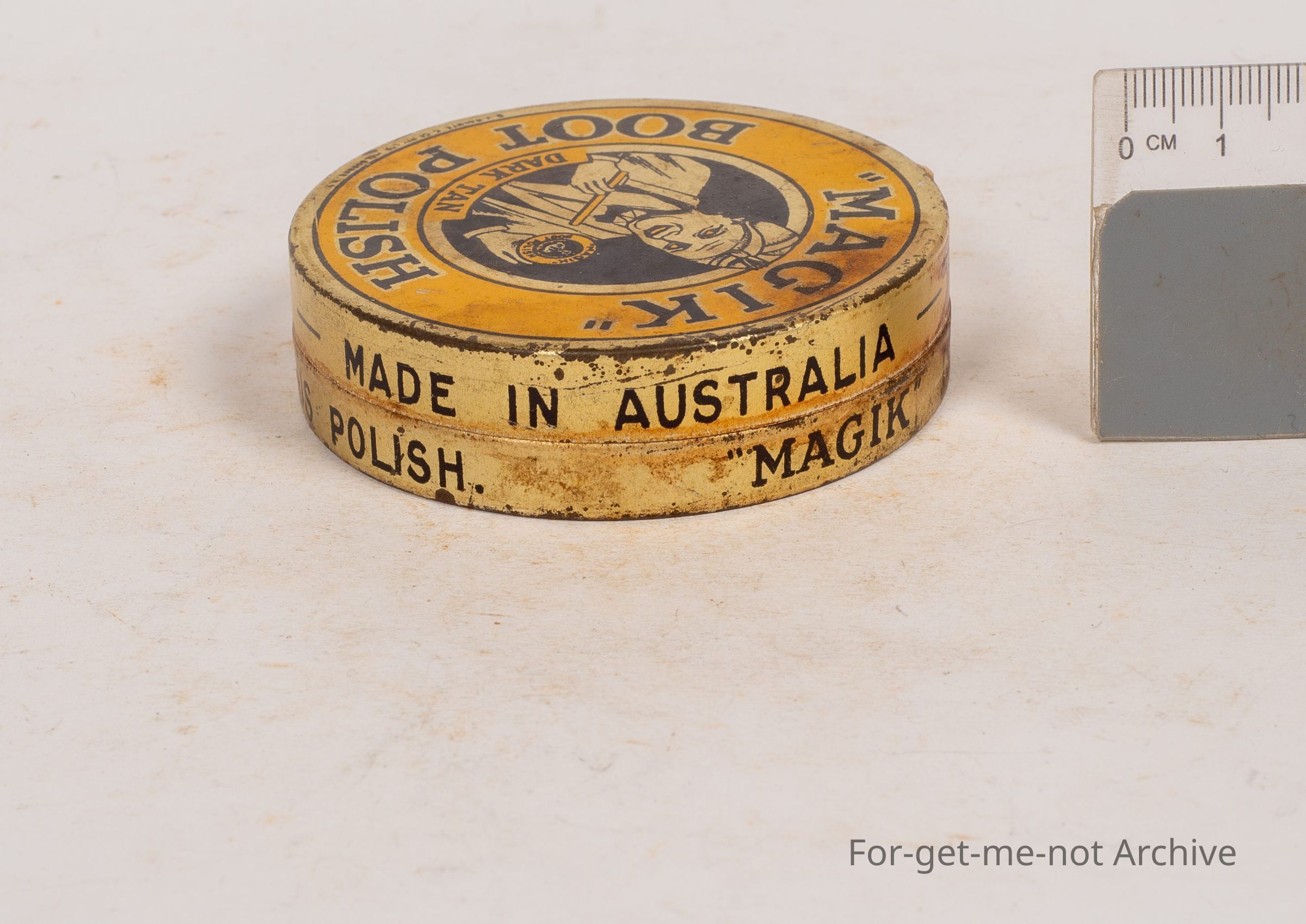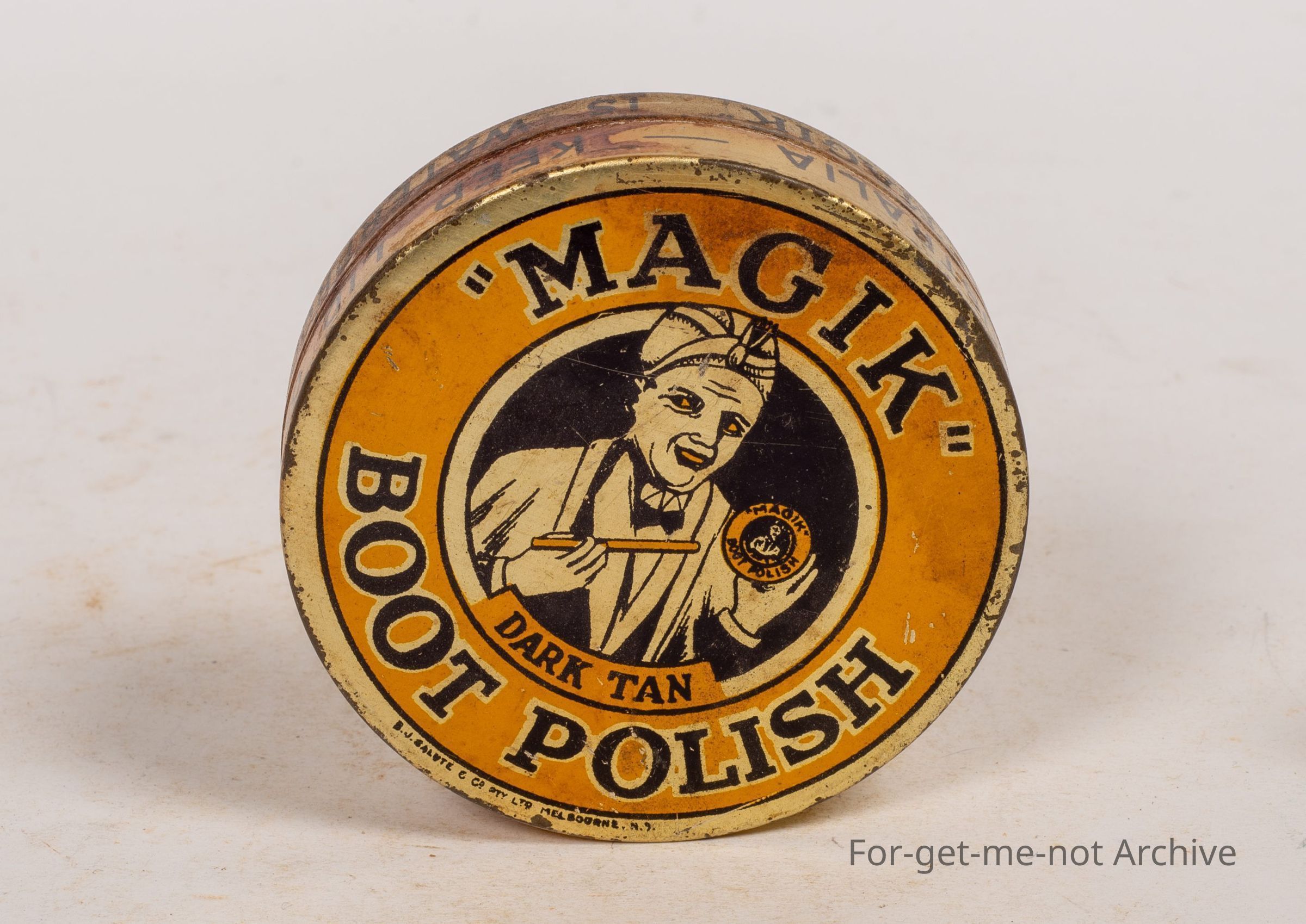"Magik" Boot polish tin, This is a beautiful conditioned early Australian tin, tin made by B J Salute Co. Pty ltd Melbourne. Great graphics. 1 and a half ounce gin. Hard to find one better.Collection