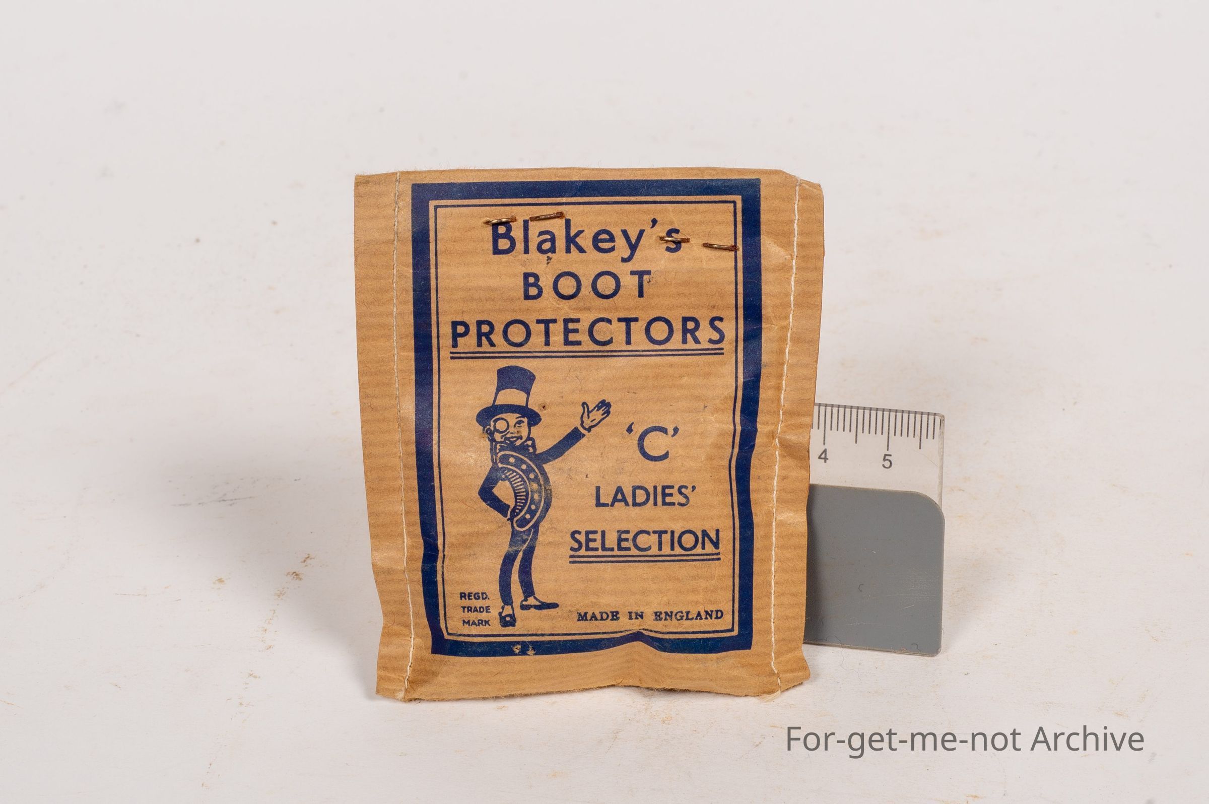 Paper bag of boot protectors, boot protectors. Ladies selection, made in England, image of little man on the front. In very good order, this is made by Blakey's Boot Protectors.Collection