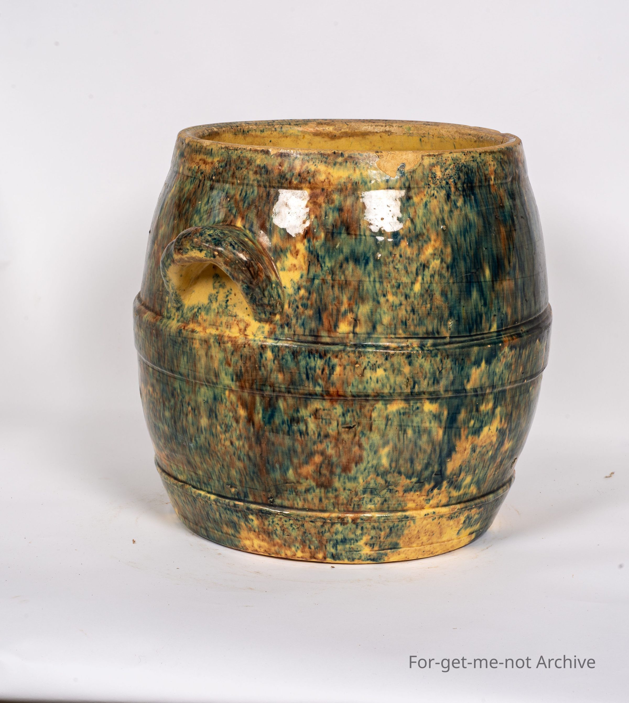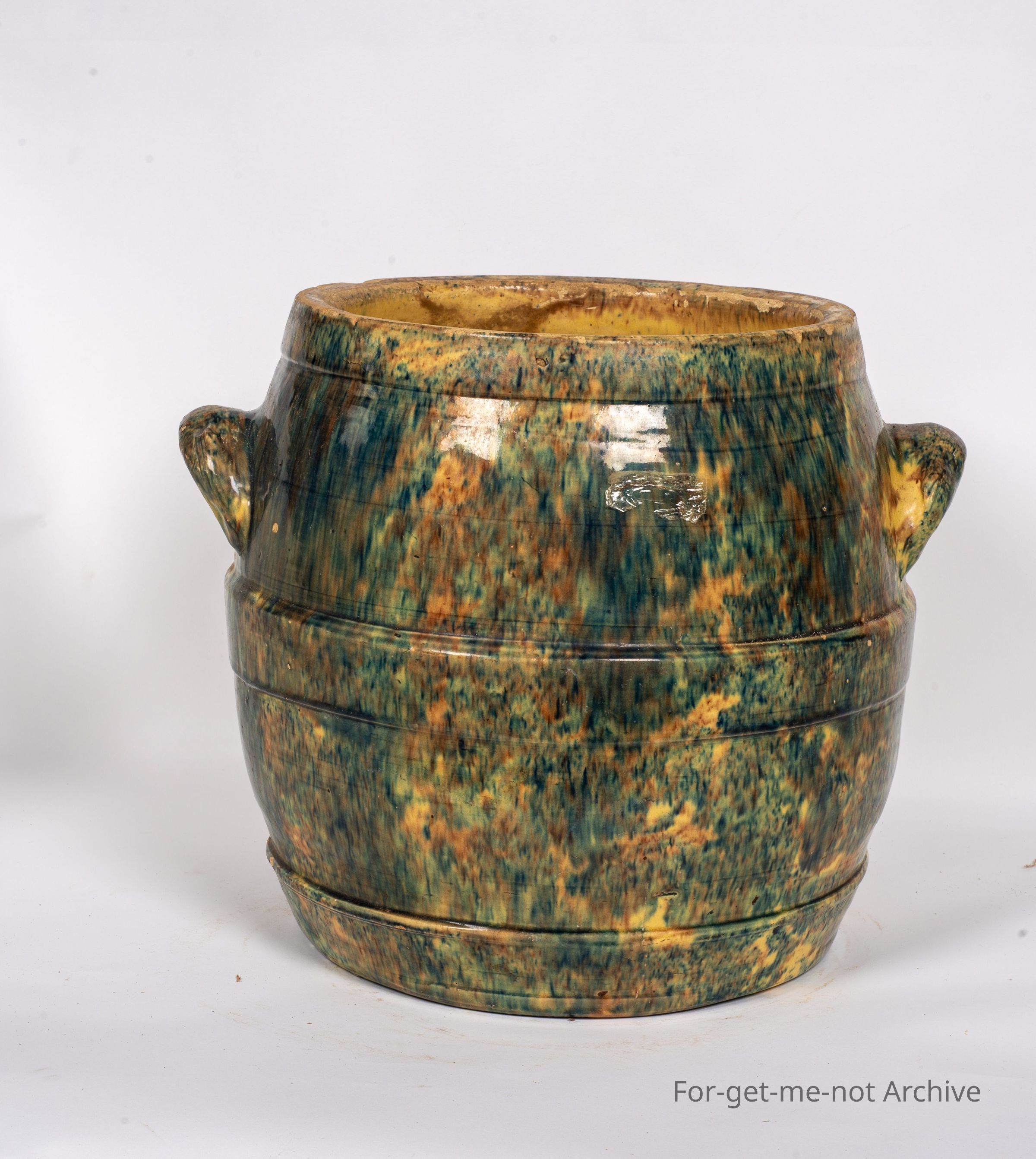 Stoneware category, This is unstamped but heavily attributed to Bosley in South Australia. The very common, majolica type Bosley glaze with yellow, which is very traditional for Bosley on the inside. This piece is in good condition. No chips on the handles. It has been drilled in the bottom with 5 holes to, at some stage, have grown a plant. That certainly detracts from it. Other than that, it's an interesting colourful piece.Collection