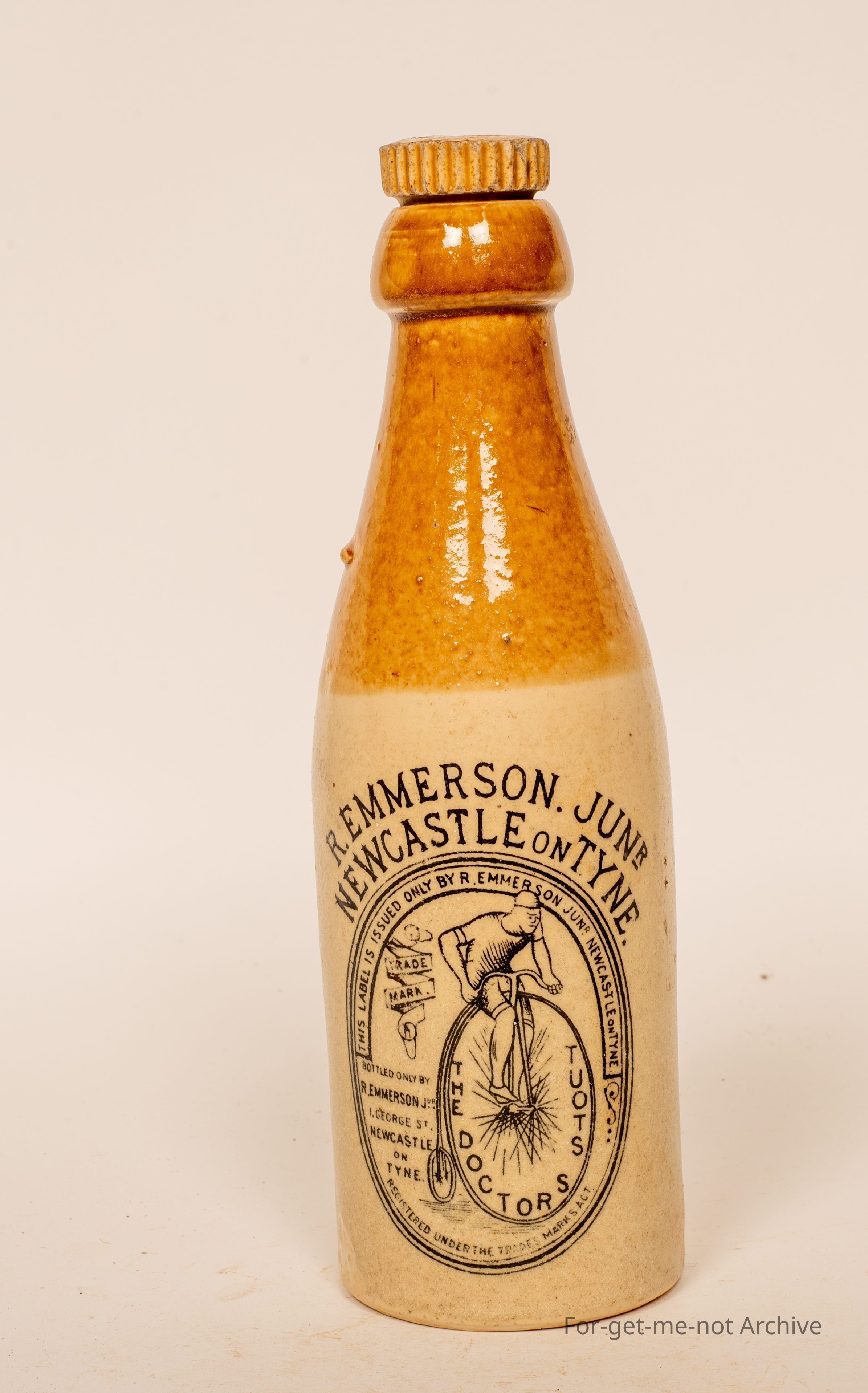 This is a stoneware, bottle. This bike is very popular with Bicycle Collectors because the image on the front is of a rider on a penny farthing push bike. The, image is the Doctor Stout, bottle by Emerson, George Street, Newcastle on Tyne, an English bottle, but a very popular one with bicycle collectors. This bottle is in very, very good condition.Collection