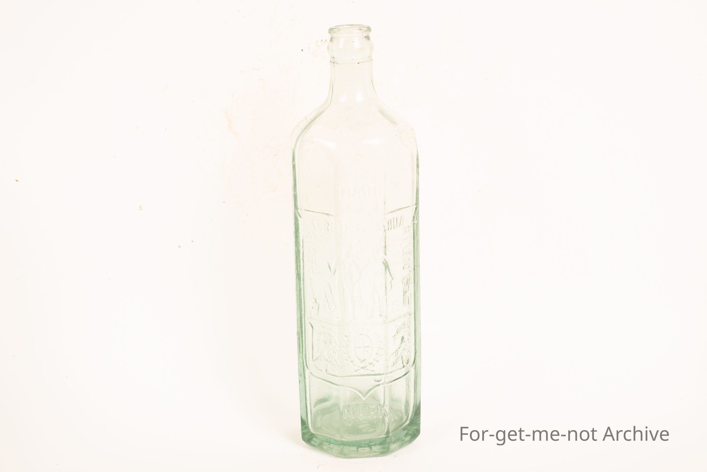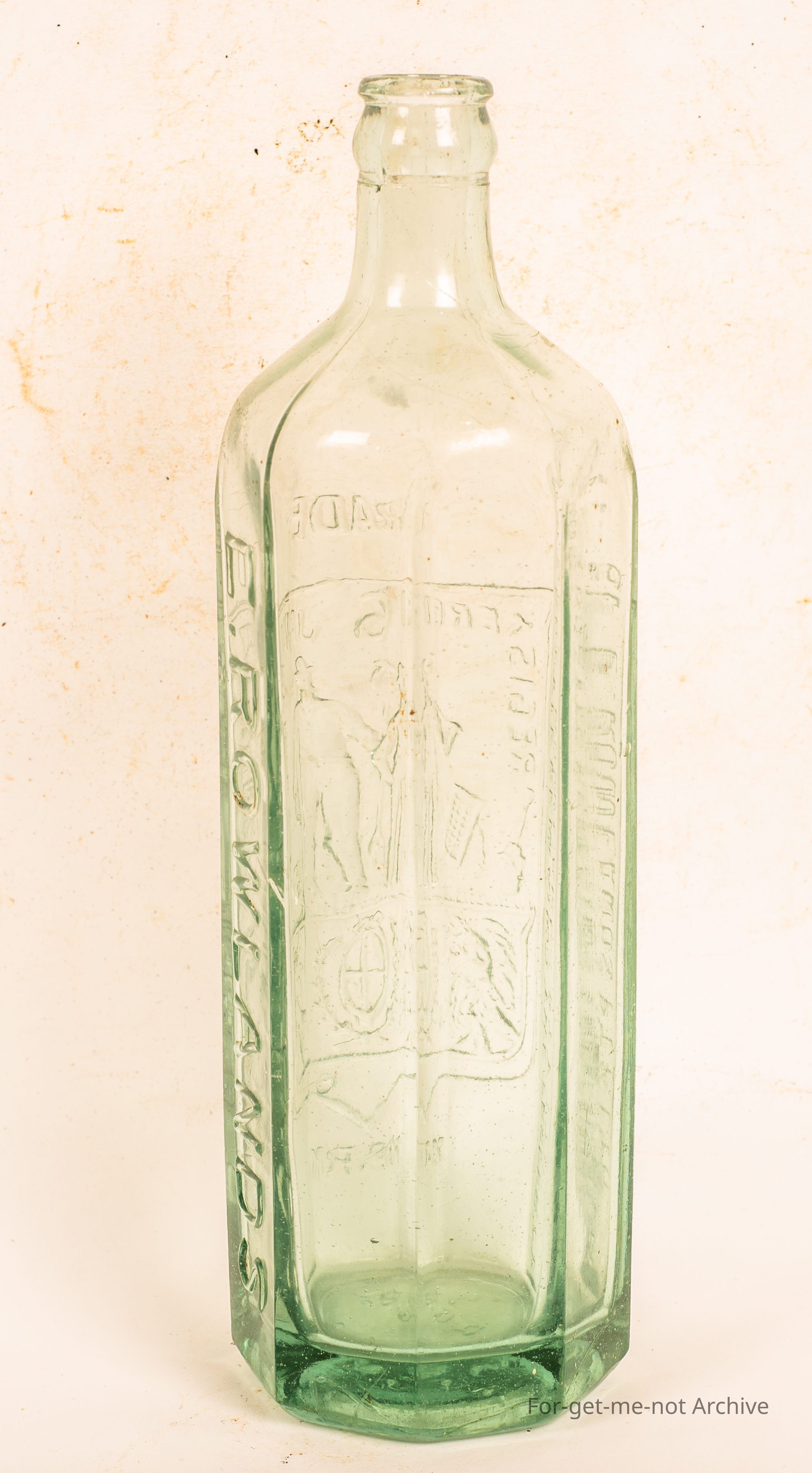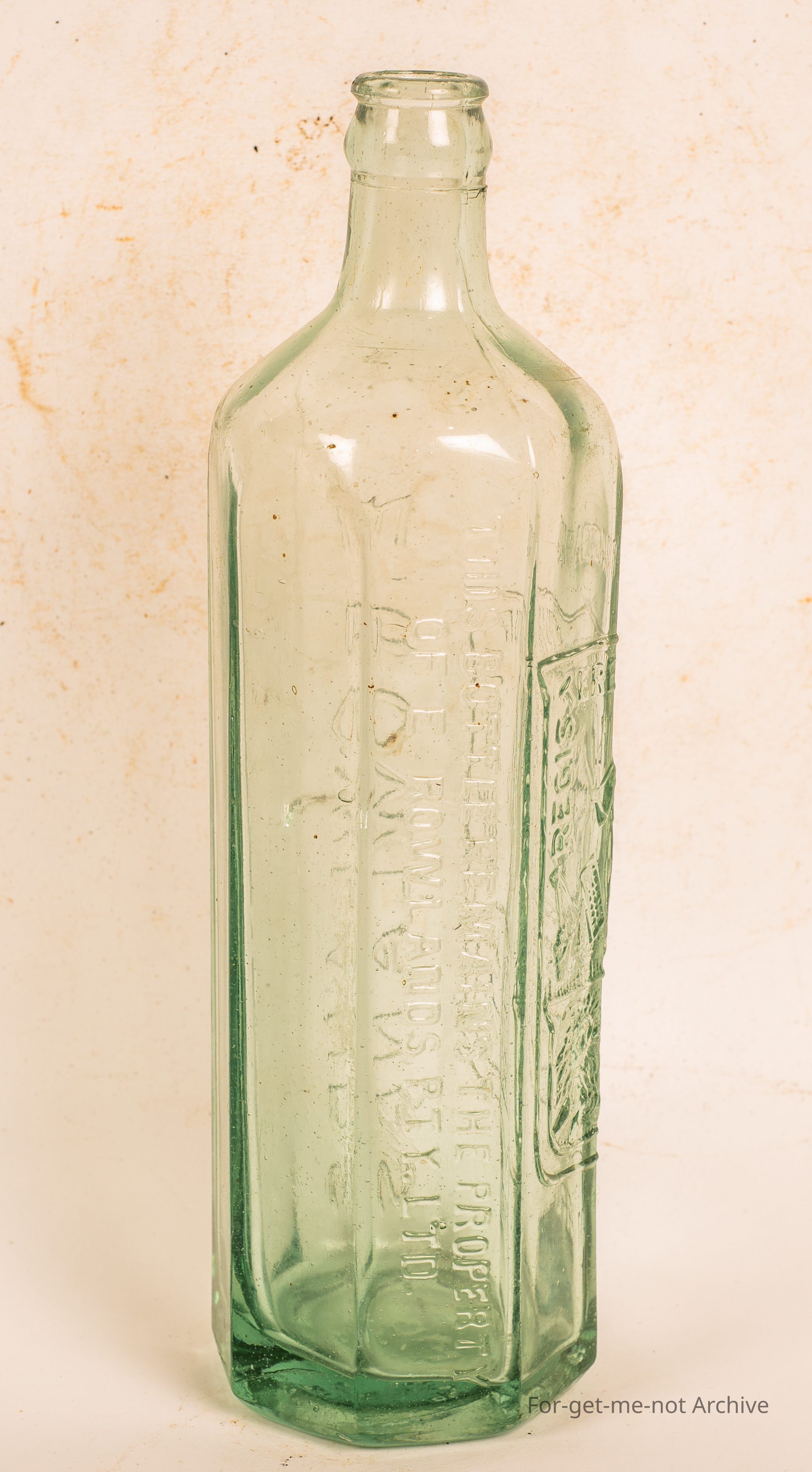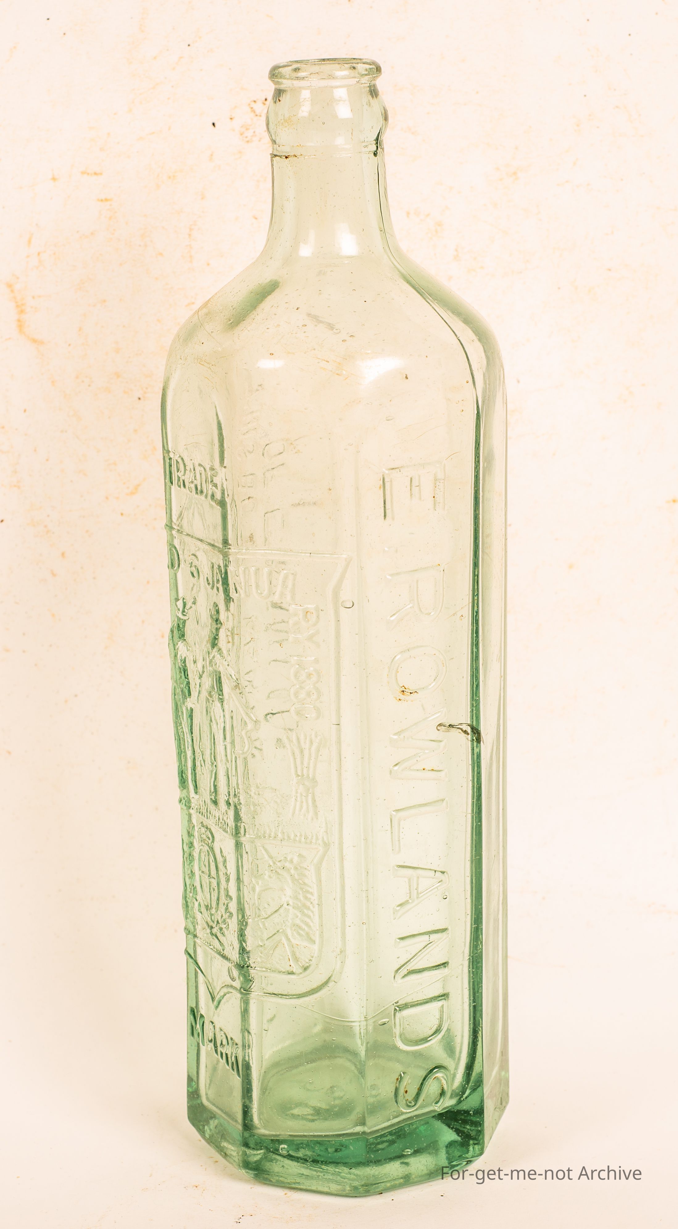 Believed to be a cordial bottle from E Rowlands . Flat sided with farmer and liner pictorial on the front. Crown seal,