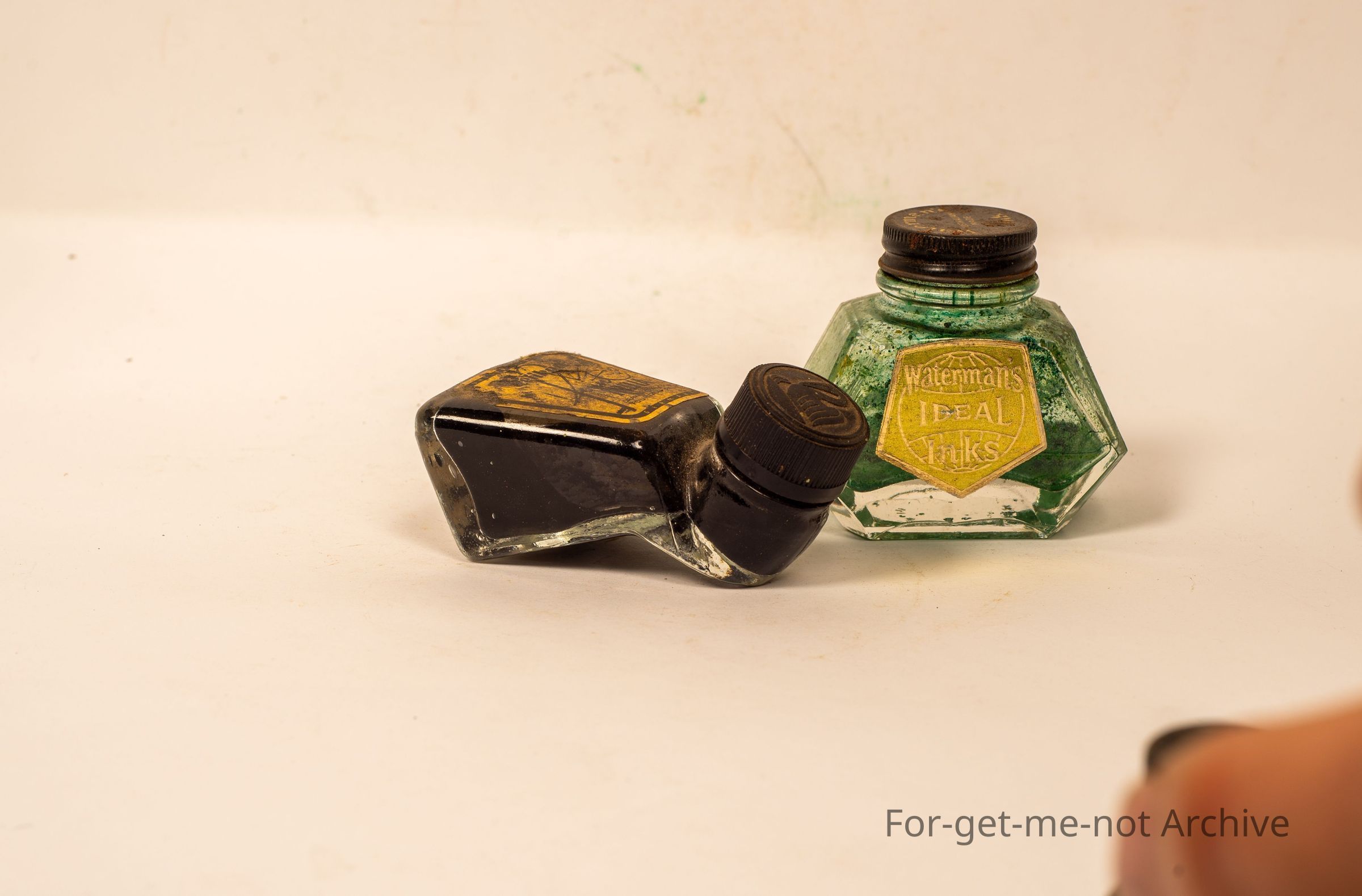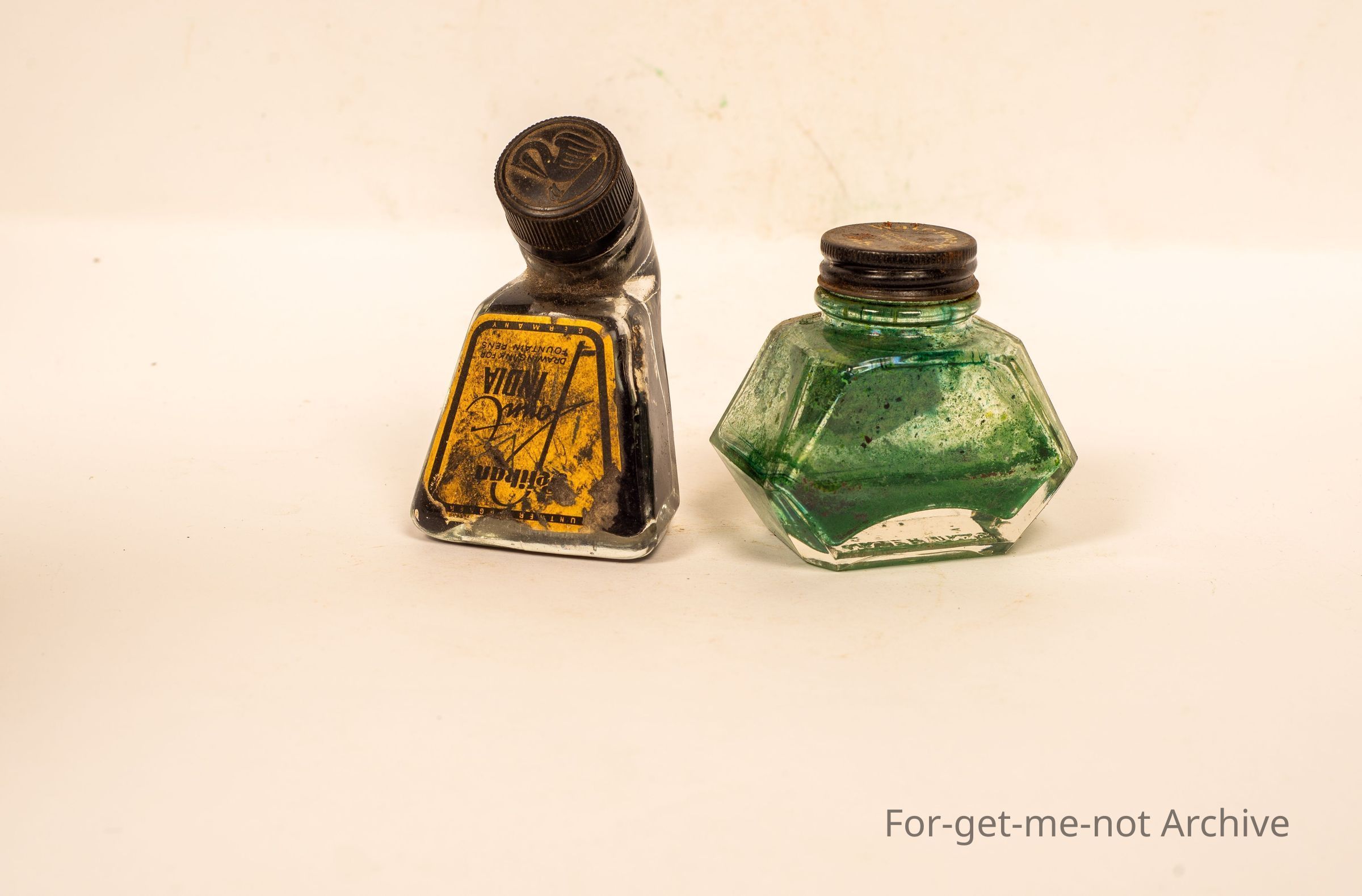 Two glass ink bottles of different shapes. 1 for the use of putting a nib straight into it.
