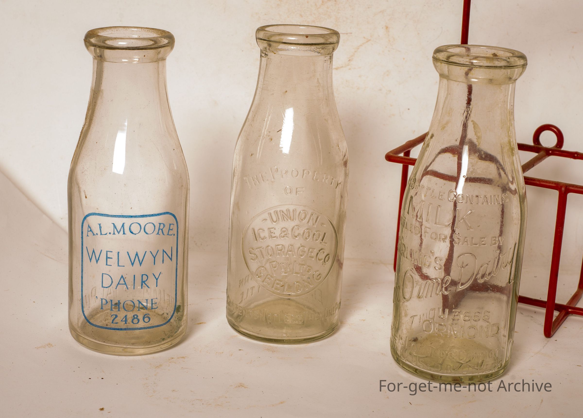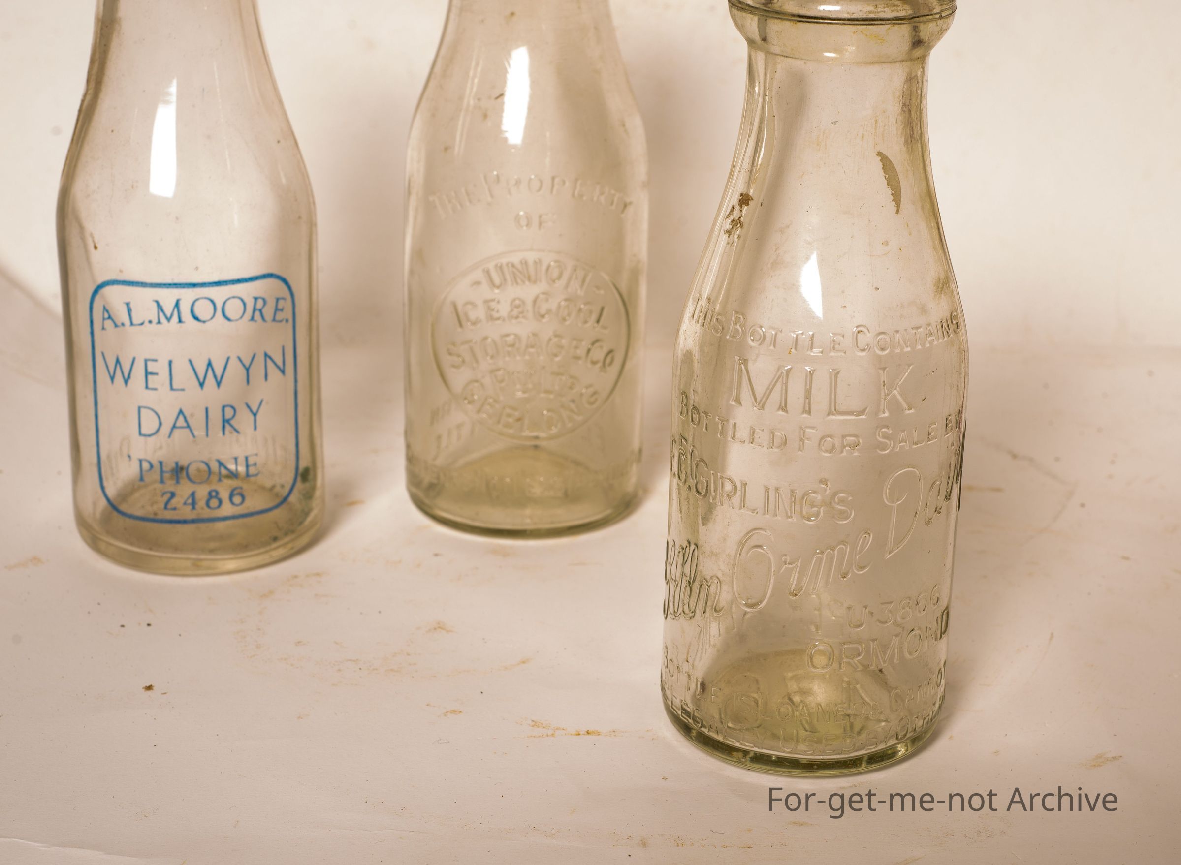 Early glass milk bottles. These are the bottles with the broad, opening that had a cardboard sleeve in. First one from the Union Ice and Cool Storage Geelong. Next one, a l Moore, Whirlwind Dairy. 3rd one from Glenn. Glen Orang Dairy, Ormond, in a little plastic carry case.Collection