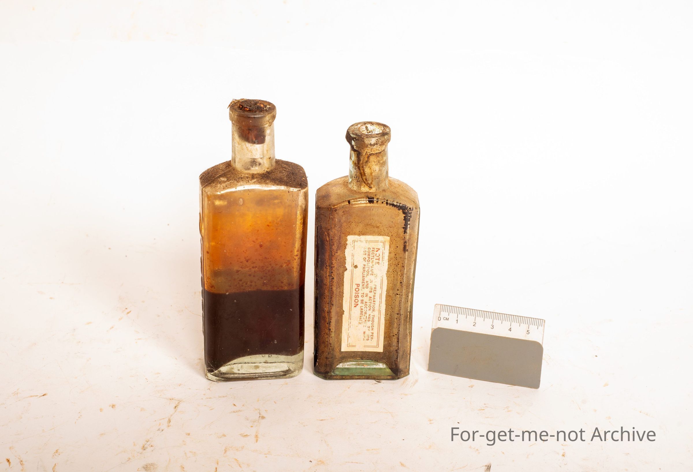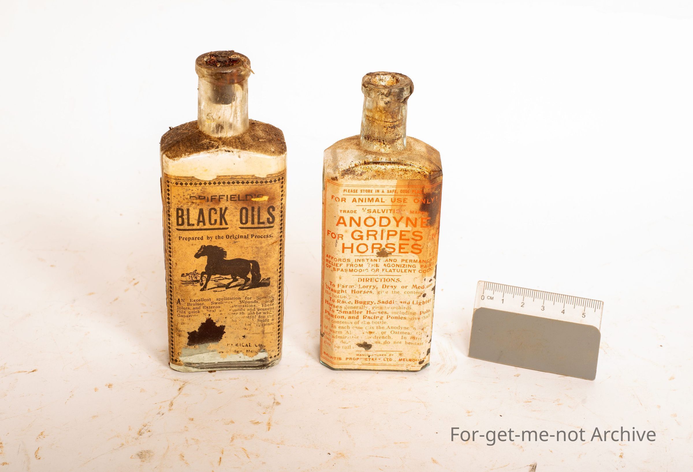 2 bottles of anodyne for gripes in horses and black oils, another horse treatment. Both labels down a bit, but very early bottles. Interesting bottles,