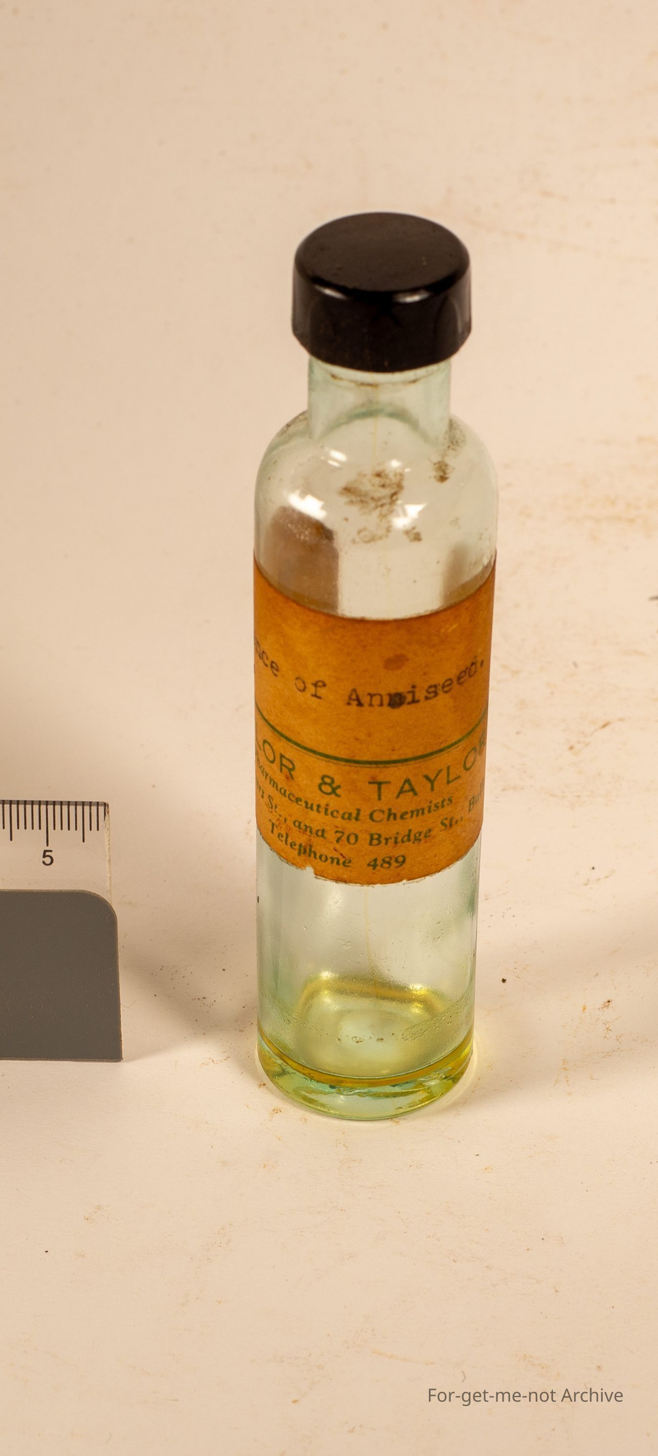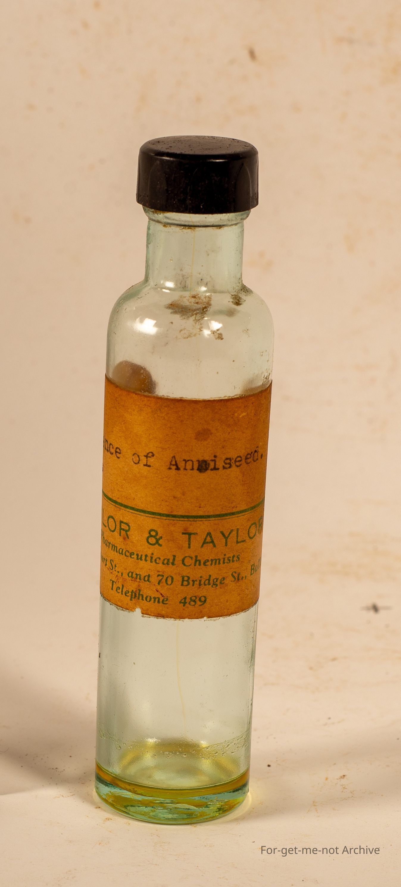 Tall cylindrical bottle from Taylor and Taylor, chemist Ballarat, for Aniseed oil.