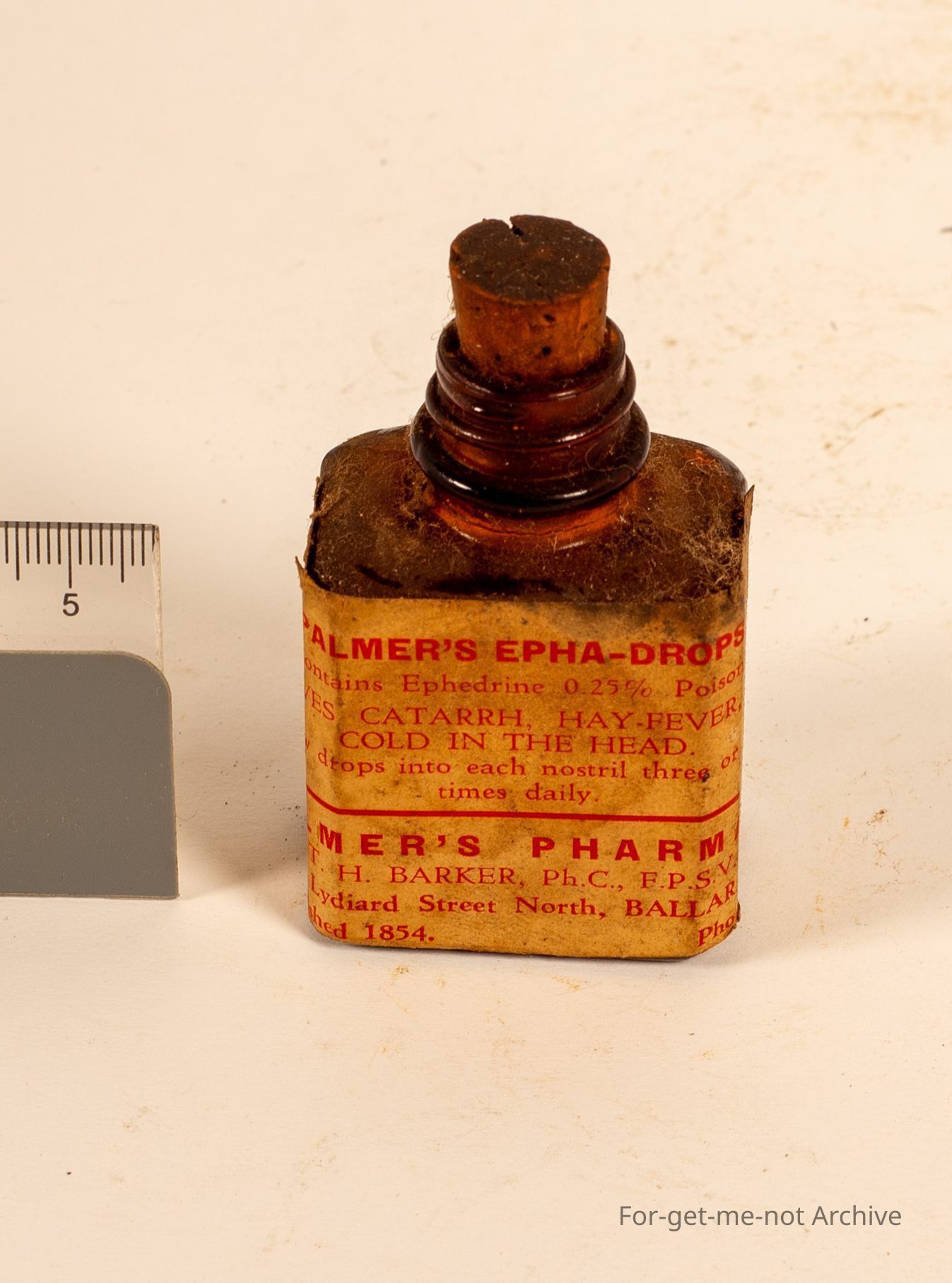 Squat rectangular bottle from A M Palmer, Chemist Ballarat, still with label for EPHA drops. For cold and hayfever