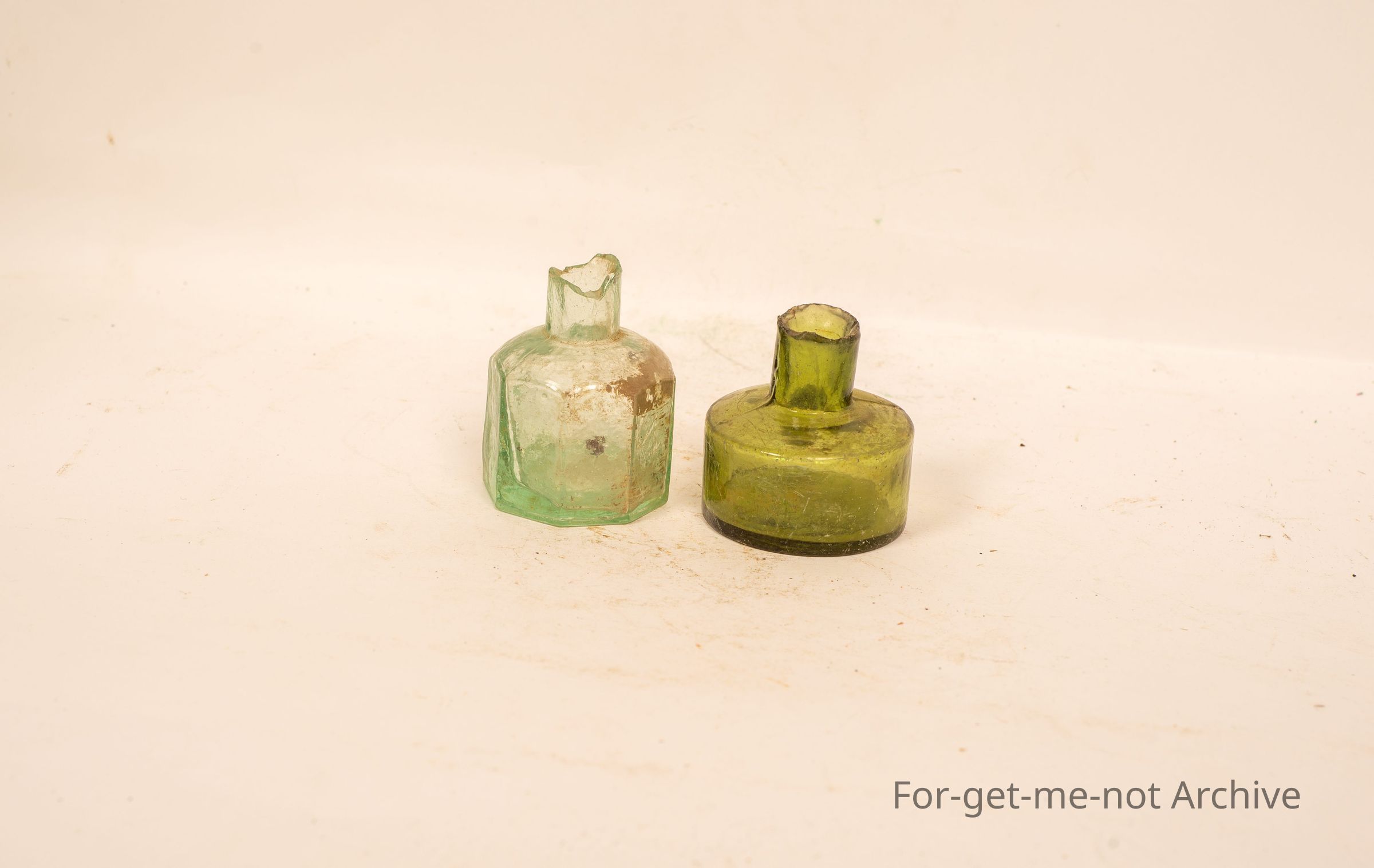 2 early snap top glass ink bottles of different shapes.