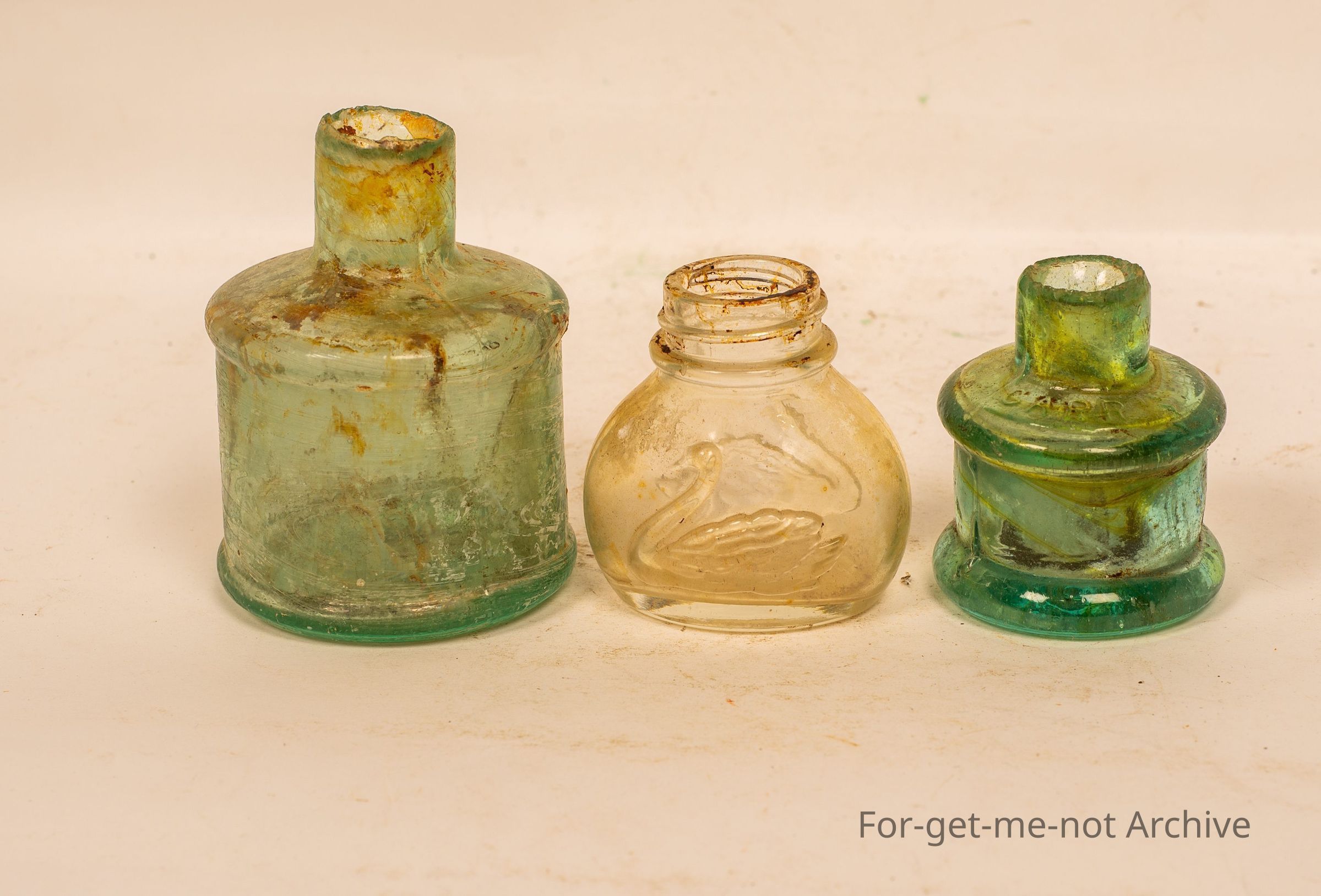 A group of 3 glass ink bottles, Oh, now