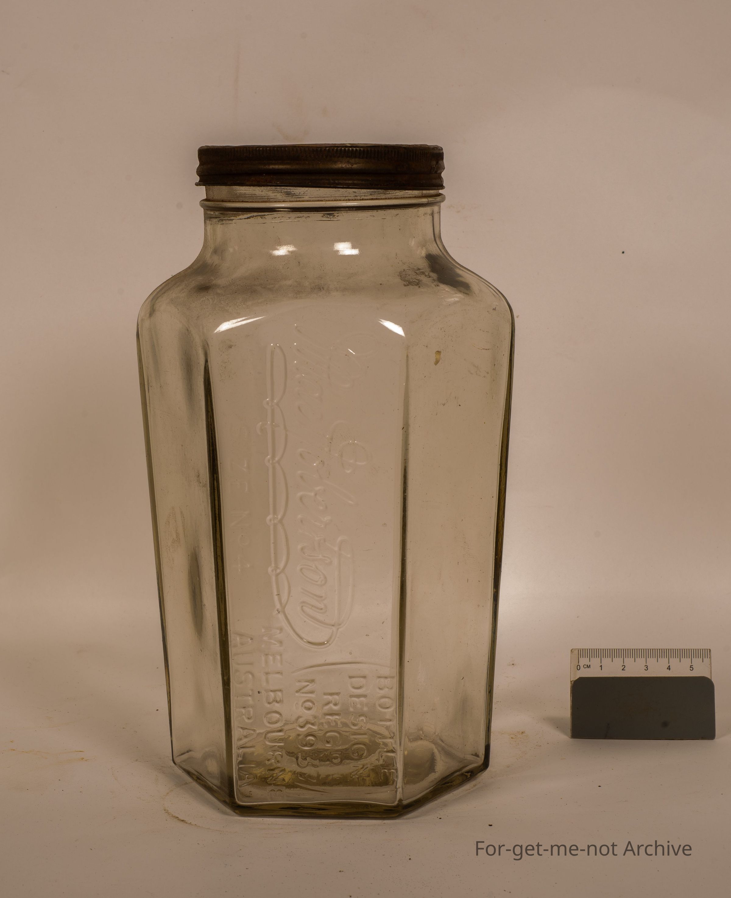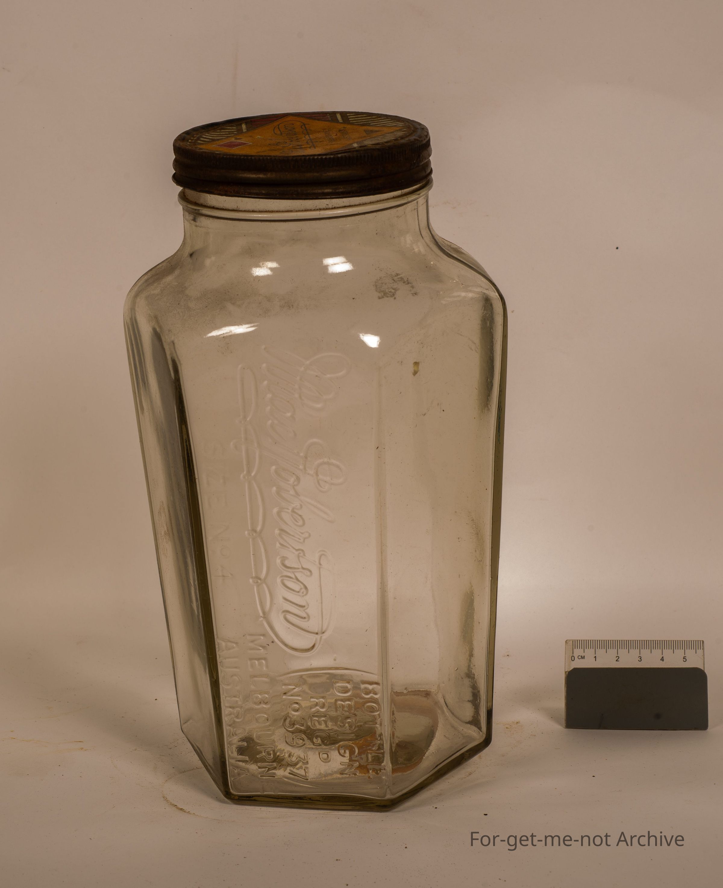 Large jar of sweets. This is the Mac Robinson size number 4. Bottle design registered. Melbourne, Australia. Has a lovely original lid, very clean with Mac Robinson, Melbourne, Australia on the top.Collection