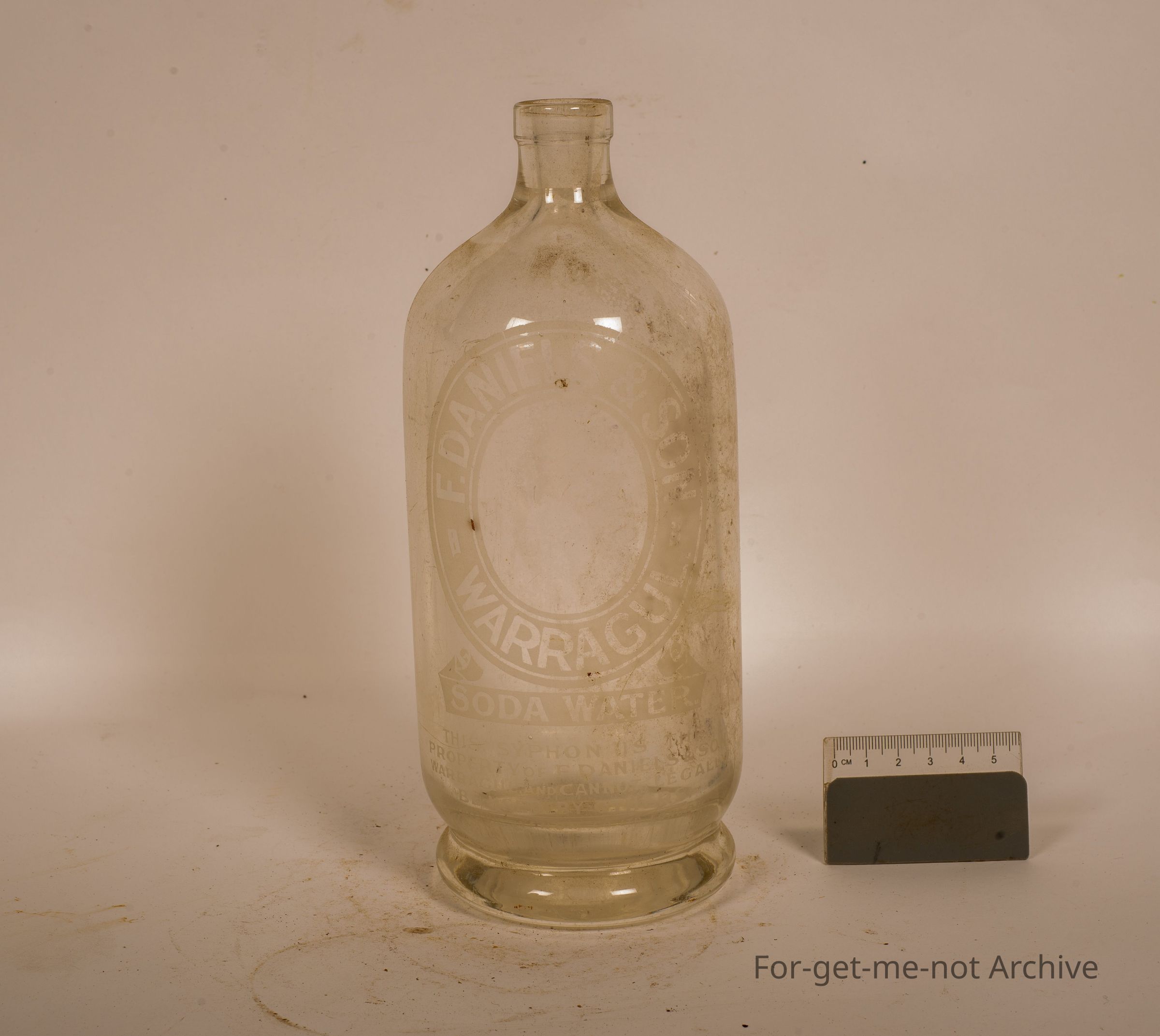 soda siphon bottles. this one is it's E. Daniels and Son, Warragul soda water. This one is a factory filled one without the top mechanism, just the bottle on its own.