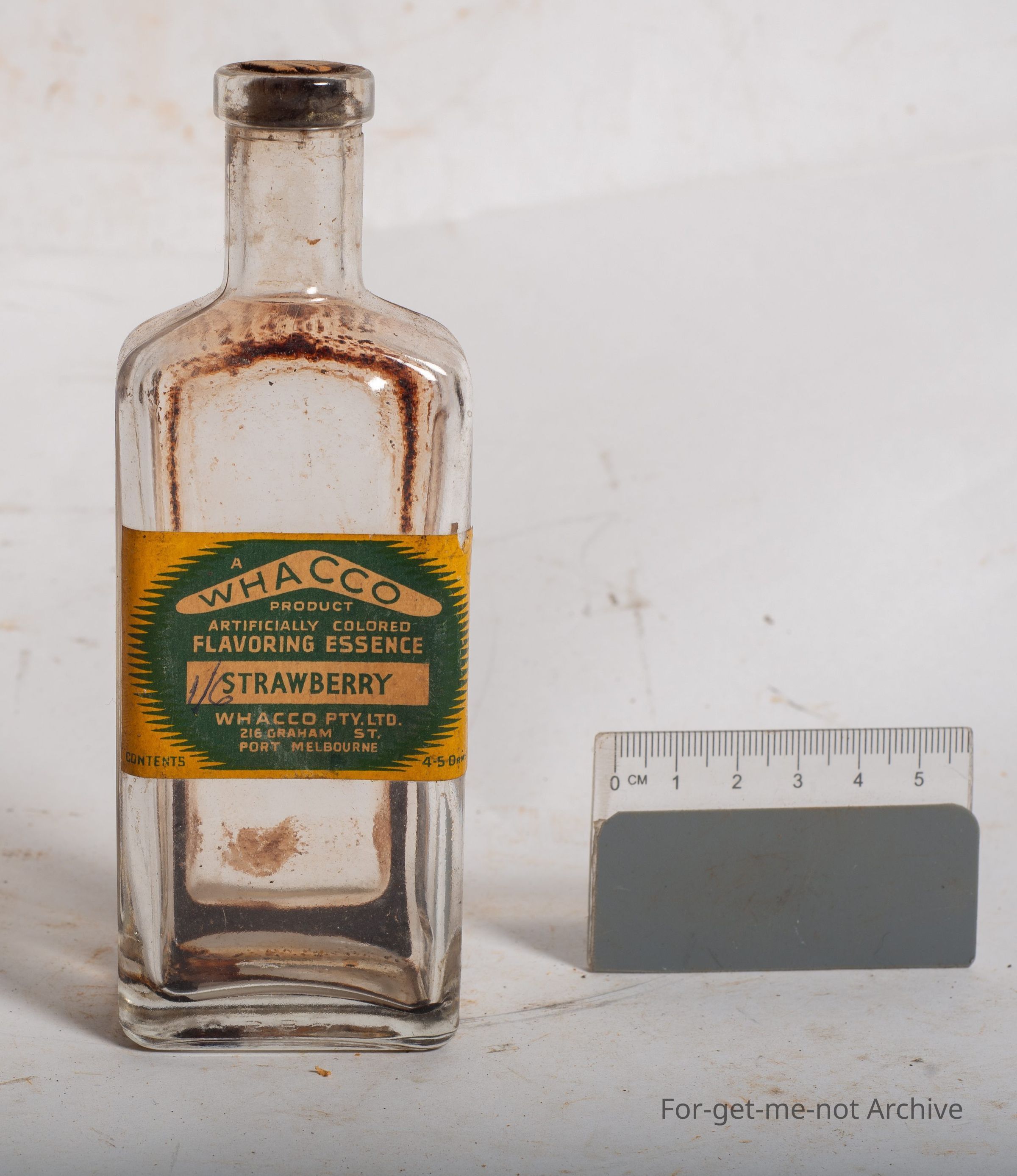 This is a glass bottle from the Whacco Company. Flavouring essence, strawberry, packed by, Whacco, Graham Street, Port Melbourne. The aboriginal image has gone from this one. The rest in very good condition. Still a rare bottle,Collection