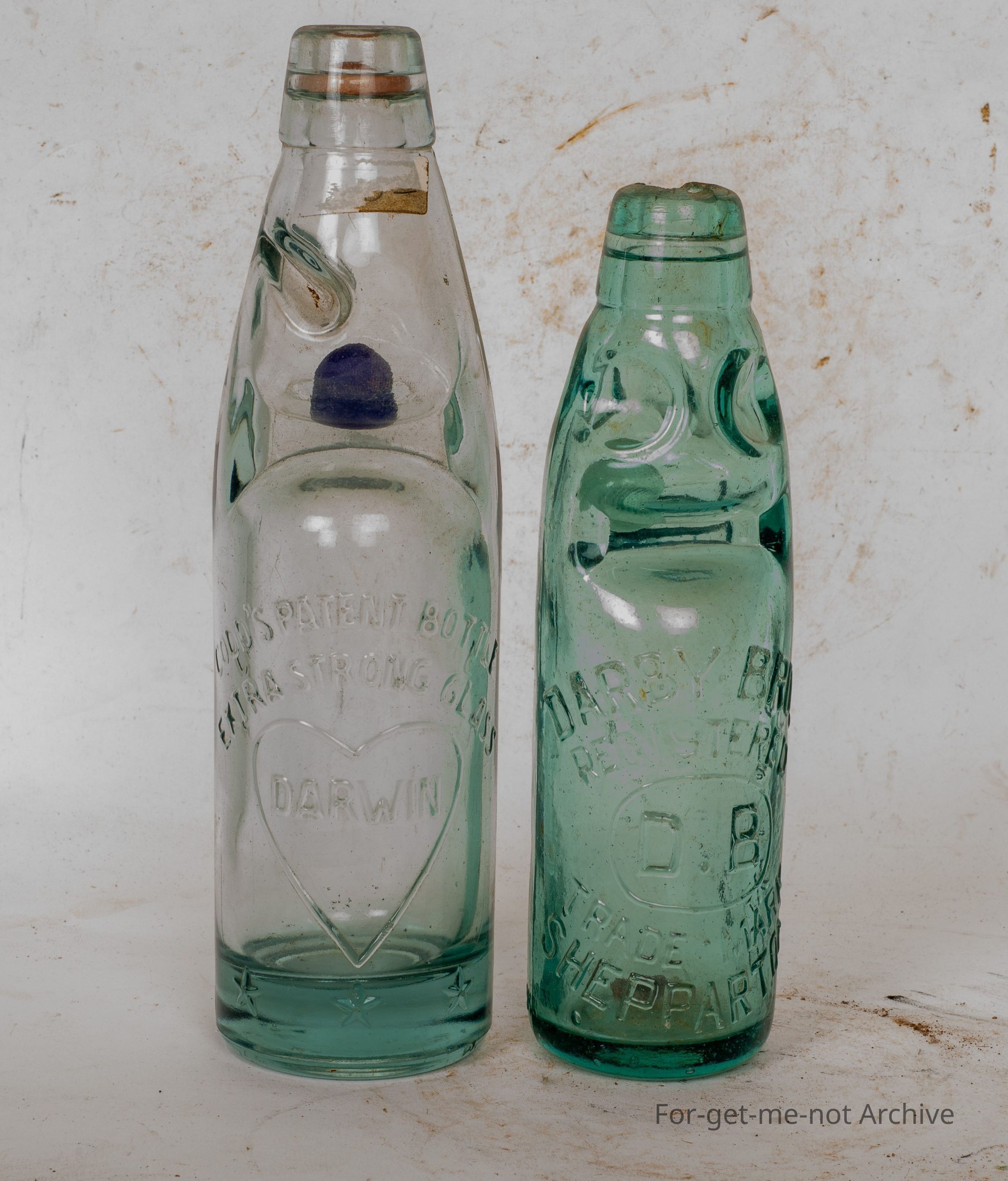 This is a bottle from Derby Brothers, Shepparton, and the other one says cogs patent bottle, extra strong glass. It has a heart with Darwin on it.