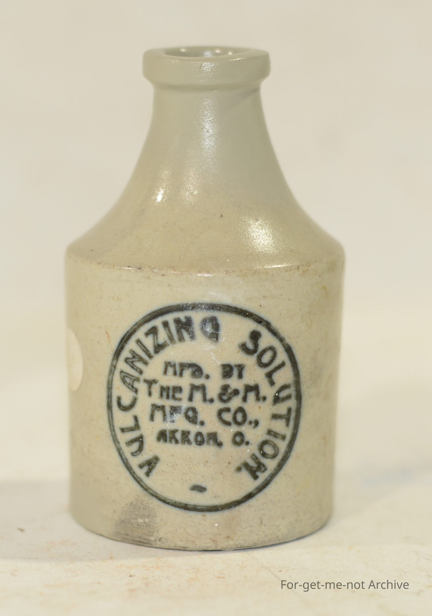 Small ceramic bottle of "vulcanizing Solution" The M&M manufacturing Co.