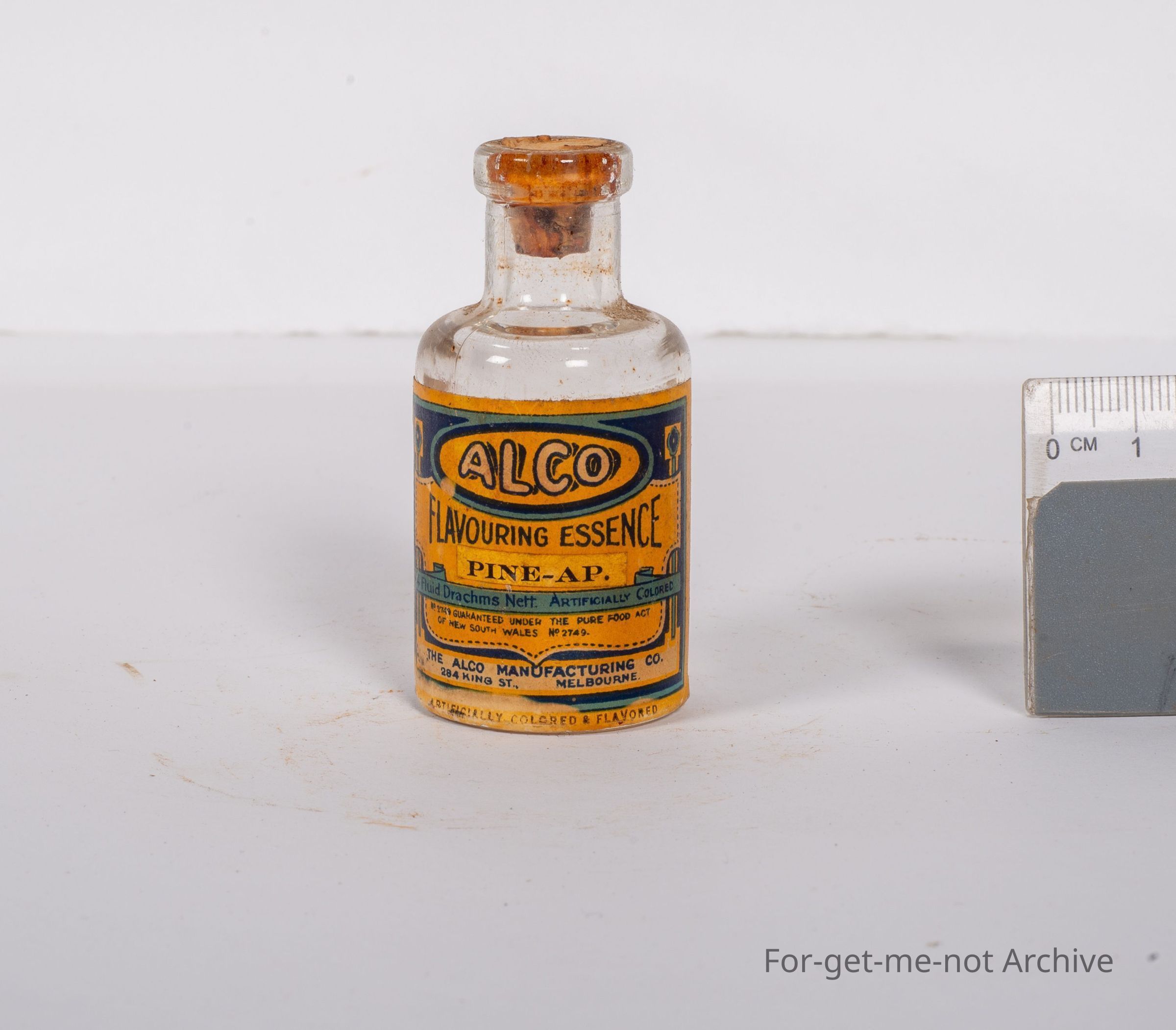 Small bottle of Alco flavouring essence for Pineapple. Packed in King Street, Melbourne. This would be quite early still with its original label and cork. Lovely condition.Collection
