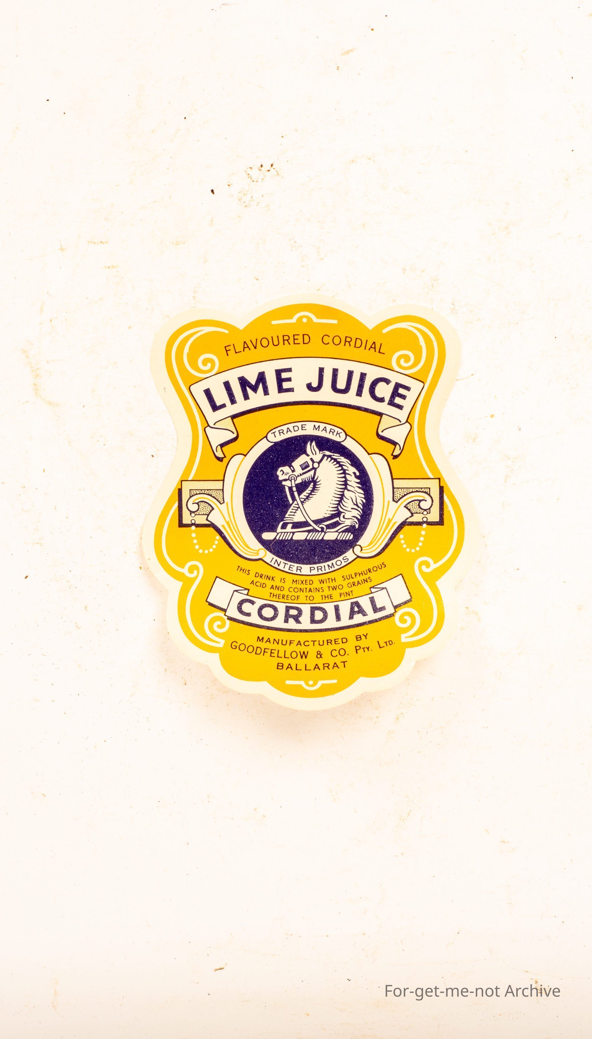 Label from bottle Goodfellows Ballarat. This time lime juice cordial yellow colour.