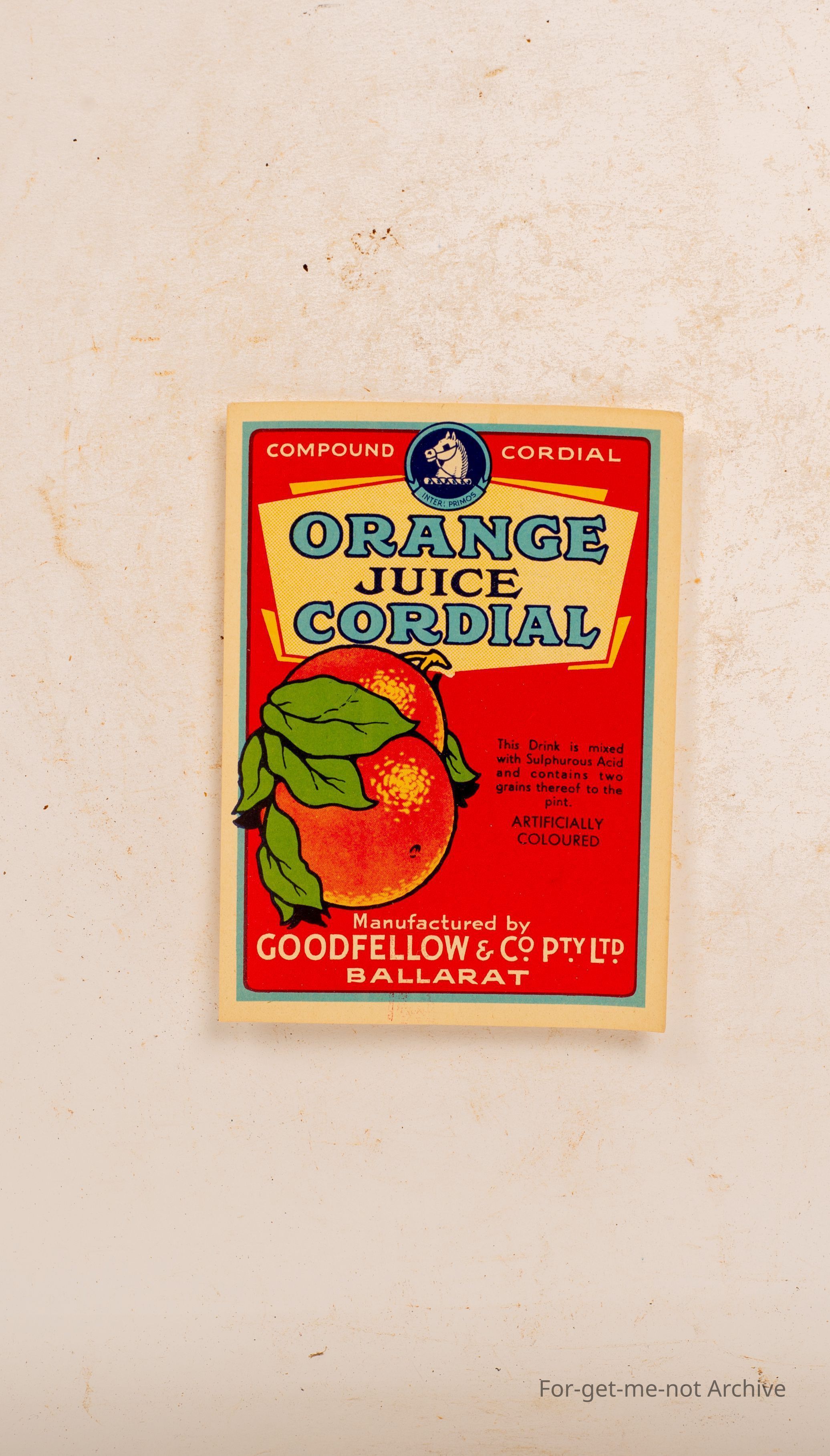Another bottle label from Goodfellow Ballarat. This time Orange Juice Cordial